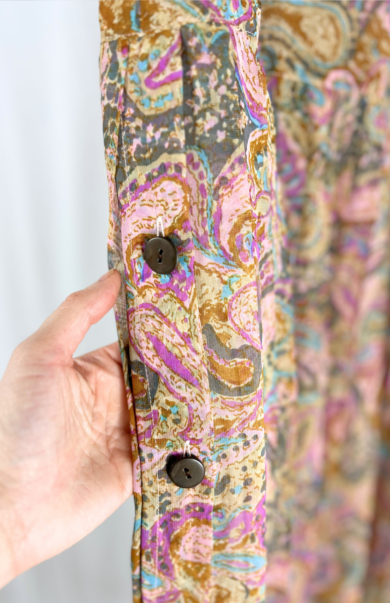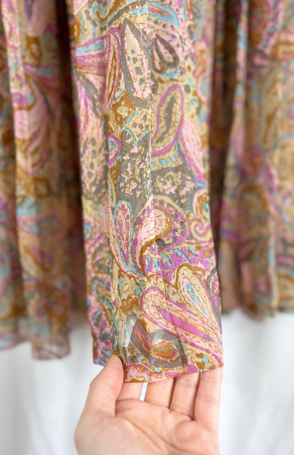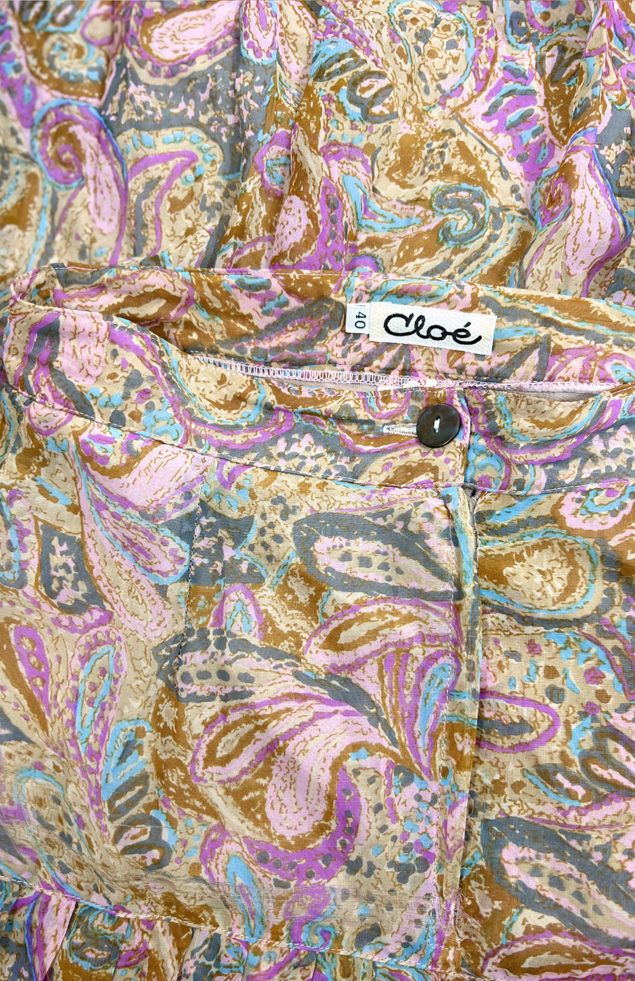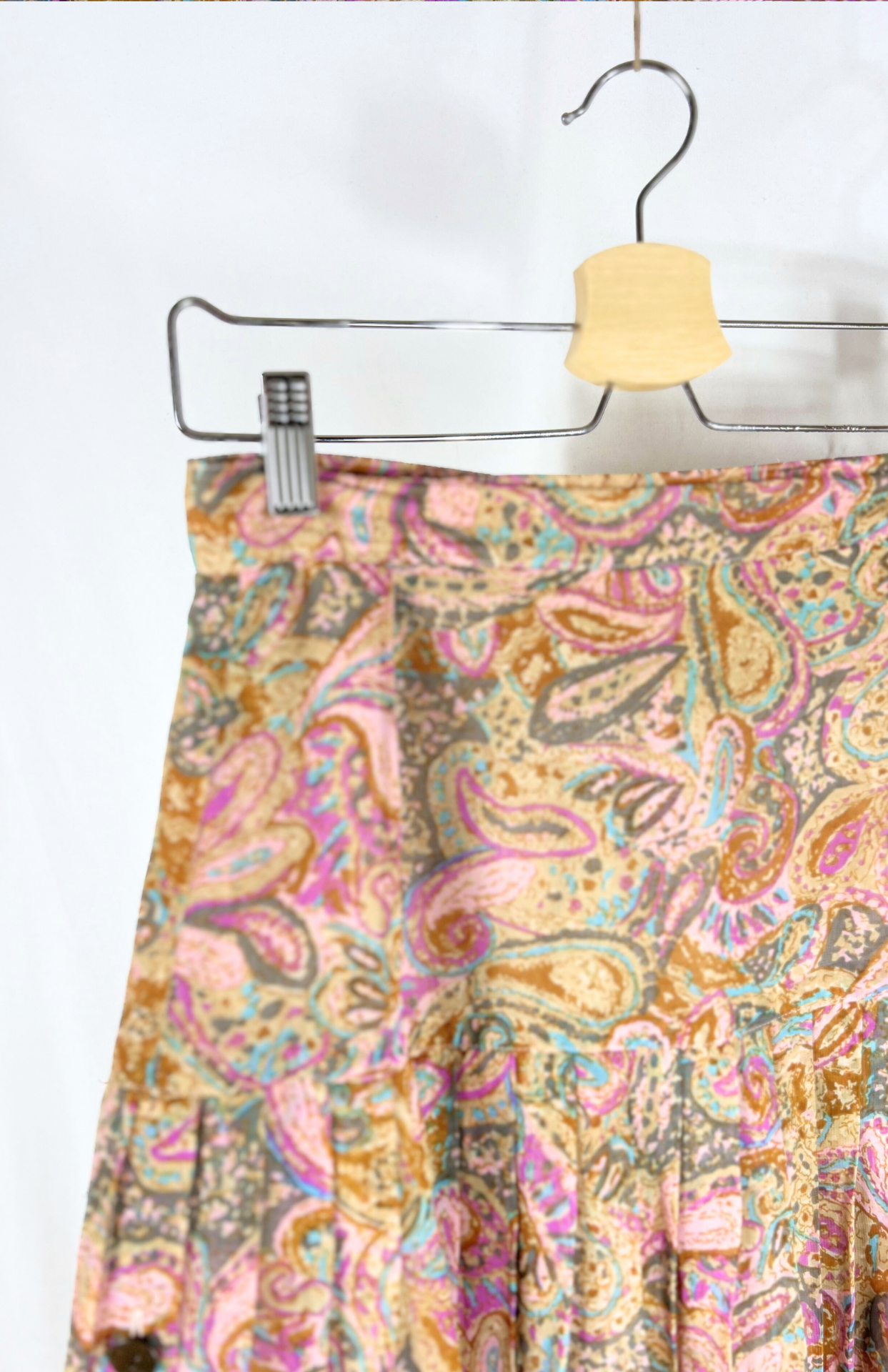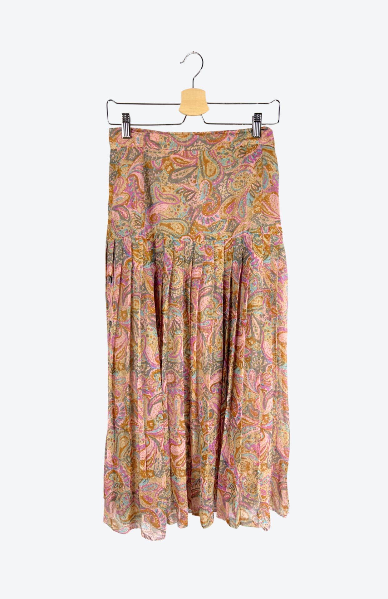 Vintage sukně s jemným plisé a pastelovým barevným vzorem. Má pevný pas se zapínání na knoflík a skrytý zip. Po straně detail s knoflíky. Jemný, rozevlátý kousek se saténovou podšívkou vespod.