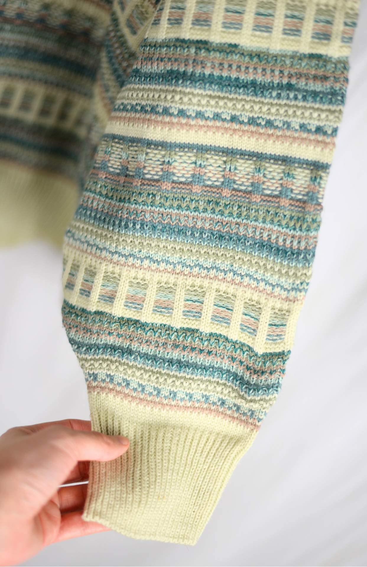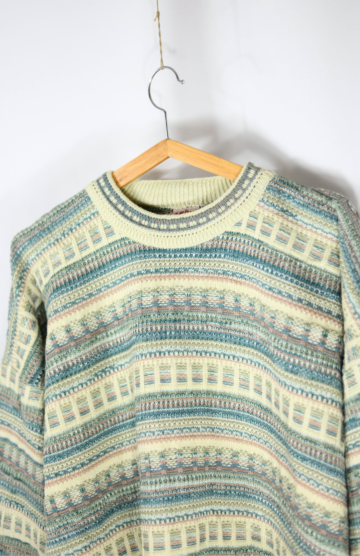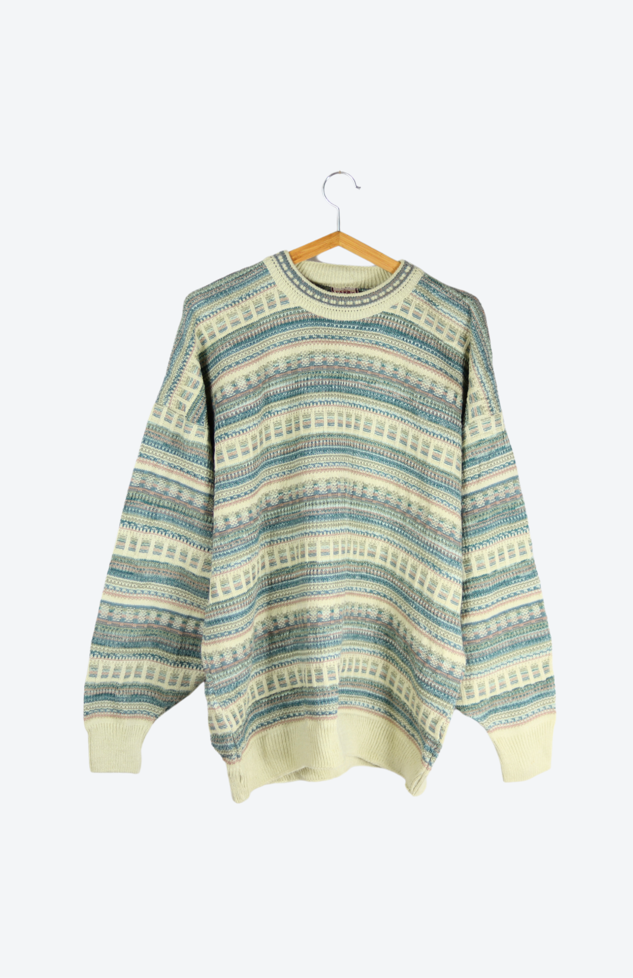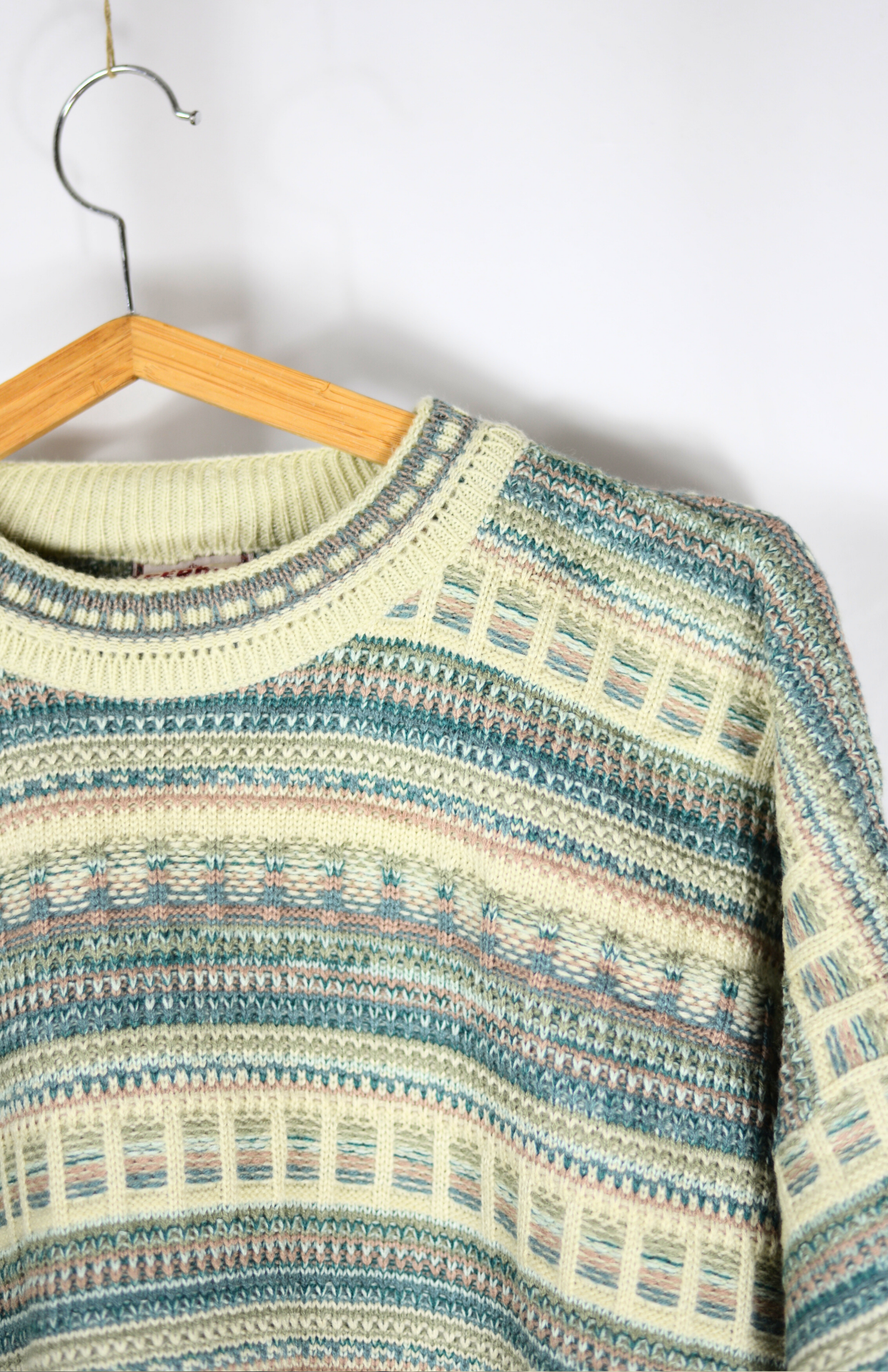 Vintage svetr s jemně barevným, strukturovaným vzorem. Má výstřih u krku a krémový lem. Středně silný úplet, delší střih a lehce nabíraný rukáv. Unisex kousek.