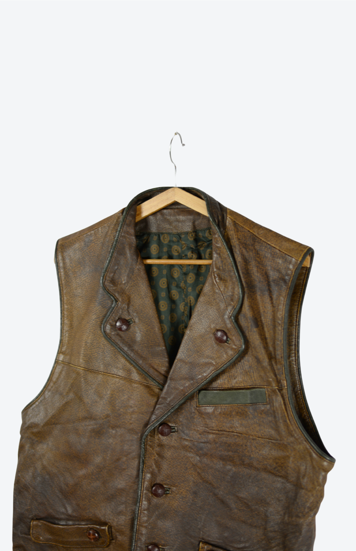 Silná kožená vesta s potahovanými knoflíky a výrazným límcem. Uvnitř má pěknou vzorovanou podšívku. Pánská / unisex.