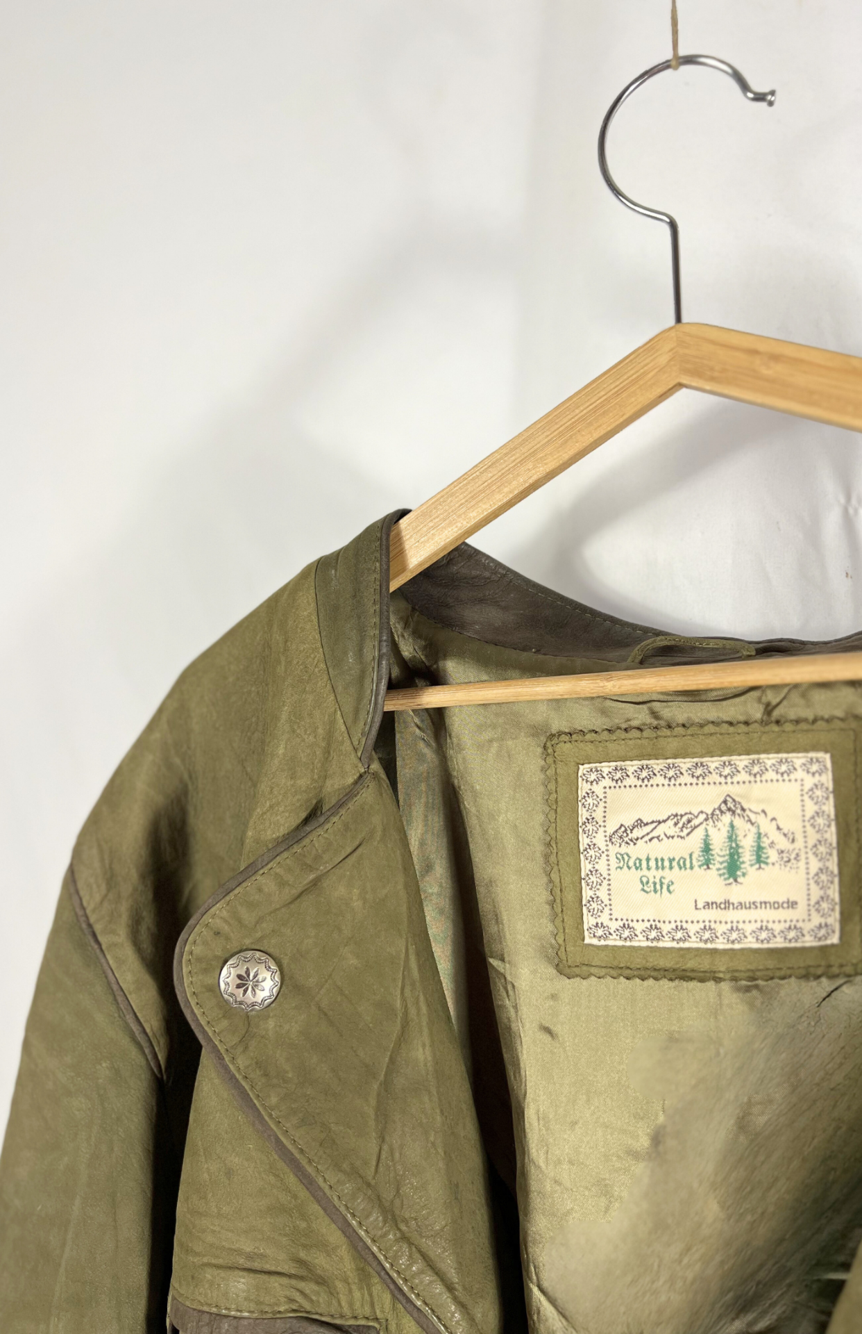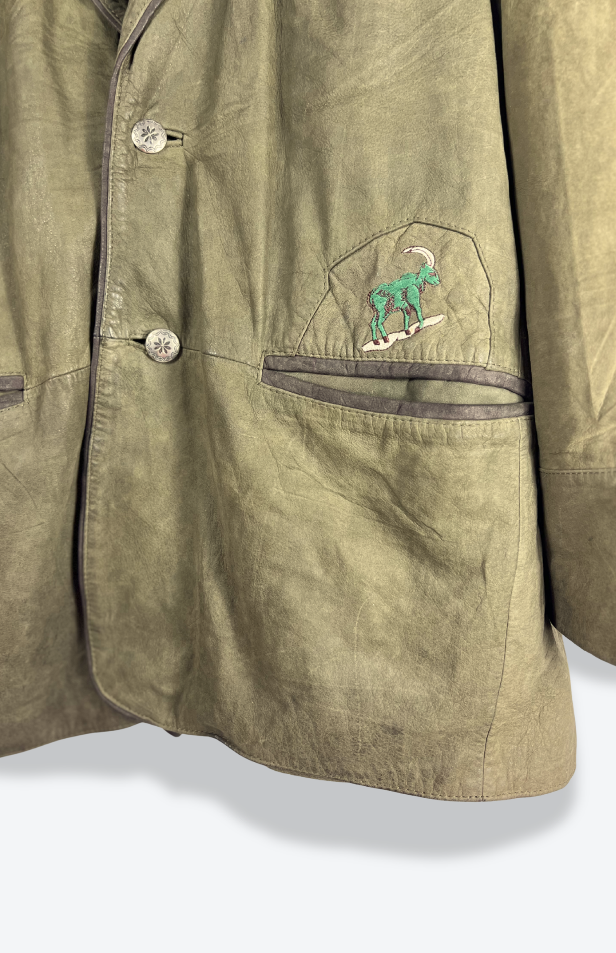 Olivově zelená vintage kožená bunda s kovovými zdobenými knoflíky. Velmi pěkně zpracované detaily, kapsy zvenčí i skryté uvnitř a pásek vzadu. Detail s výšivkou kozy. Pánská / oversize unisex kousek.