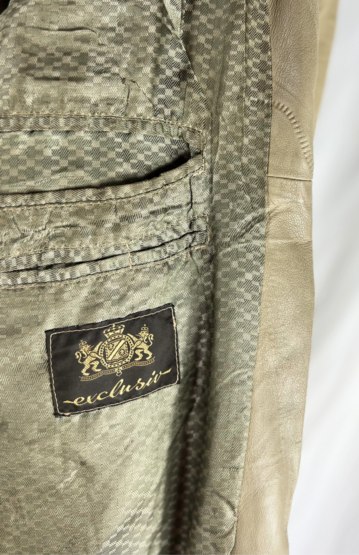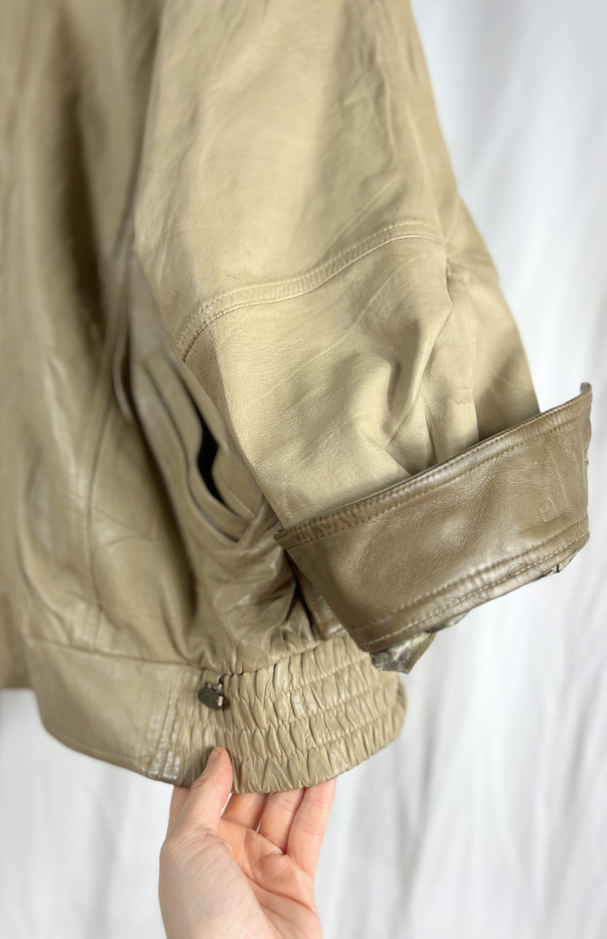 Vintage krémová kožená bunda. Má kratší střih s gumičkou na spodním lemu ala bomber. Má drobný límeček a detaily v tmavší kůži. Kapsy zvenčí i skryté uvnitř. Pánský / unisex oversize kousek.