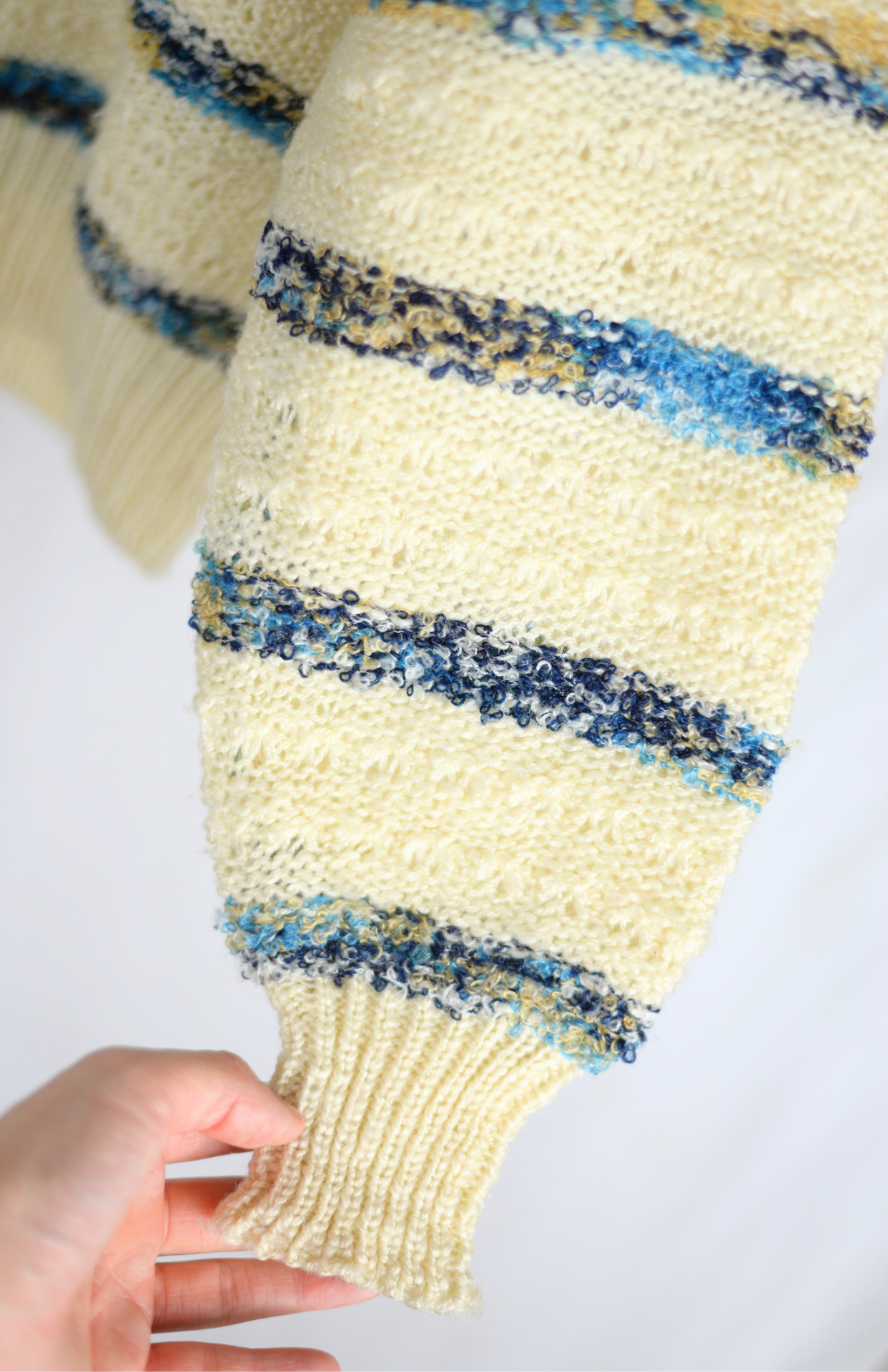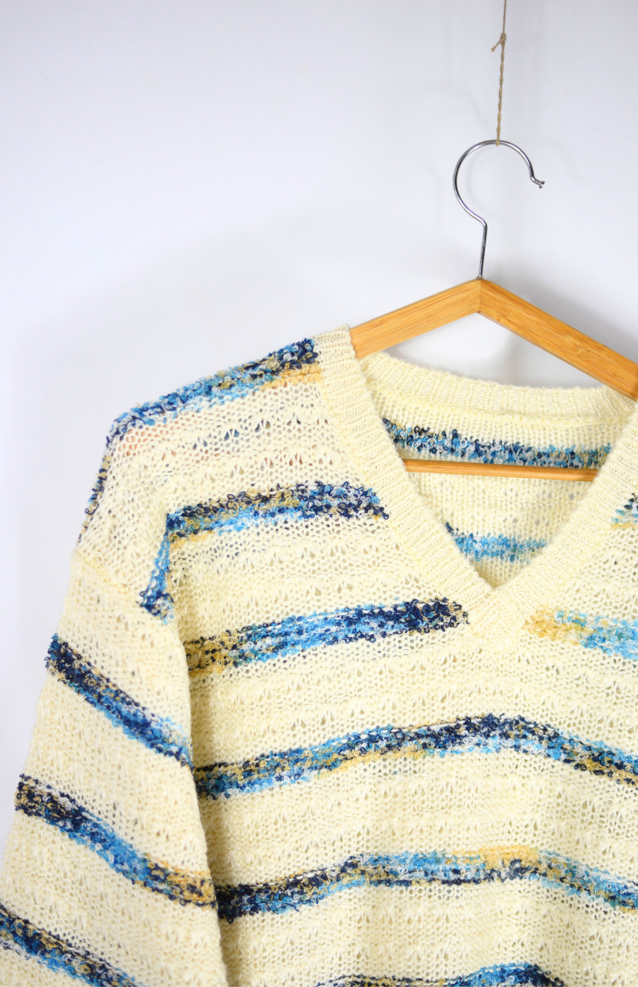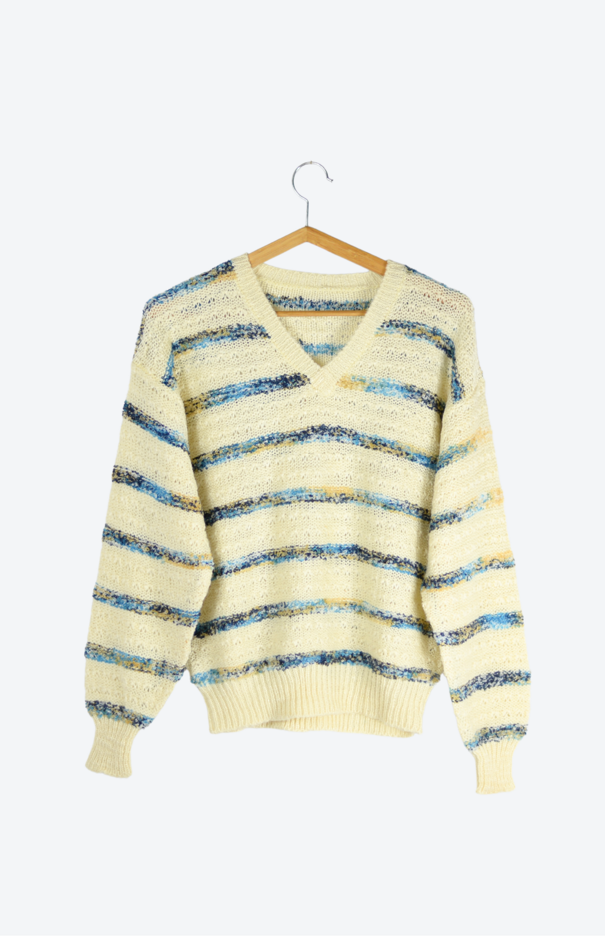 Vintage krémový svetr s výstřihem do V a nabíraným rukávem. Má žíhané modré proužky a příjemný lehčí materiál. Stav: Vintage kousek v perfektním stavu, bez vad.
