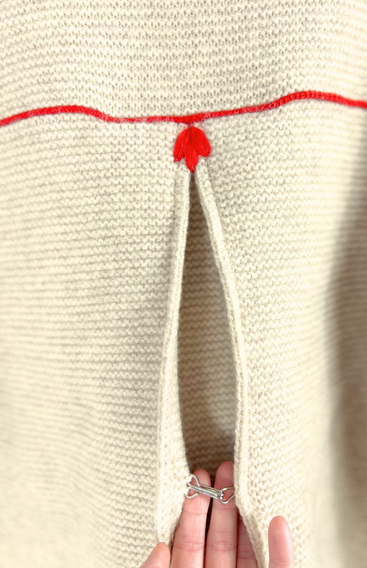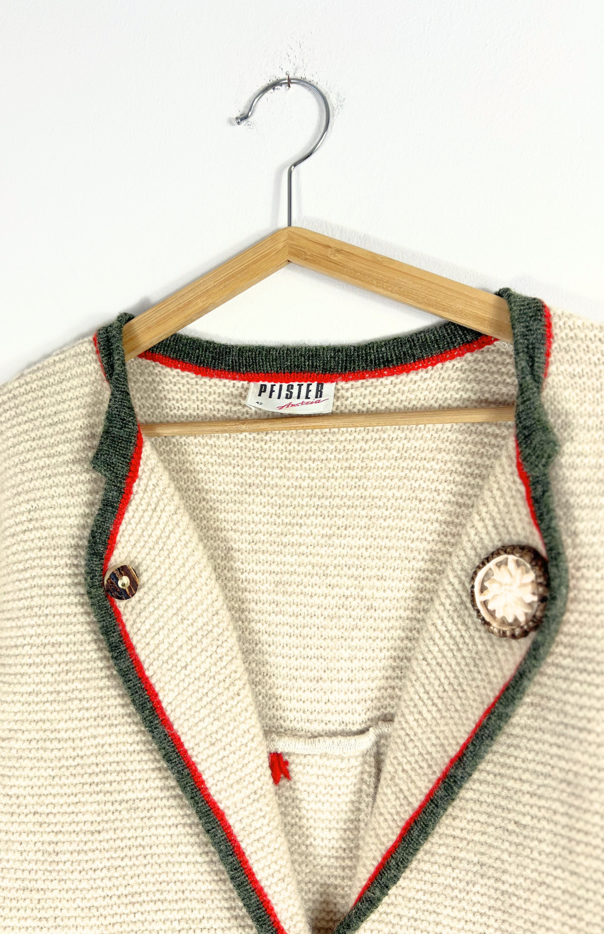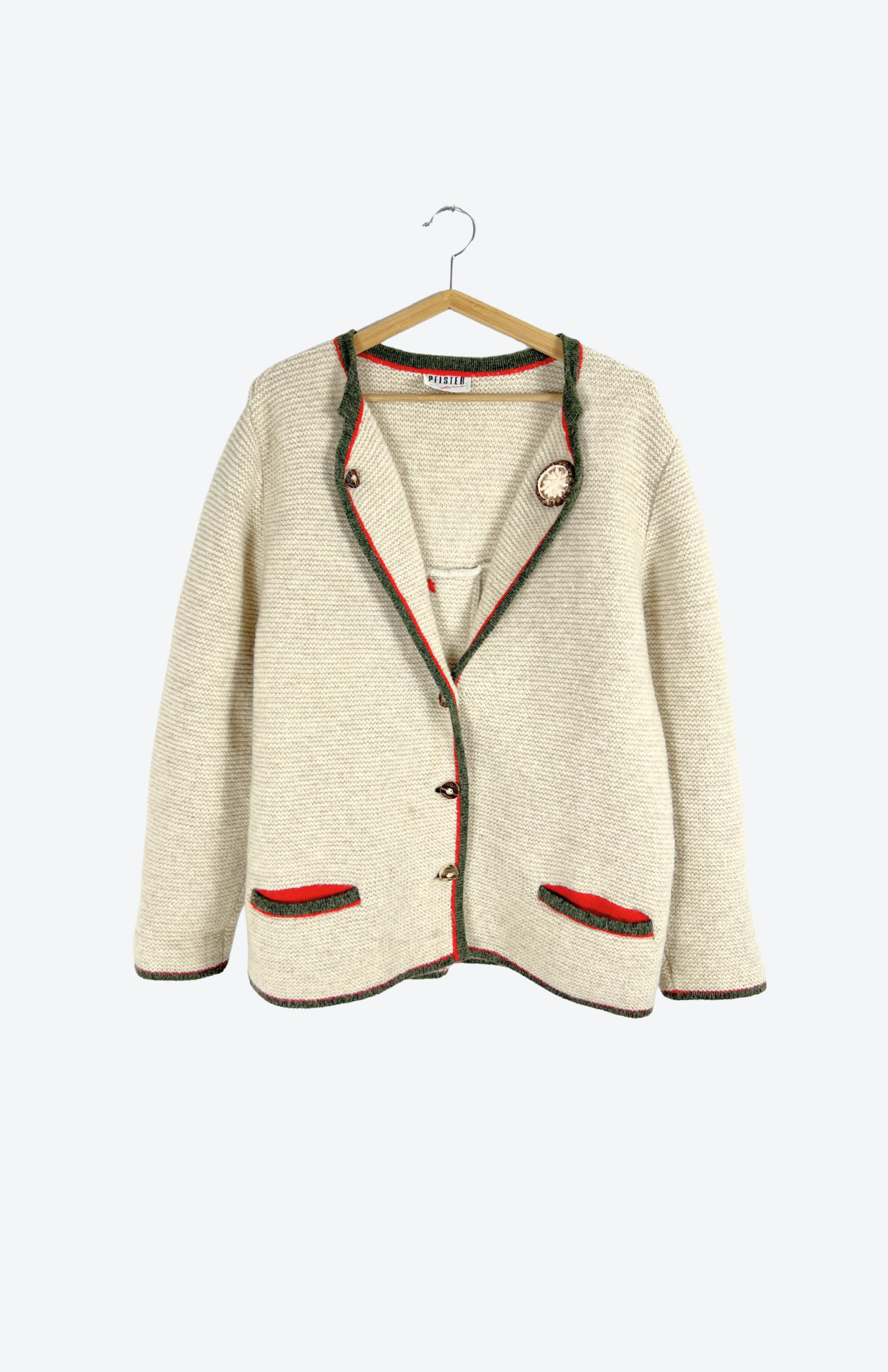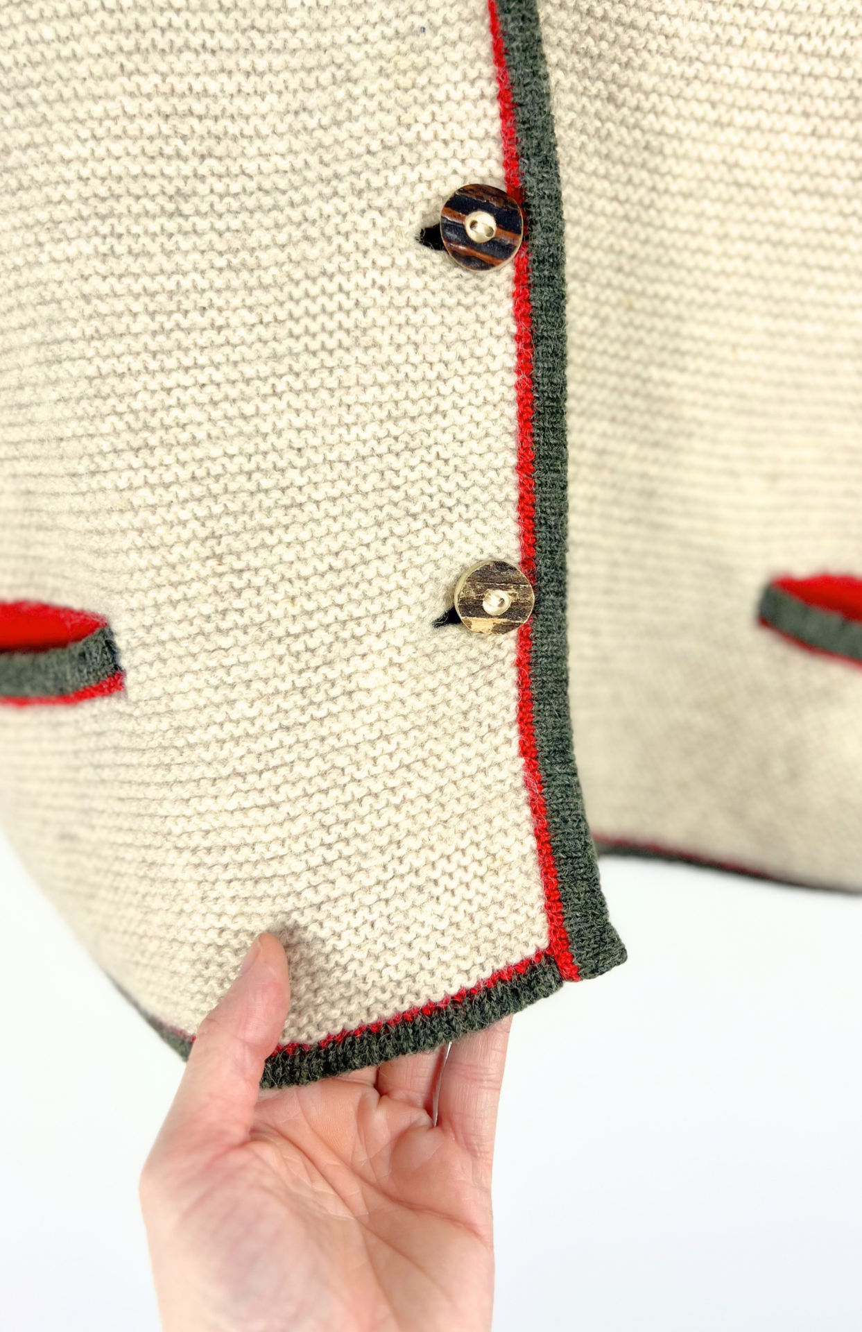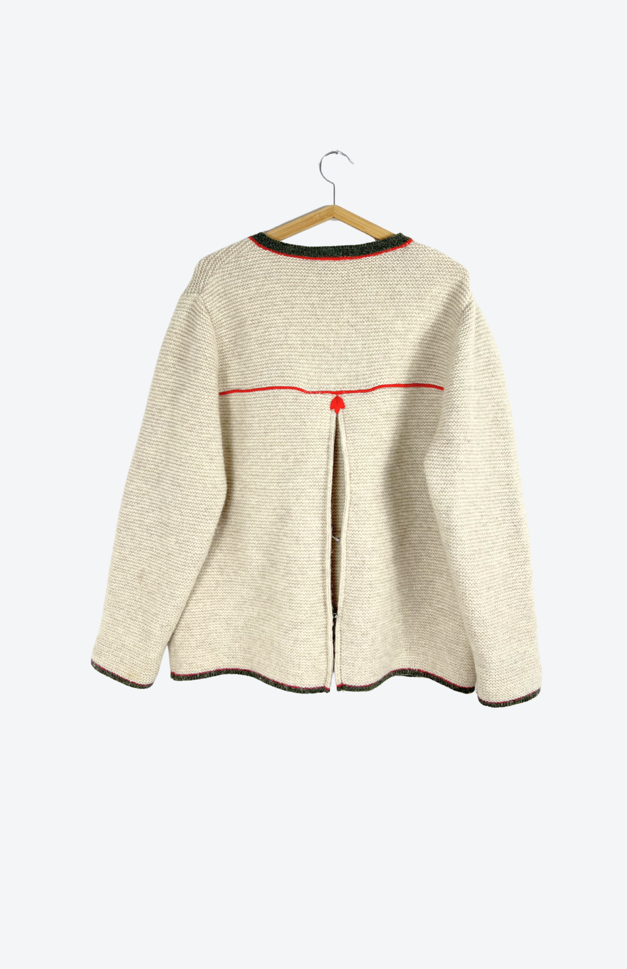 Silný, čistě vlněný krémový svetr s tmavě zeleným a červeným lemem. Má vyrazné rustikální knoflíky a originální detail s háčky na zádech. Teplý, pěkně zpracovaný kousek.