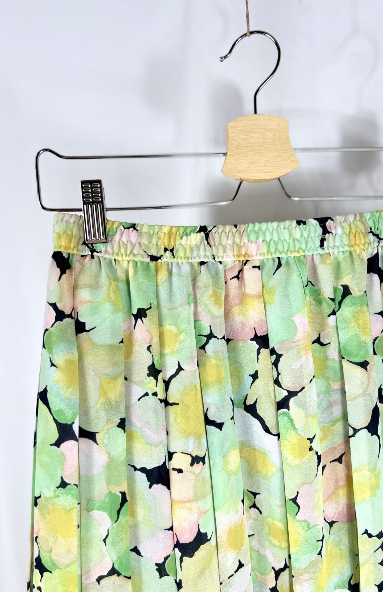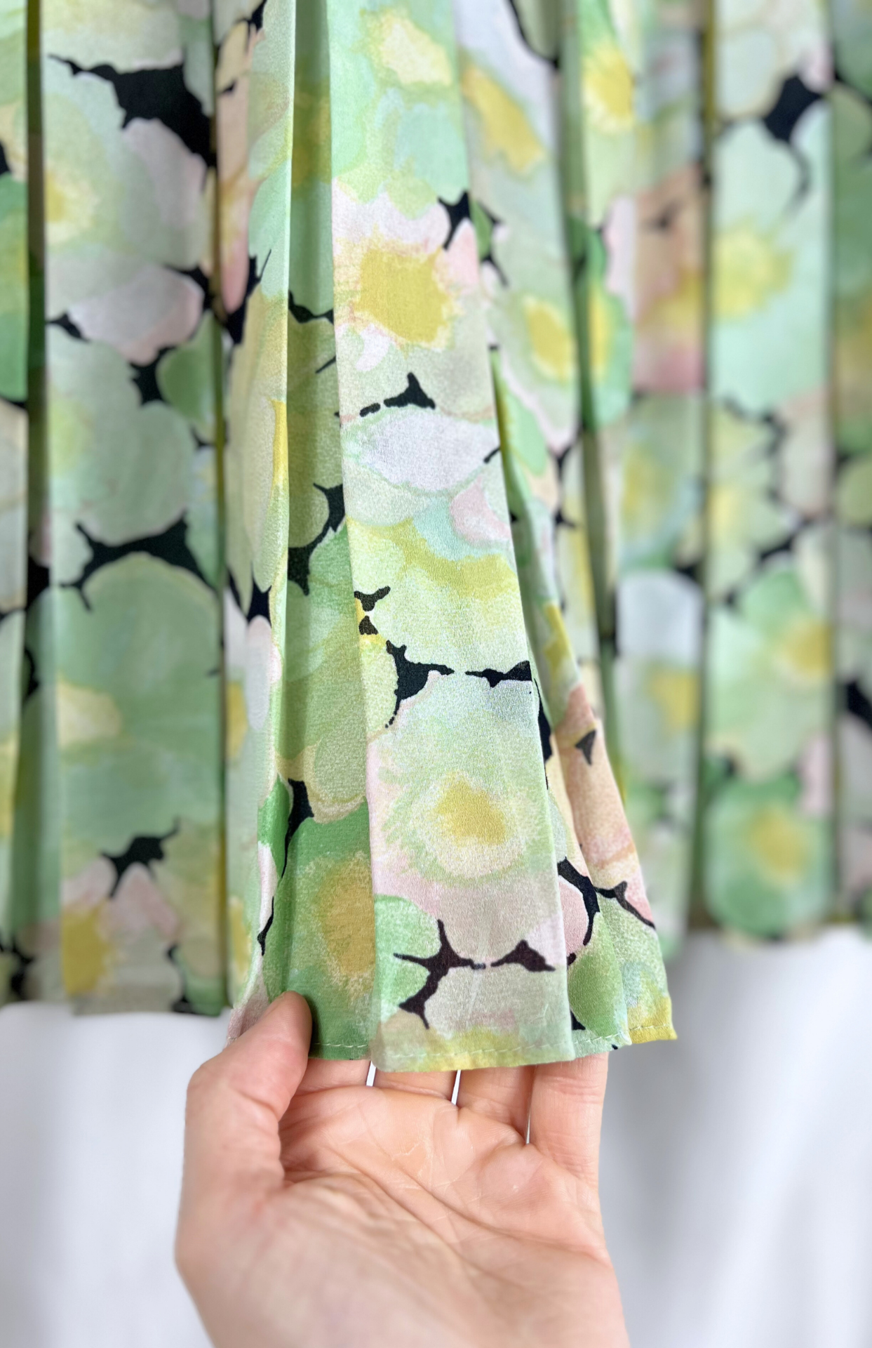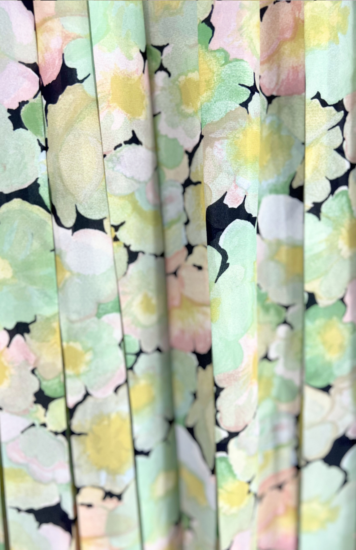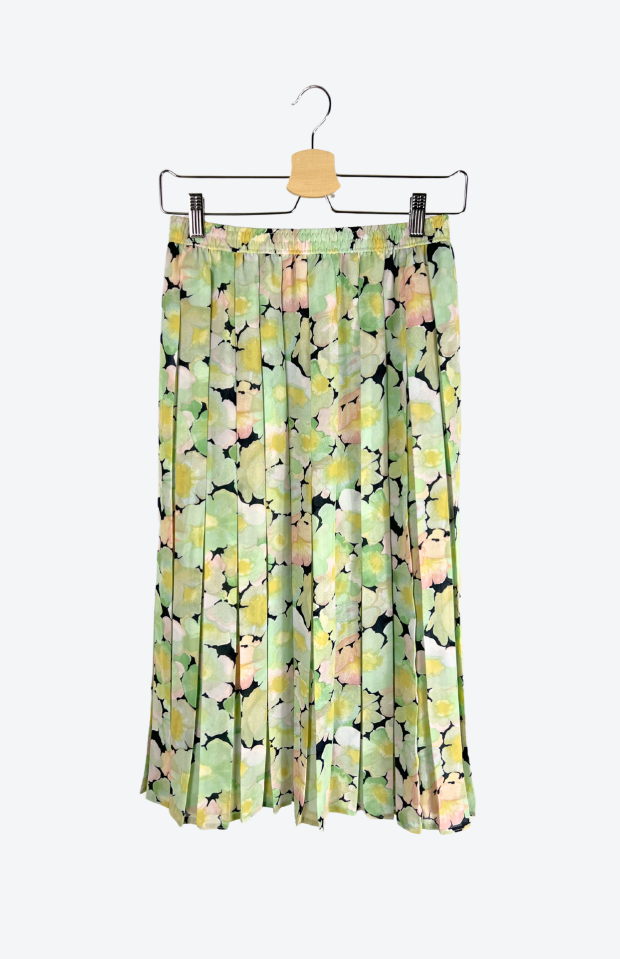 Originální 80´s sukně s květinovým vzorem. Má pružný pas, plisování po celé délce a nemačkavý materiál.