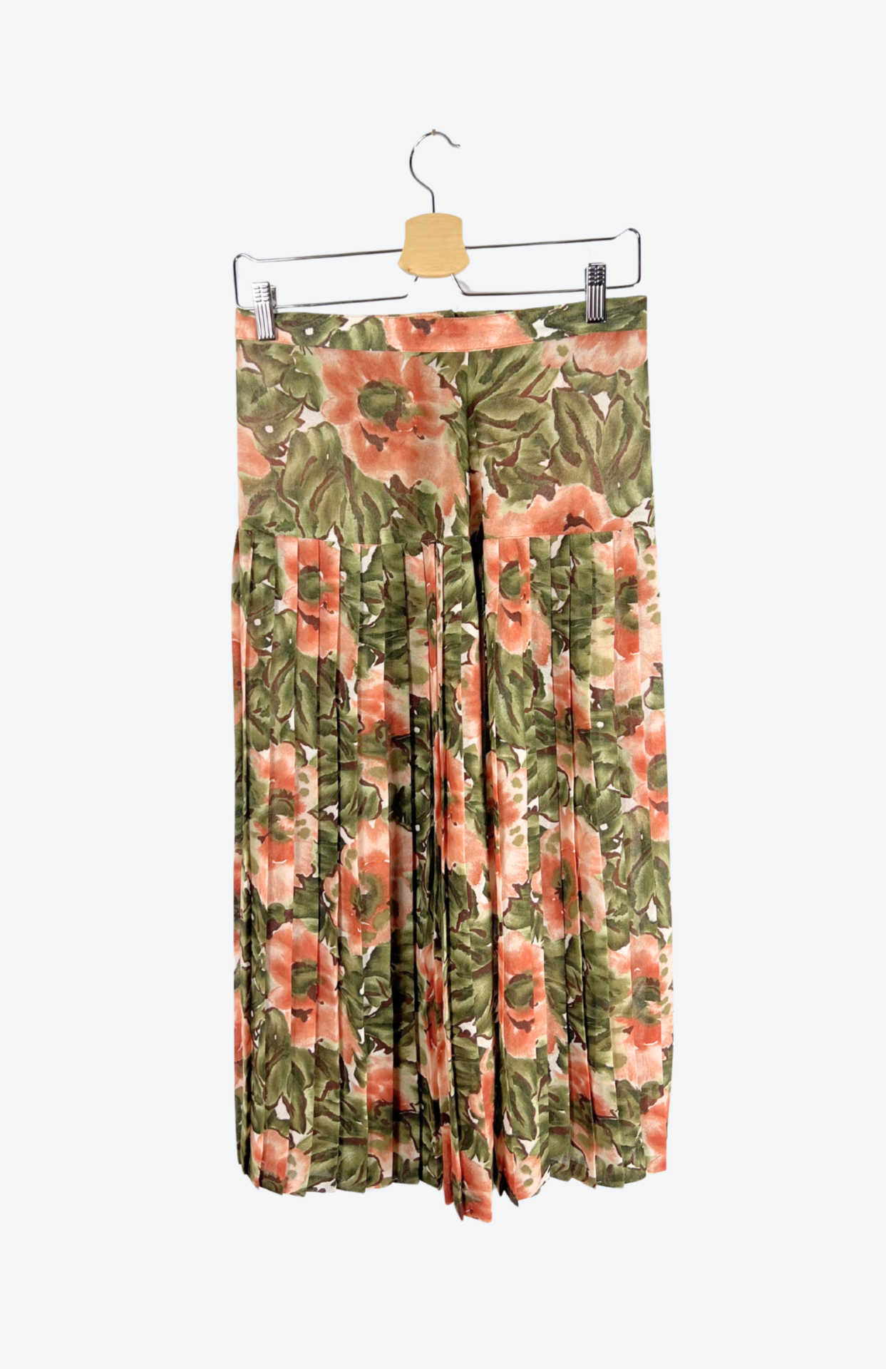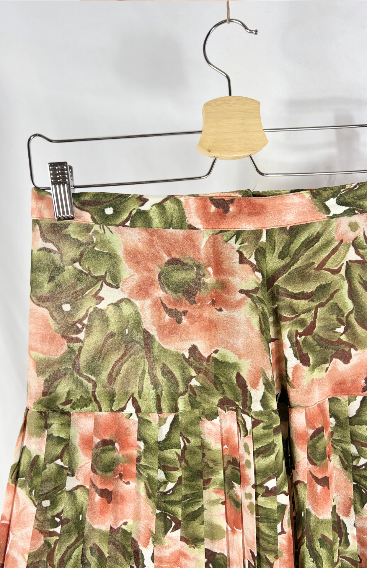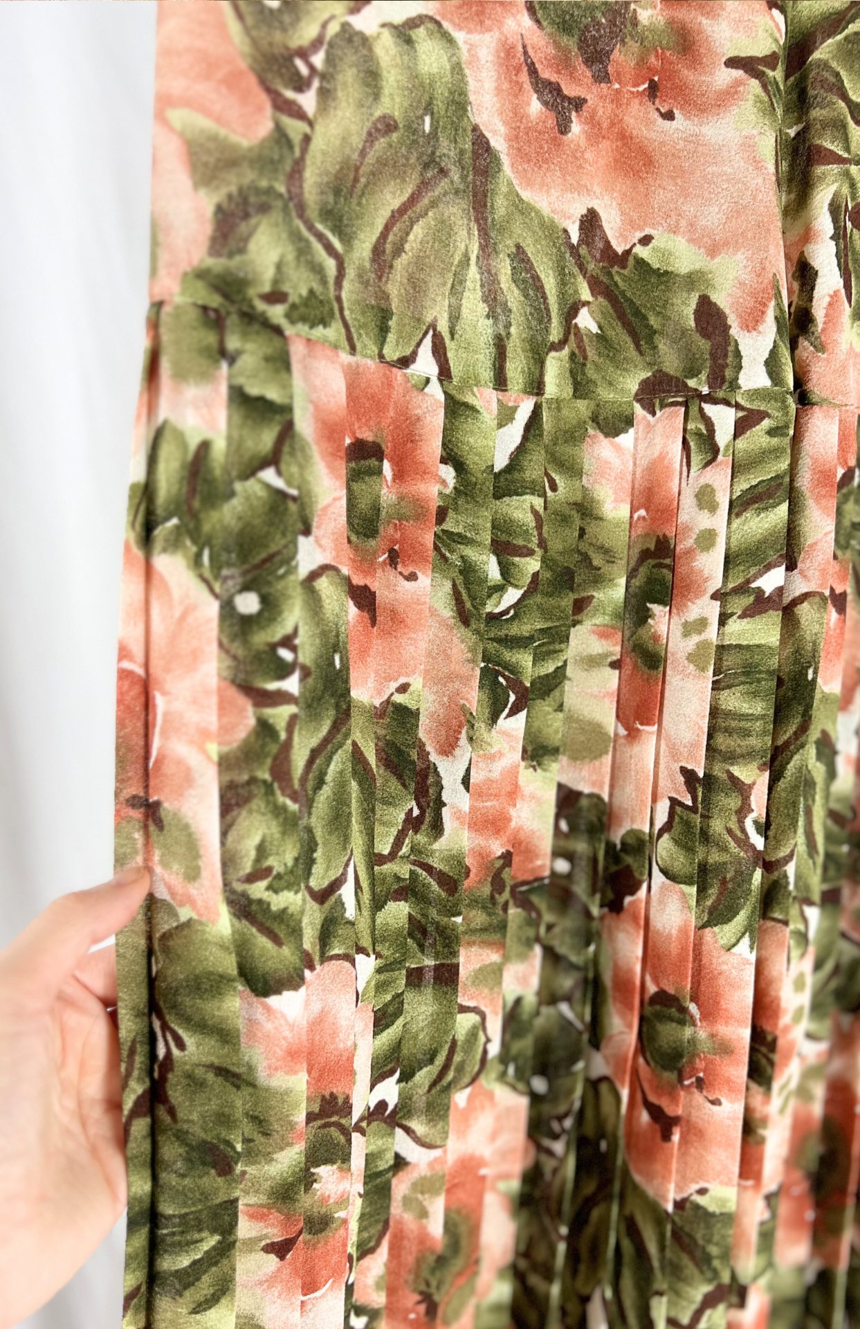 Vintage dlouhá sukně s akvarelovými květy. Má plisování pod boky, pěvný pas a zapínání vzadu na zip a knoflíček. Jemný, polotransparetní materiál.
