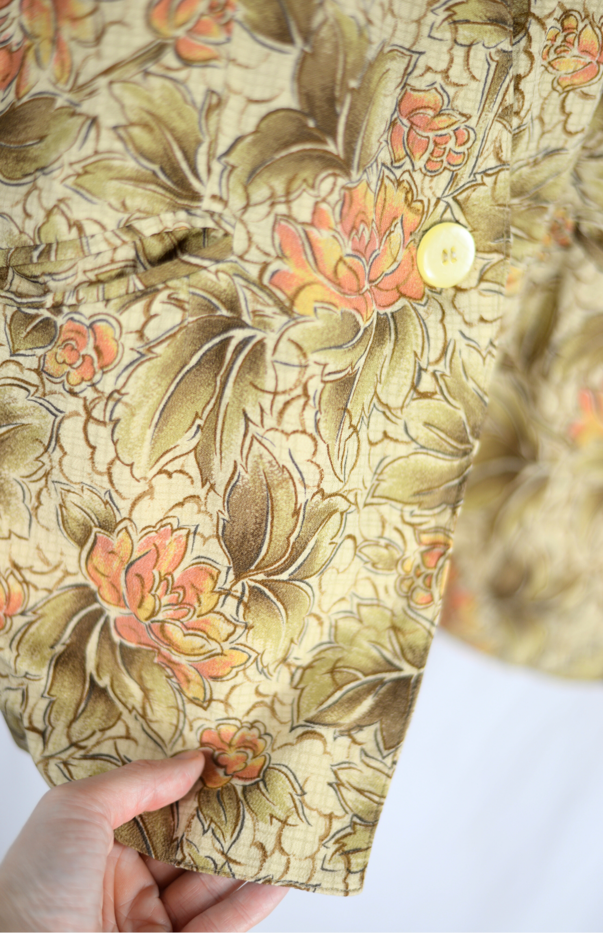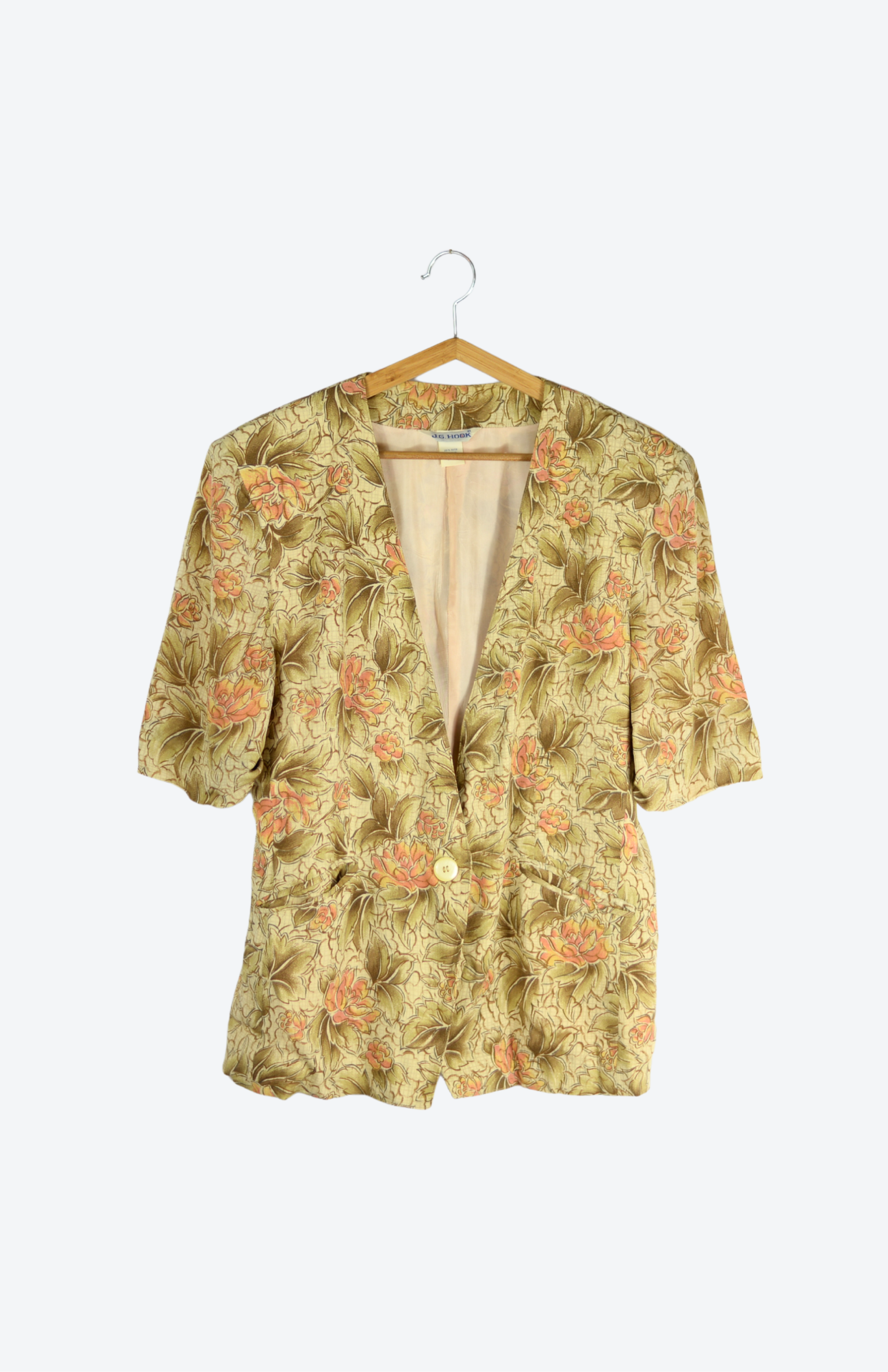 Krásný vintage květinový top/sako s krátkým rukávem. Má příjemný přírodní materiál, zvýrazněná ramena a kapsy po stranách. Zapínání uprostřed na jeden knoflík.