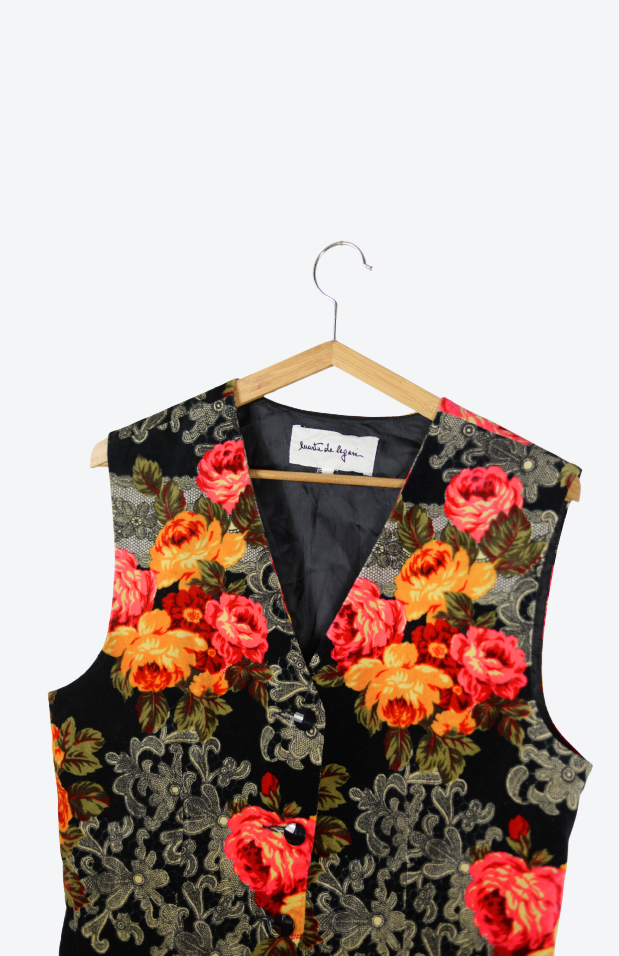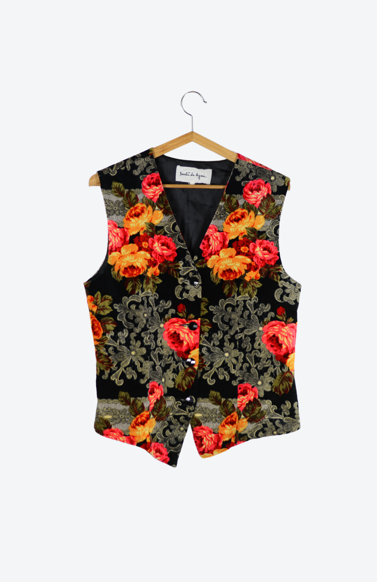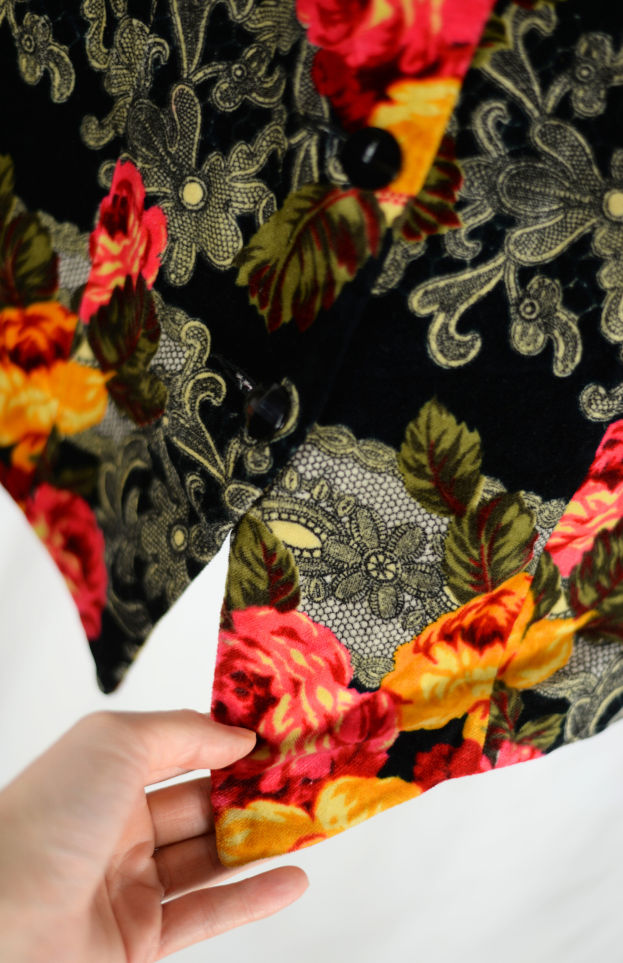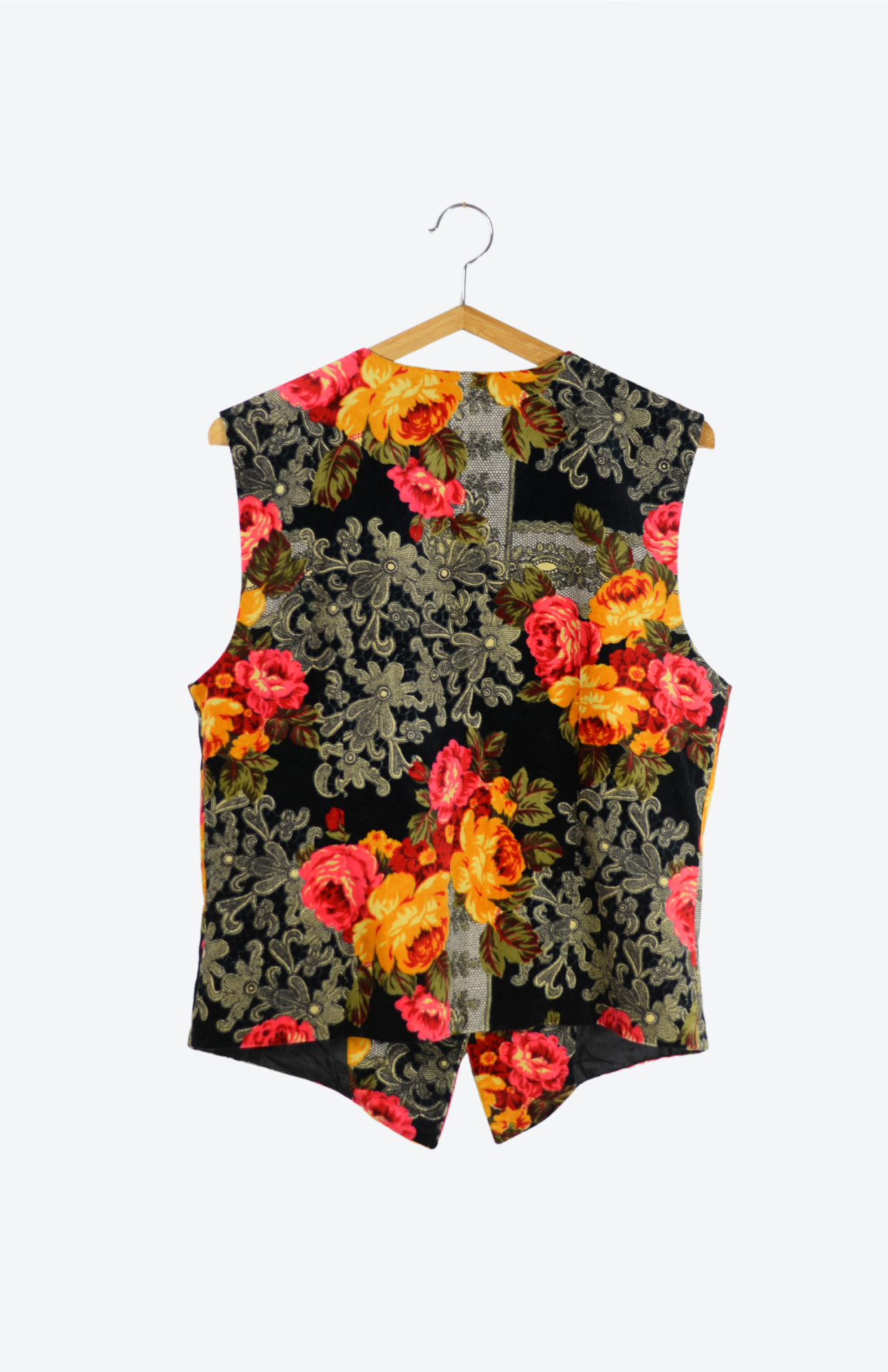 Sametová vesta s květinovým vzorem na obou stranách. Má saténovou černou podšívku a čistý střih bez kapes.