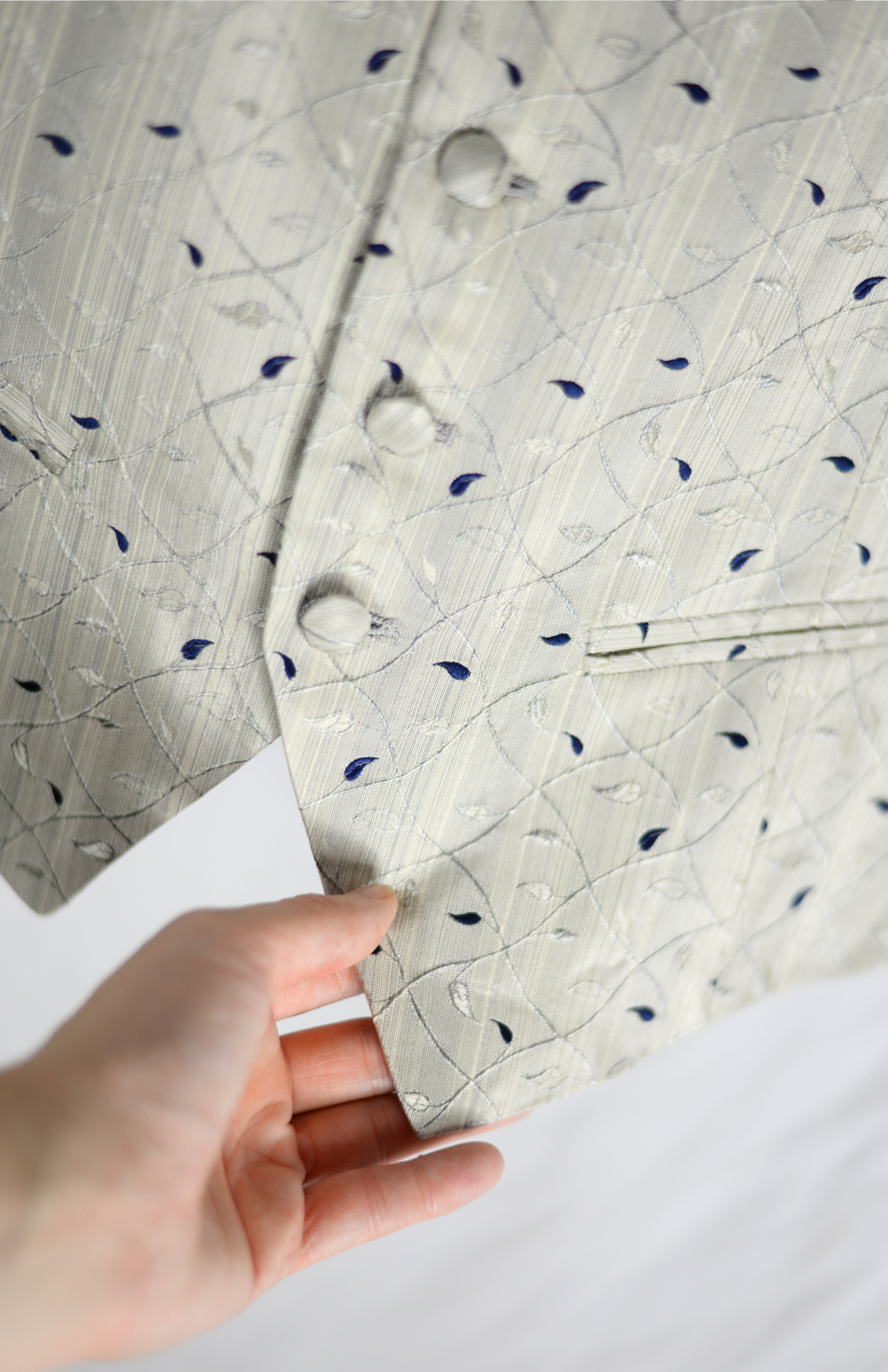 Vesta s žakárovým vzorem s drobnými lístky. Krásný perleťově bílý odstín a tmavě modrý detail. Má saténovou černou podšívku i záda, vzadu s páskem pro přizpůsobení v pase. Má zašité kapsy po stranách. Unisex kousek.