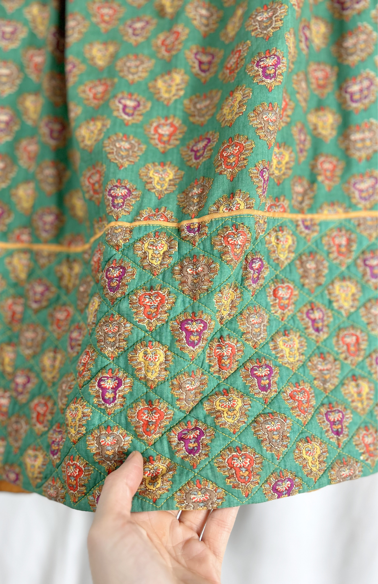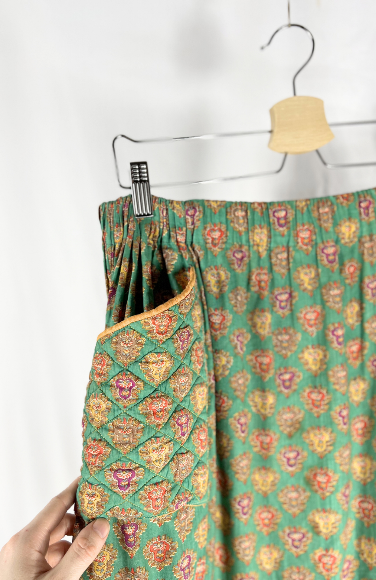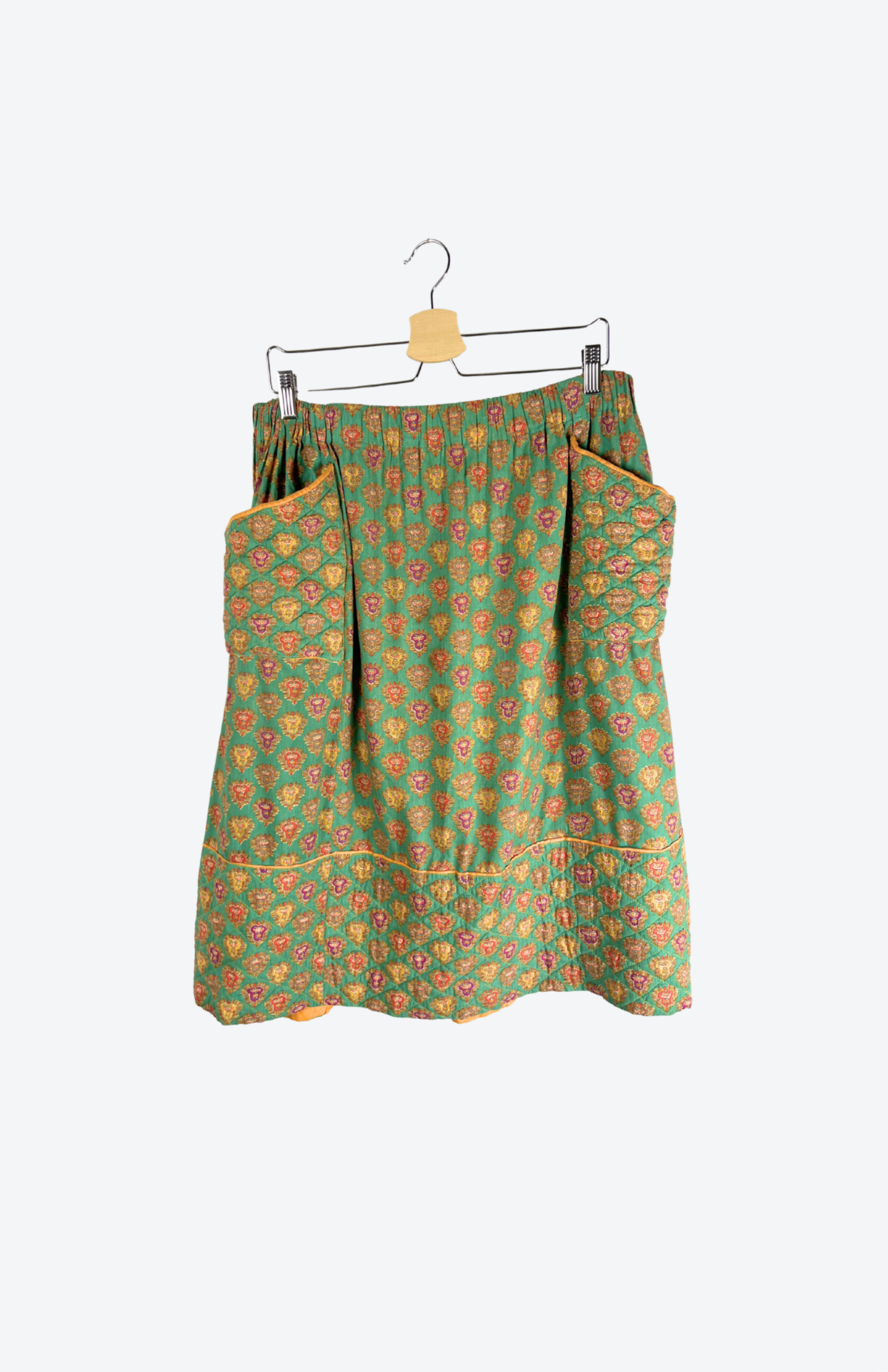 Vintage sukně s jemně pružným pasem a barevným ornamentálním vzorem. Má dvě hluboké kapsy vpředu. Vzadu se zapínáním na háčky.