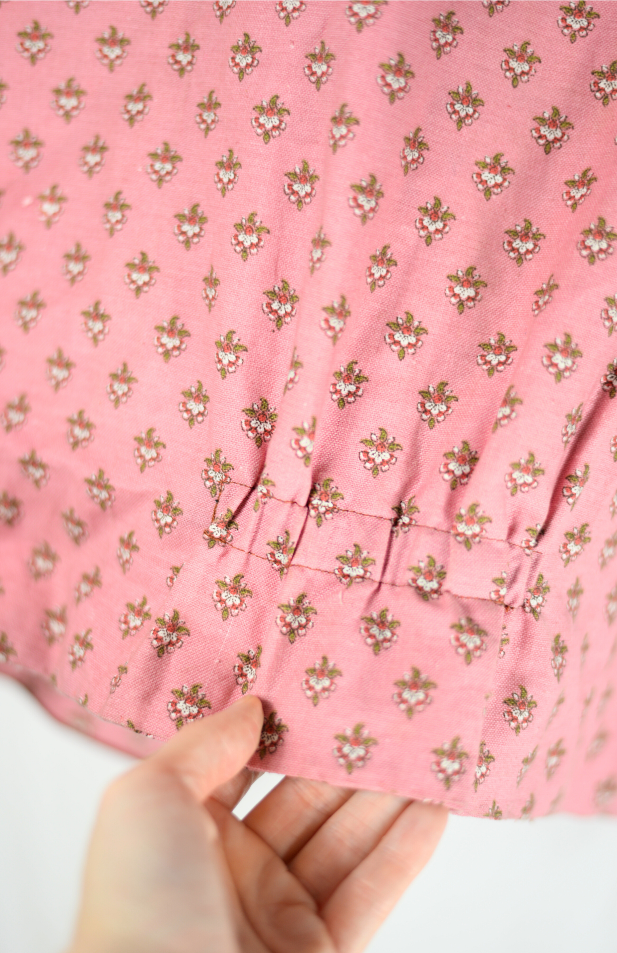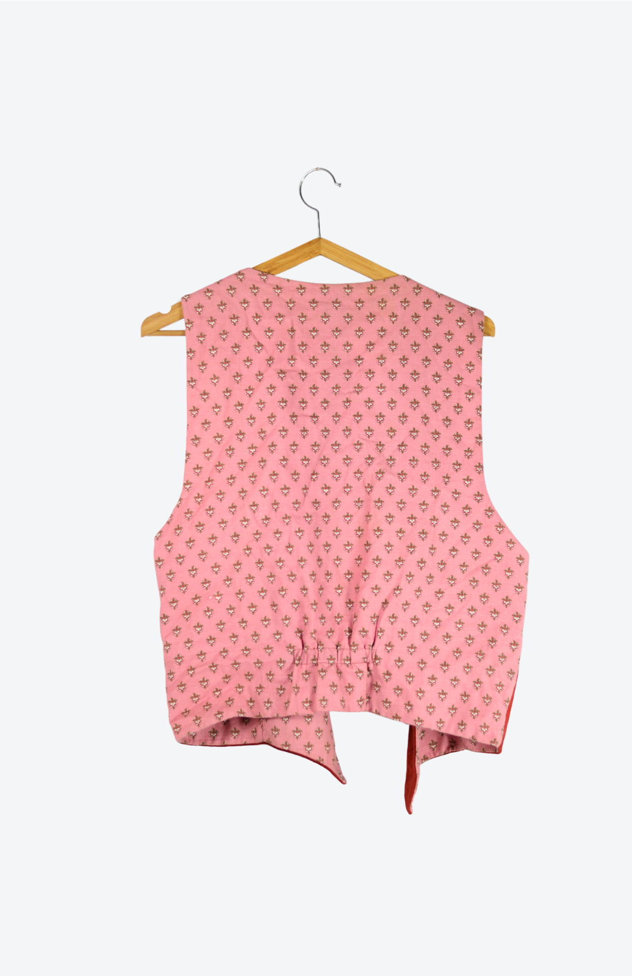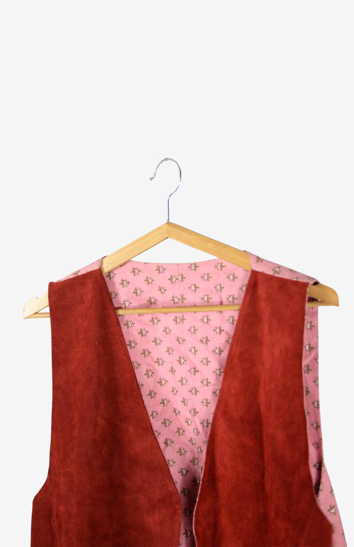 Vintage vesta s přední částí ze sytě červené broušené kůže. Má bavlněná záda a podšívku s drobným květinovým vzorem. Velmi pěkně zpracovaný kontrastní retro kousek.