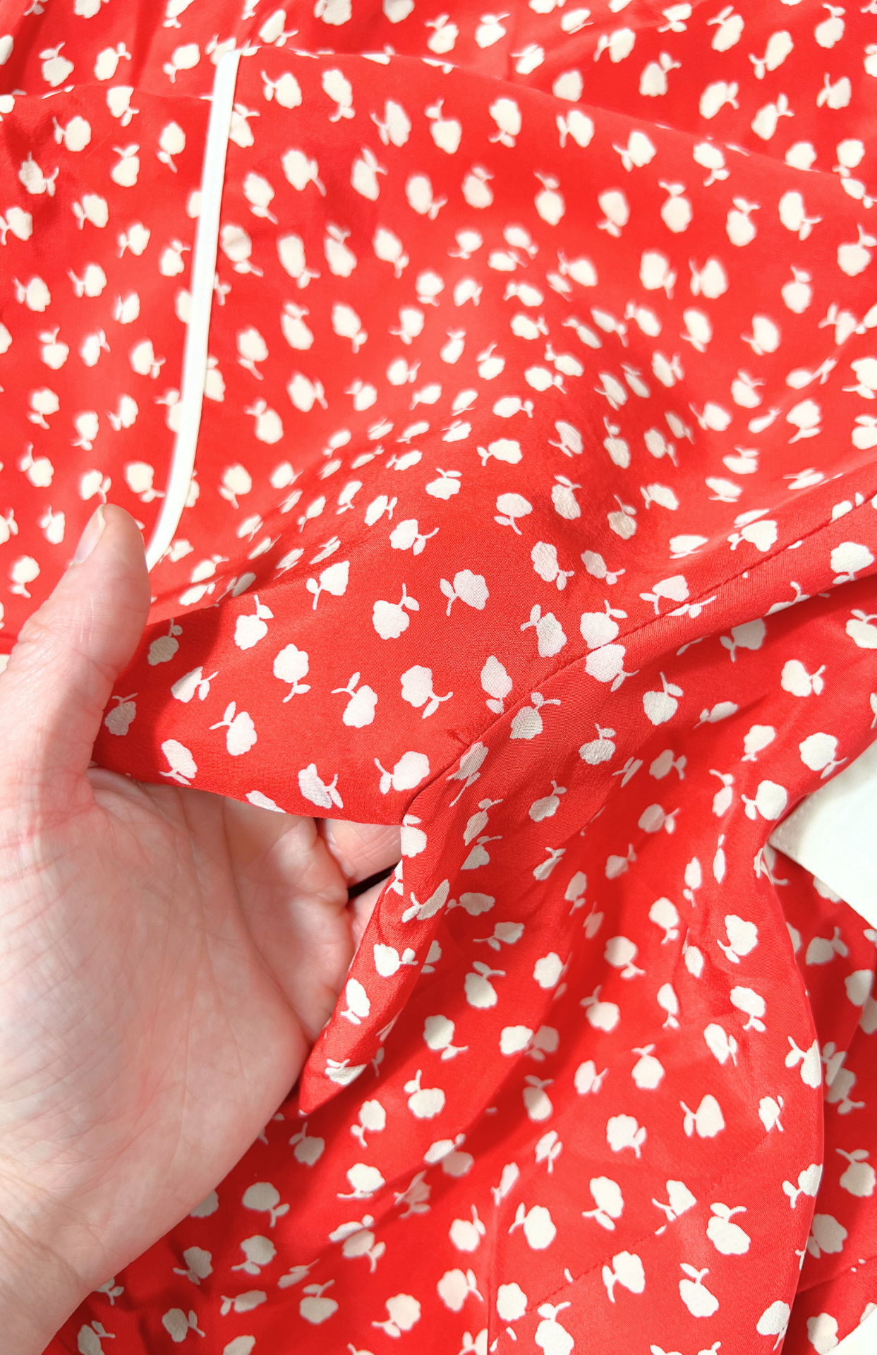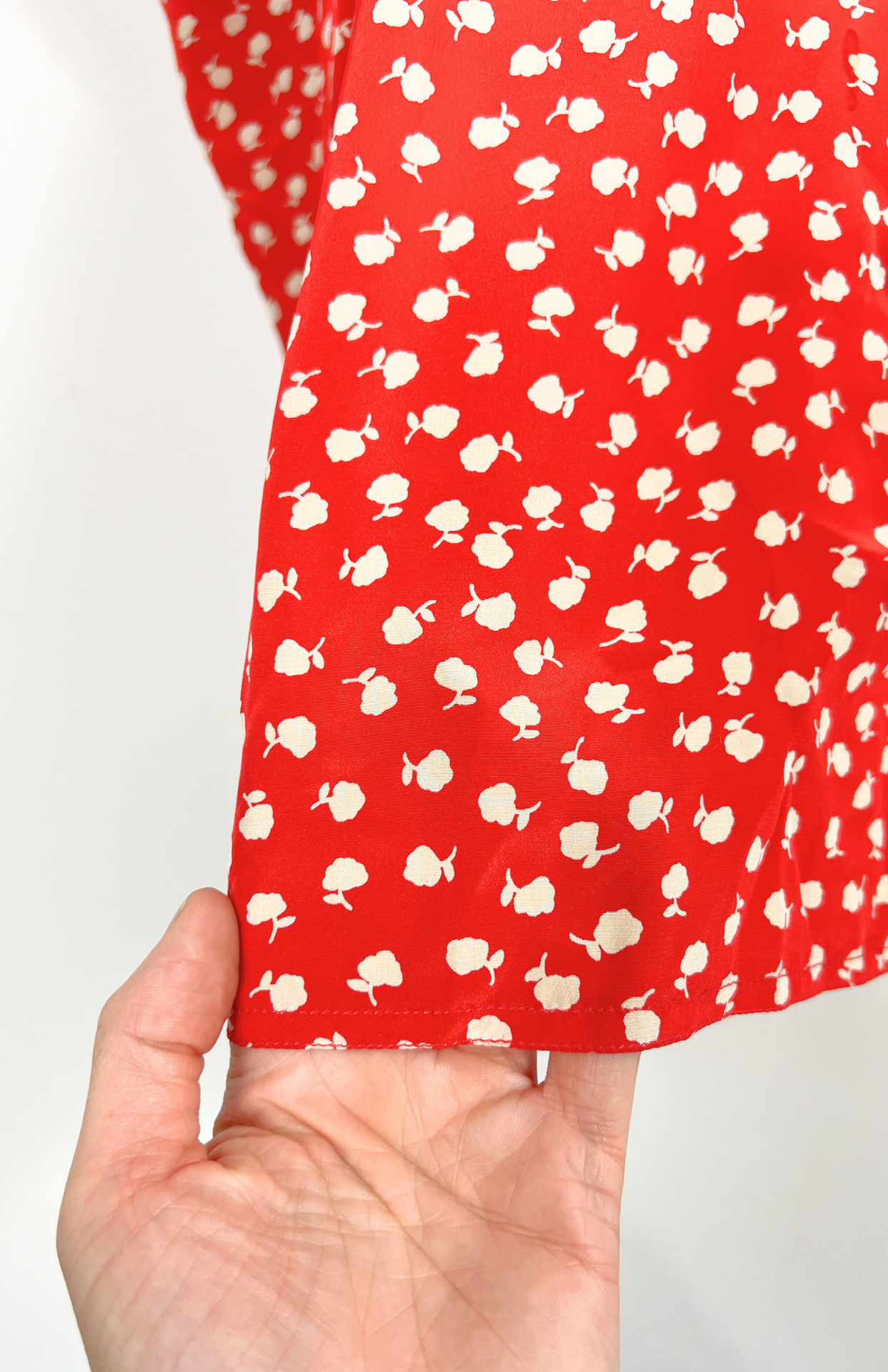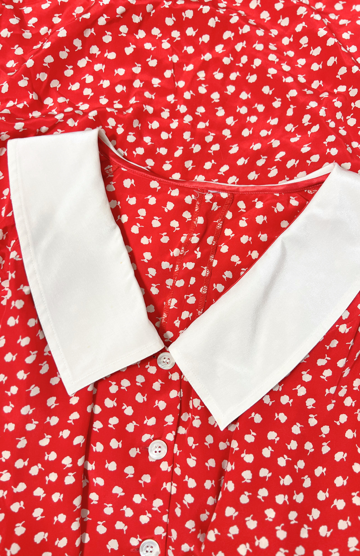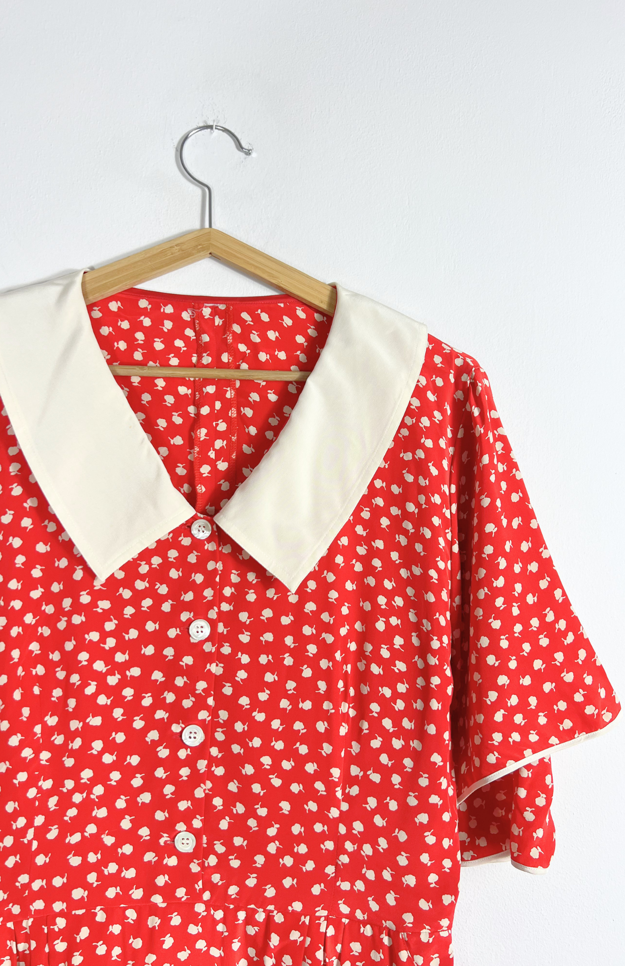 Čistě hedvábné vintage šaty s výrazným límečkem. Mají drobný vzor s bílými kvítky, volánkový rukáv a kapsy na bocích. Propínací pod límečkem na krémové knoflíky. Pěkně zpracovaný vintage kousek.