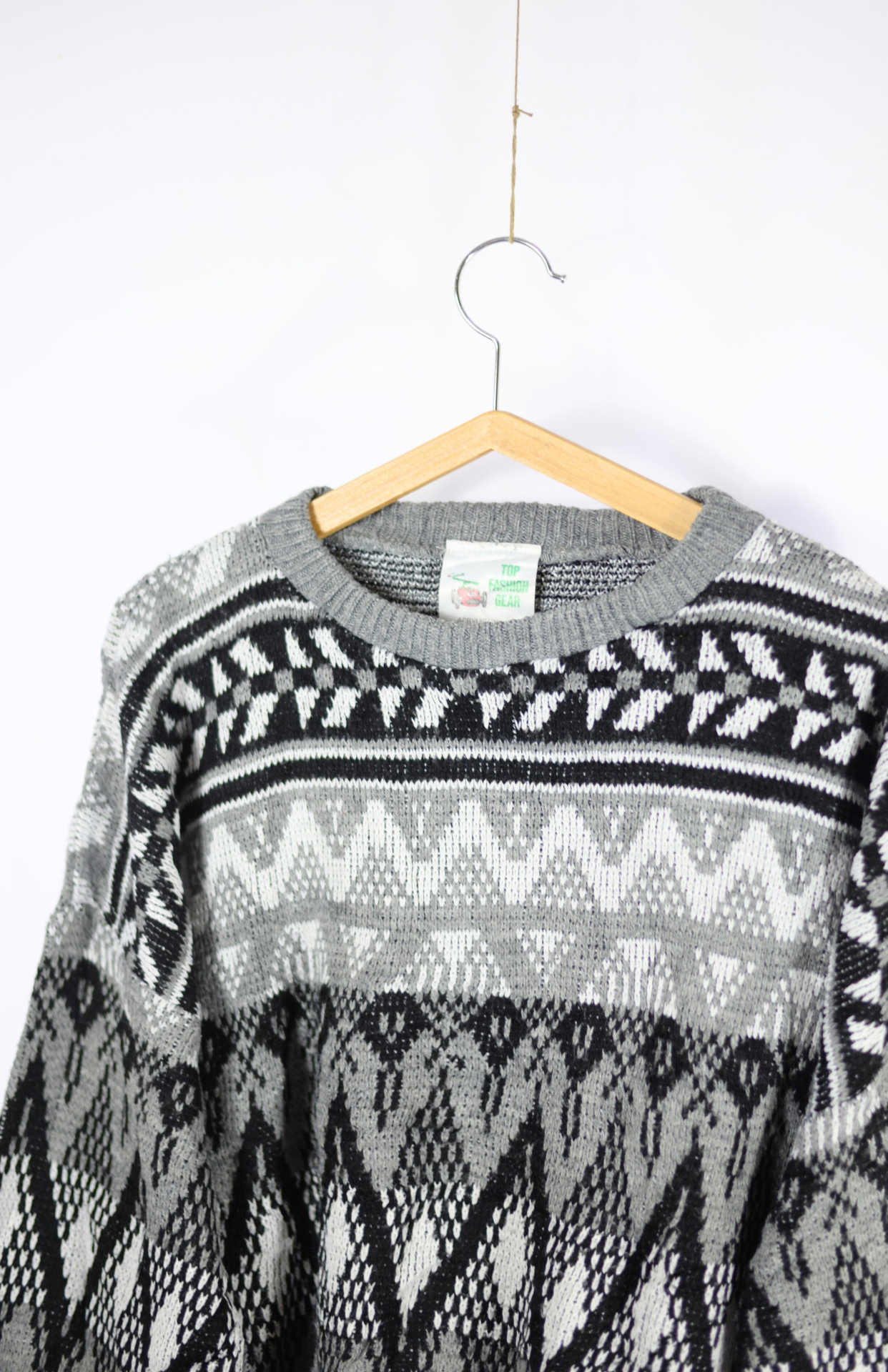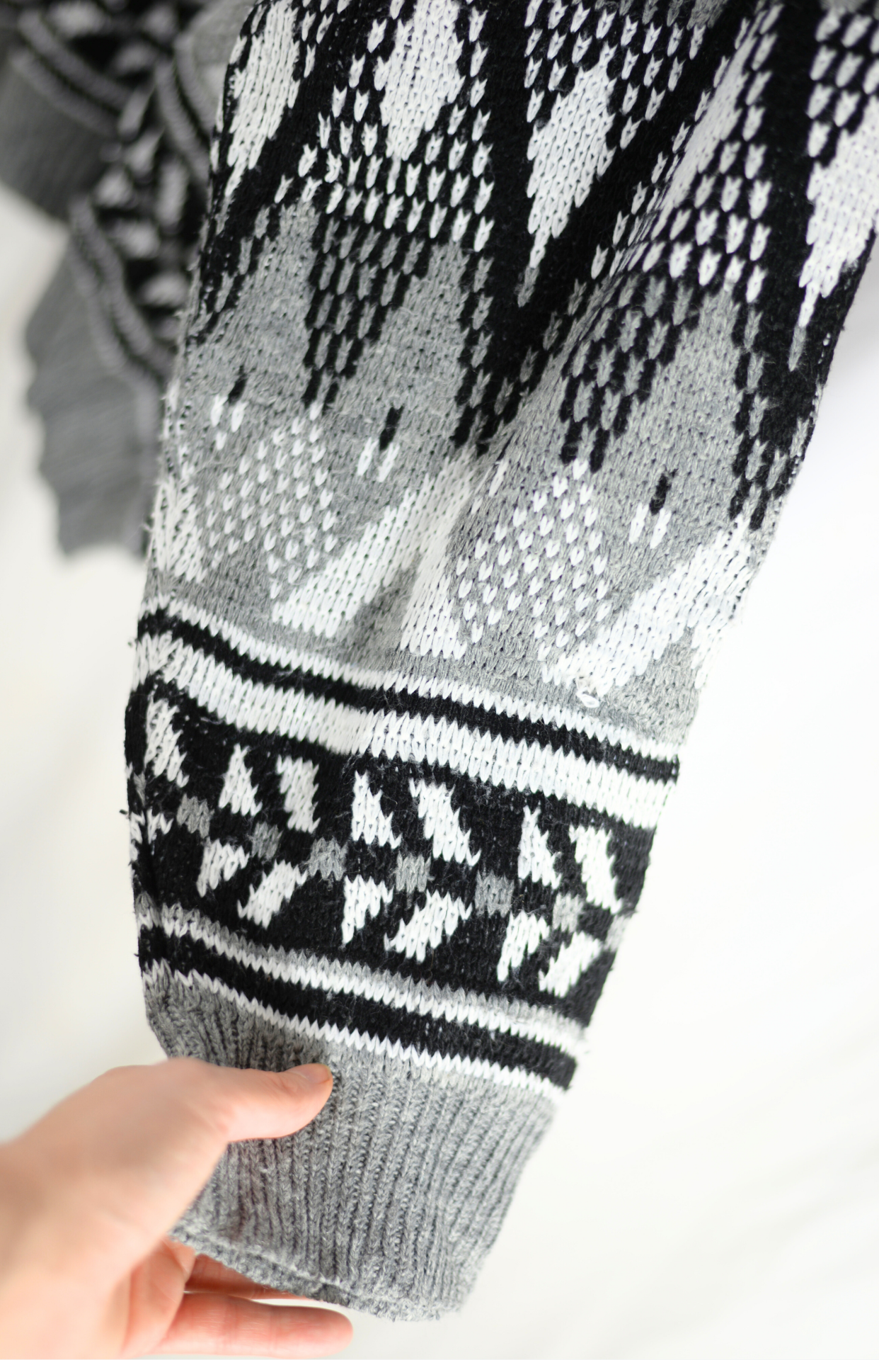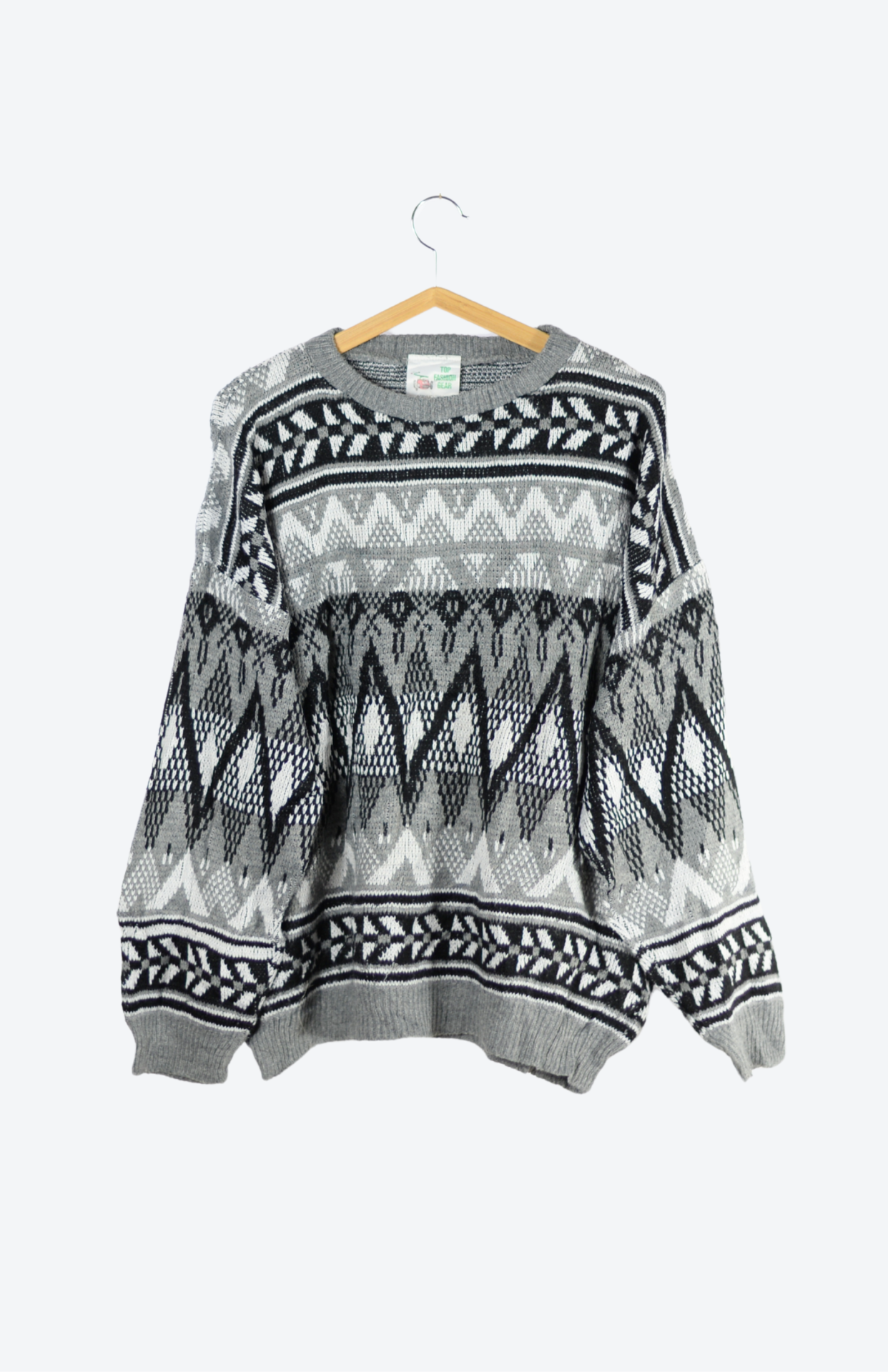 Vintage svetr s funky černo-bílým vzorem. Má výrazně nabíraný rukáv a středně silný úplet. Originální a pěkně zpracovaný.