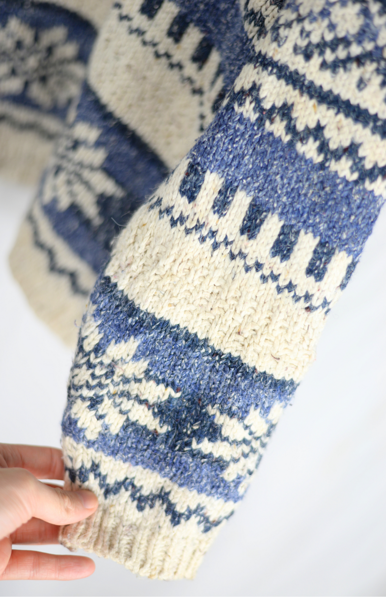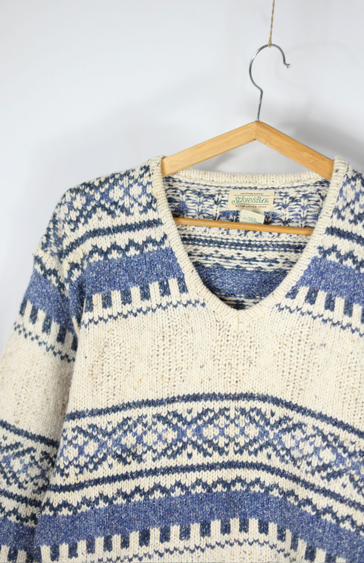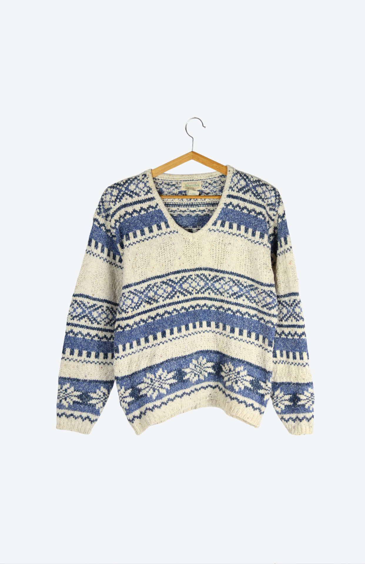 Vintage krémový svetr s modrými norskými vzory. Má středně silný úplet a výstřih do V. Pěkně zpracované detaily i vzor.