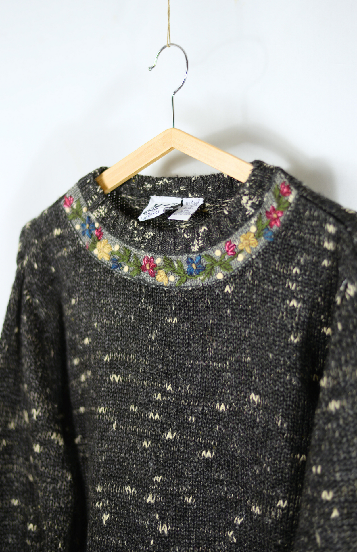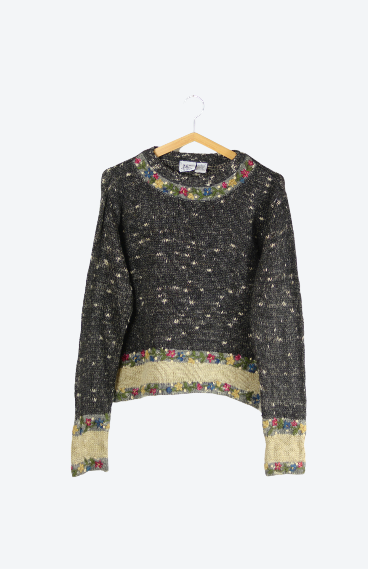 Vintage svetr s krémovým žíháním a leme s vyšívanými kvítky. Má lehce nabíraný rukáv a středně silný úplet. Originální a pěkně zpracovaný.