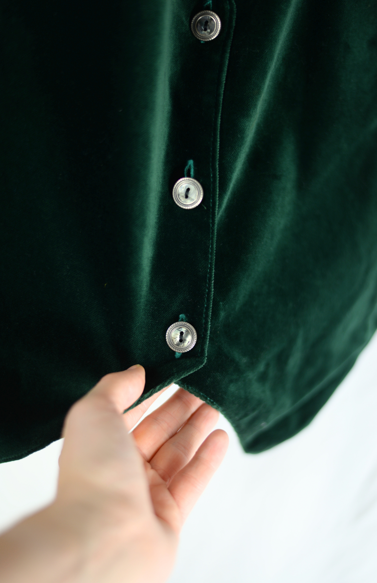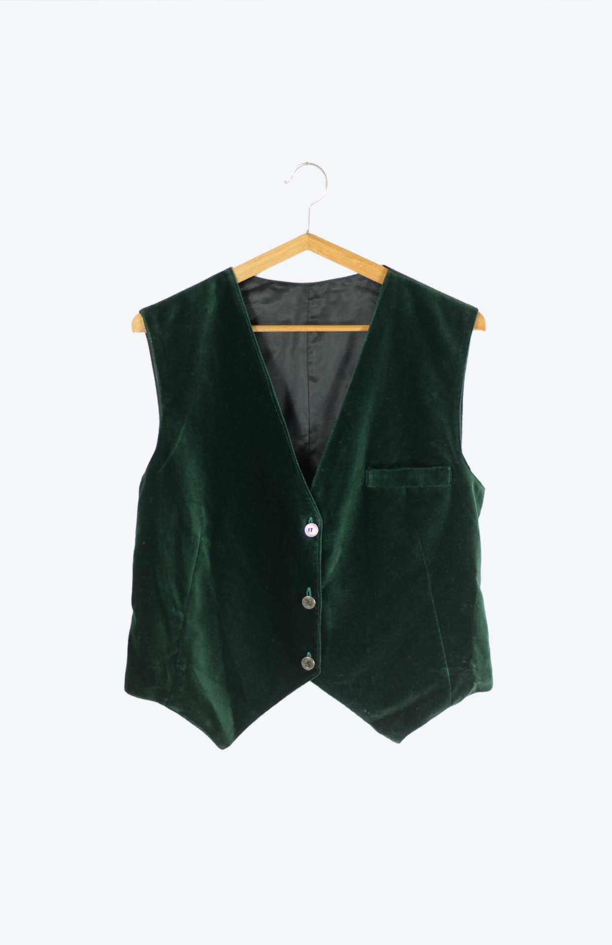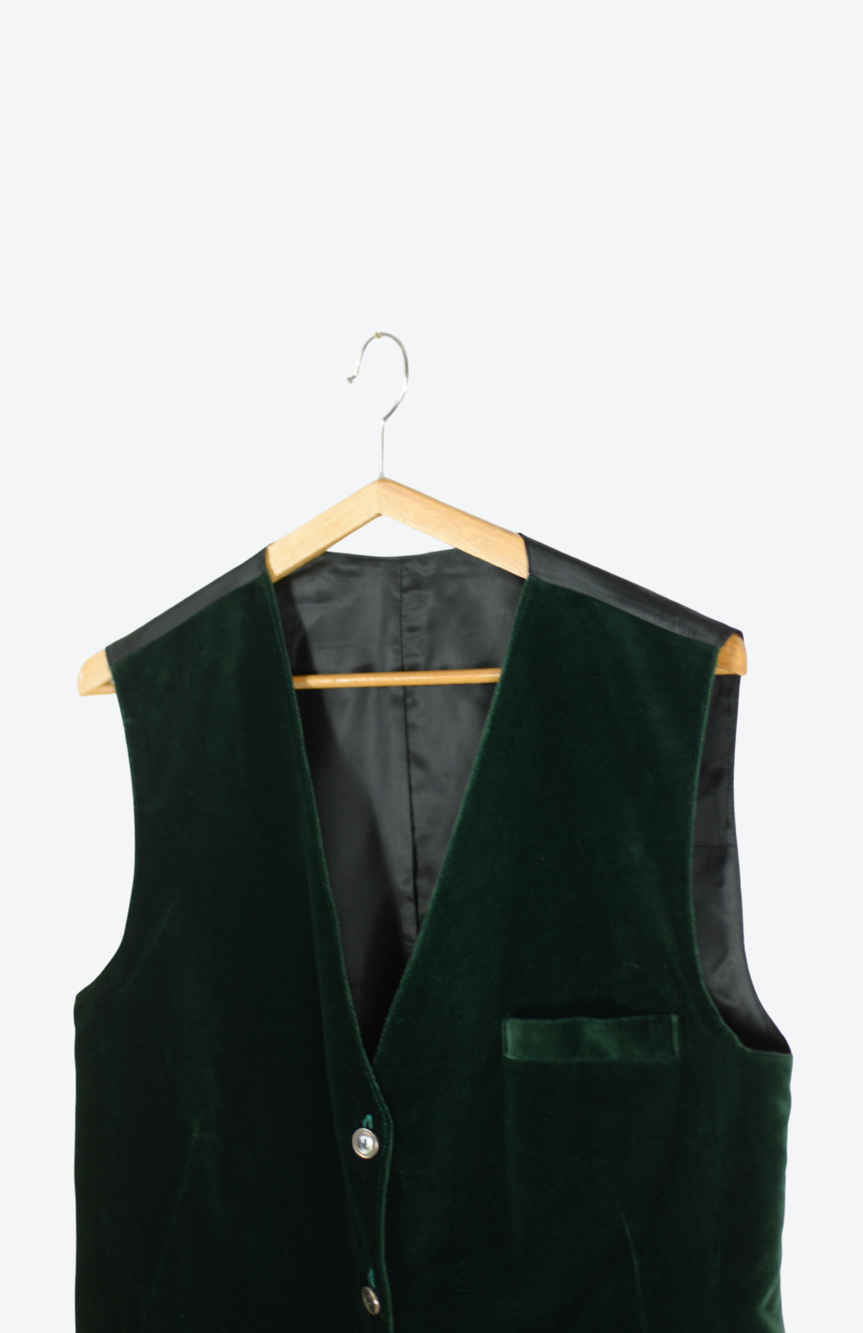 Tmavě zelená sametová vesta. Má saténovou černou podšívku i záda. Propínací na stříbrné zdobené kovové knoflíčky.
