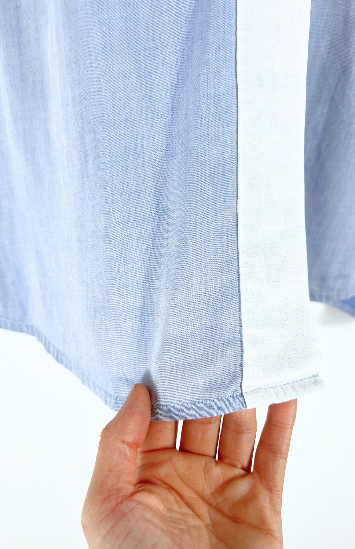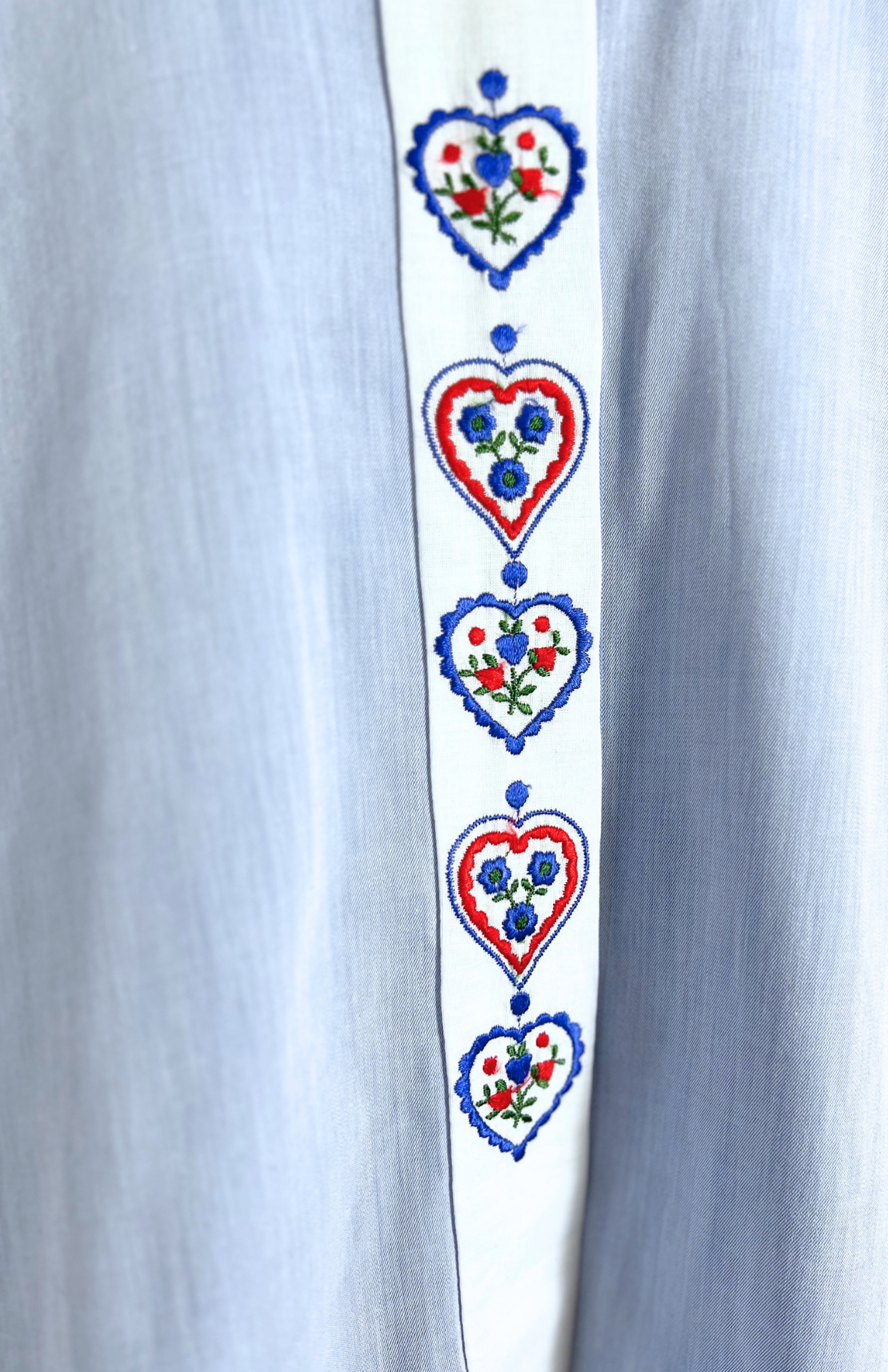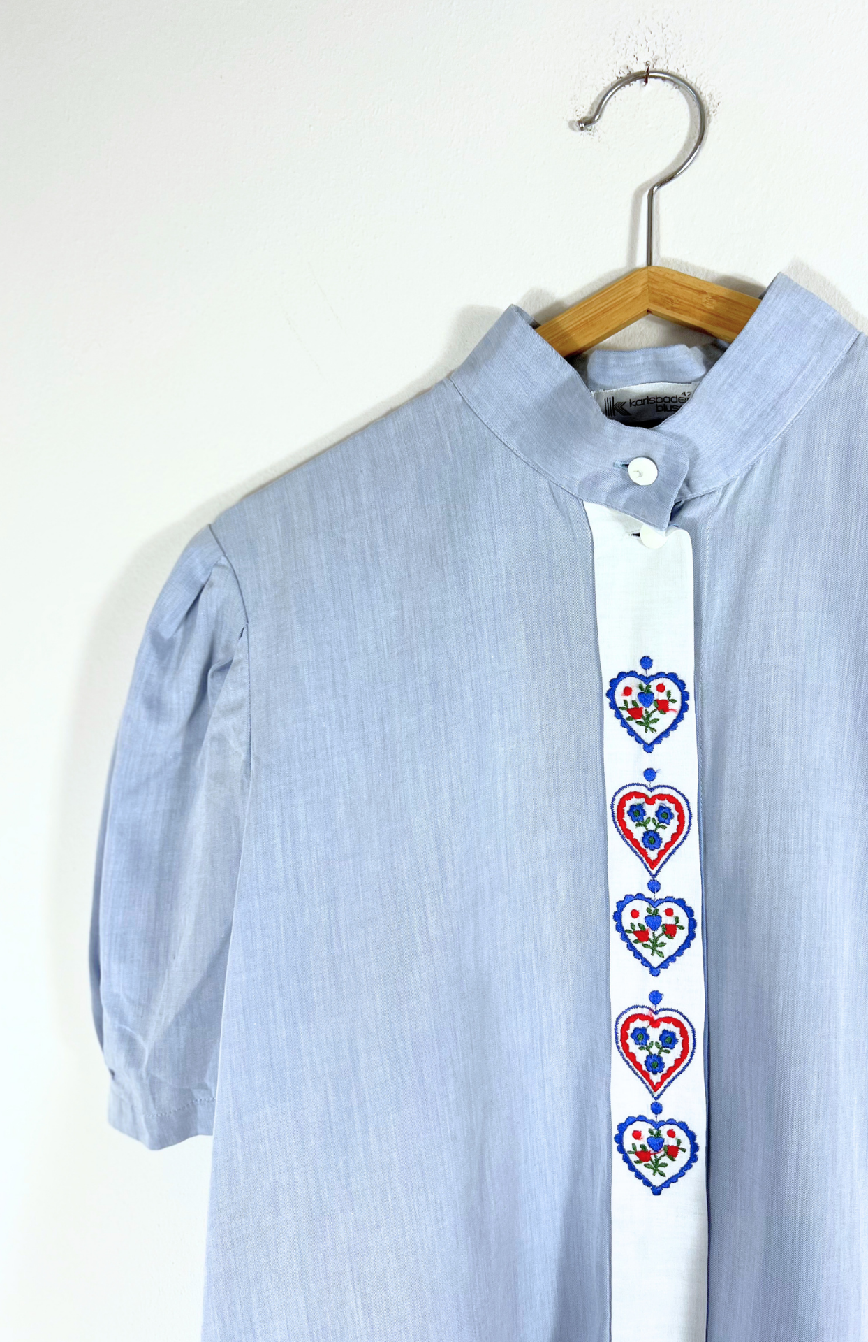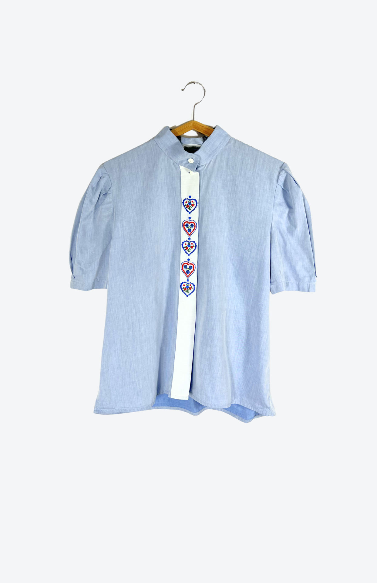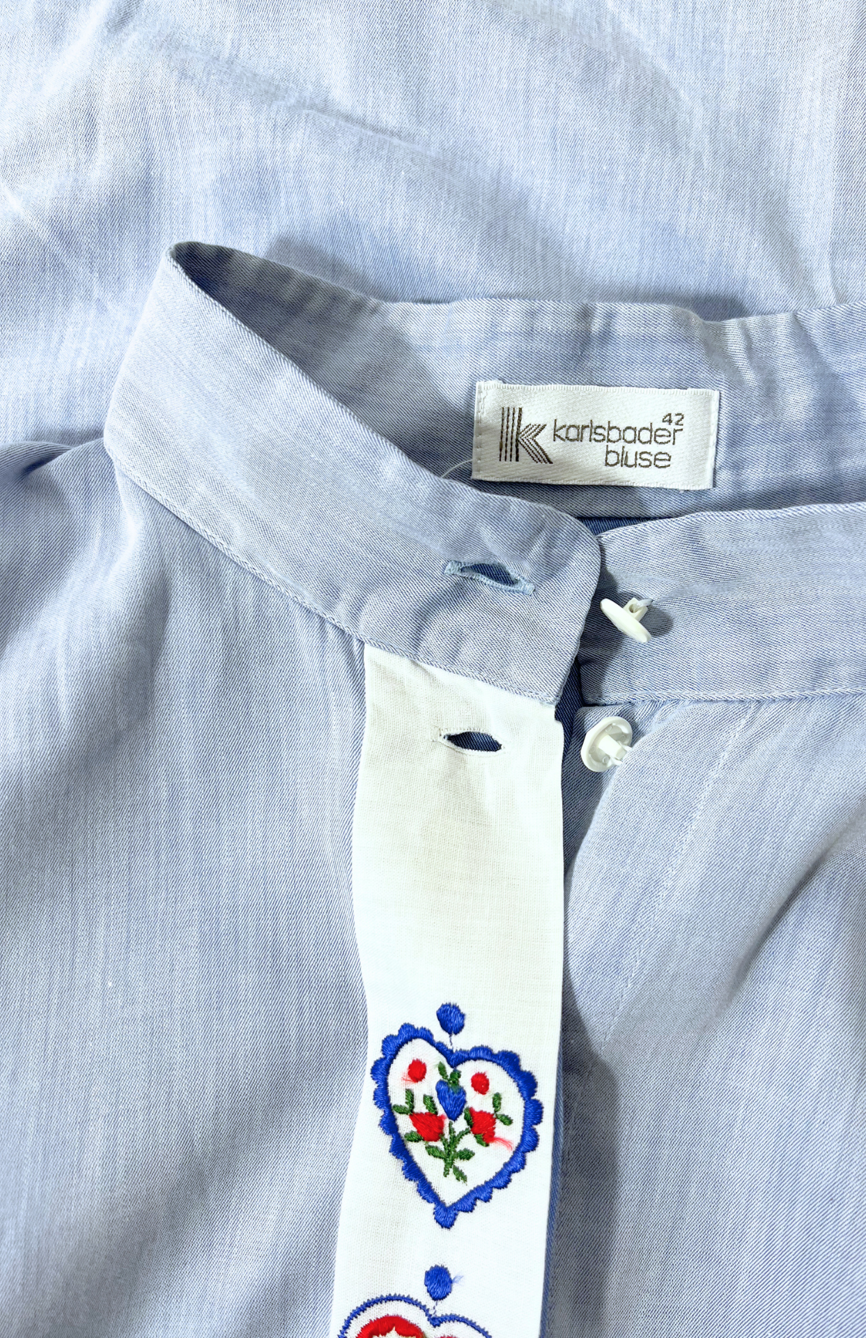 Vintage světle modrá košile s výšivkami. Má jemně nabíraný rukáv a střih ke krku. Zapíná se na skryté knoflíčky.