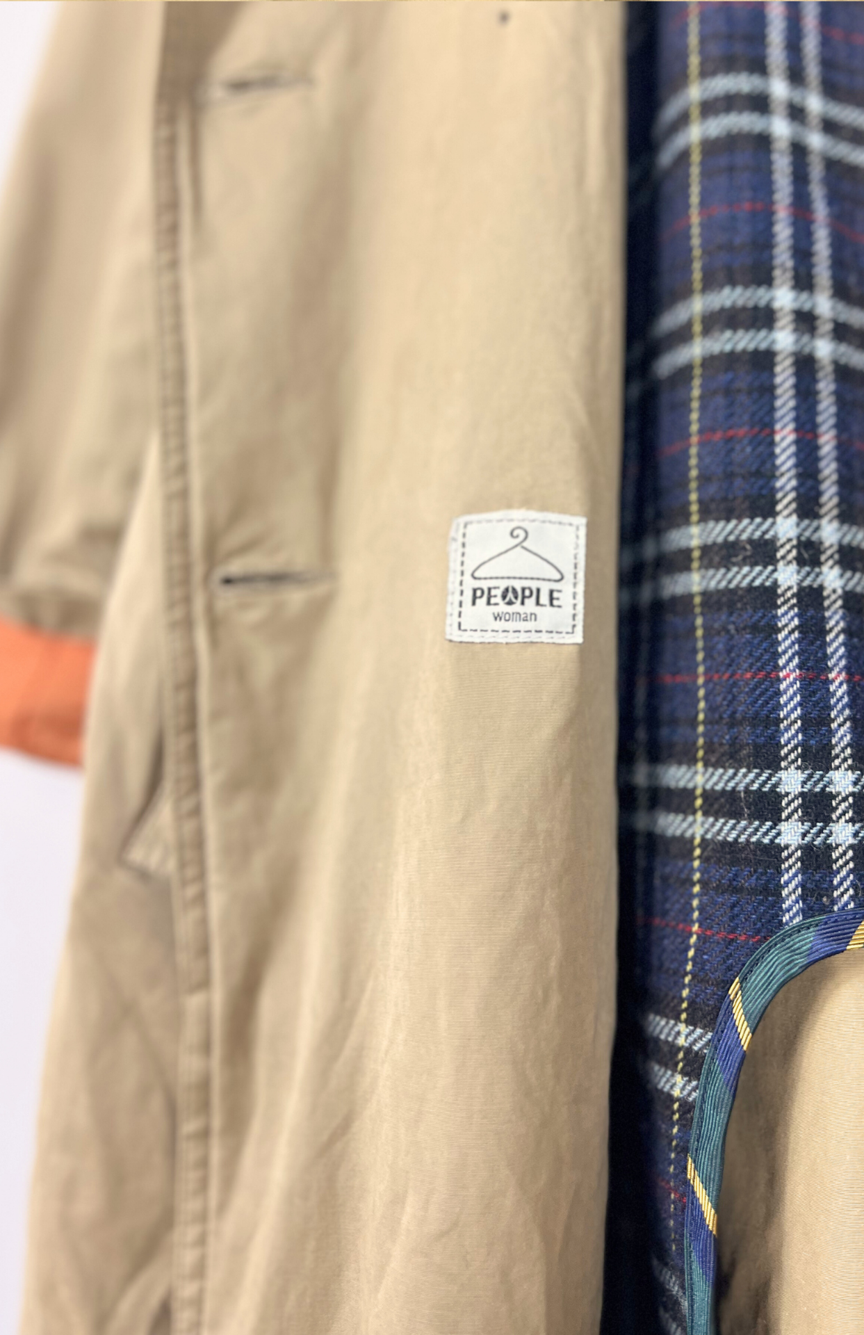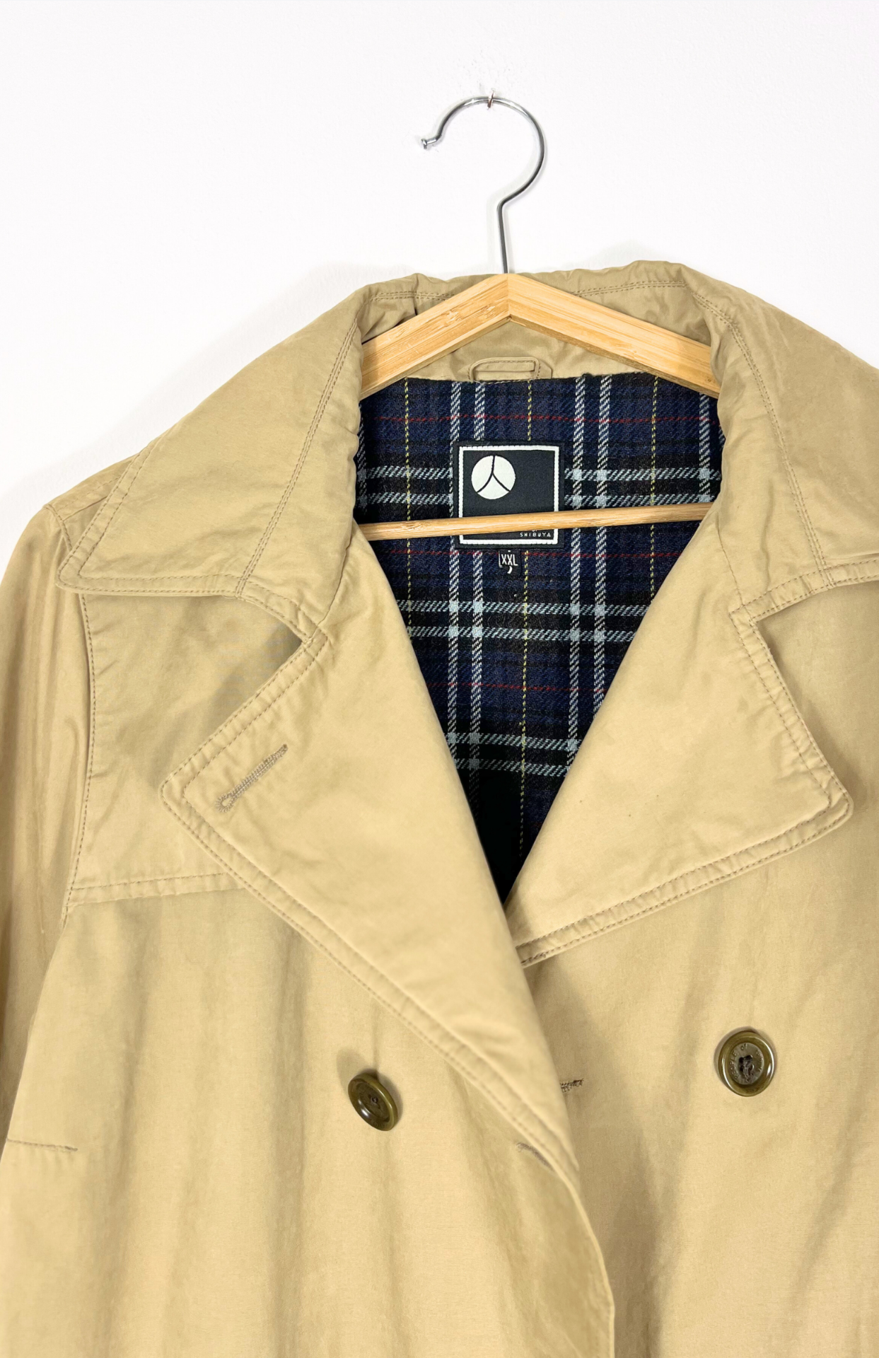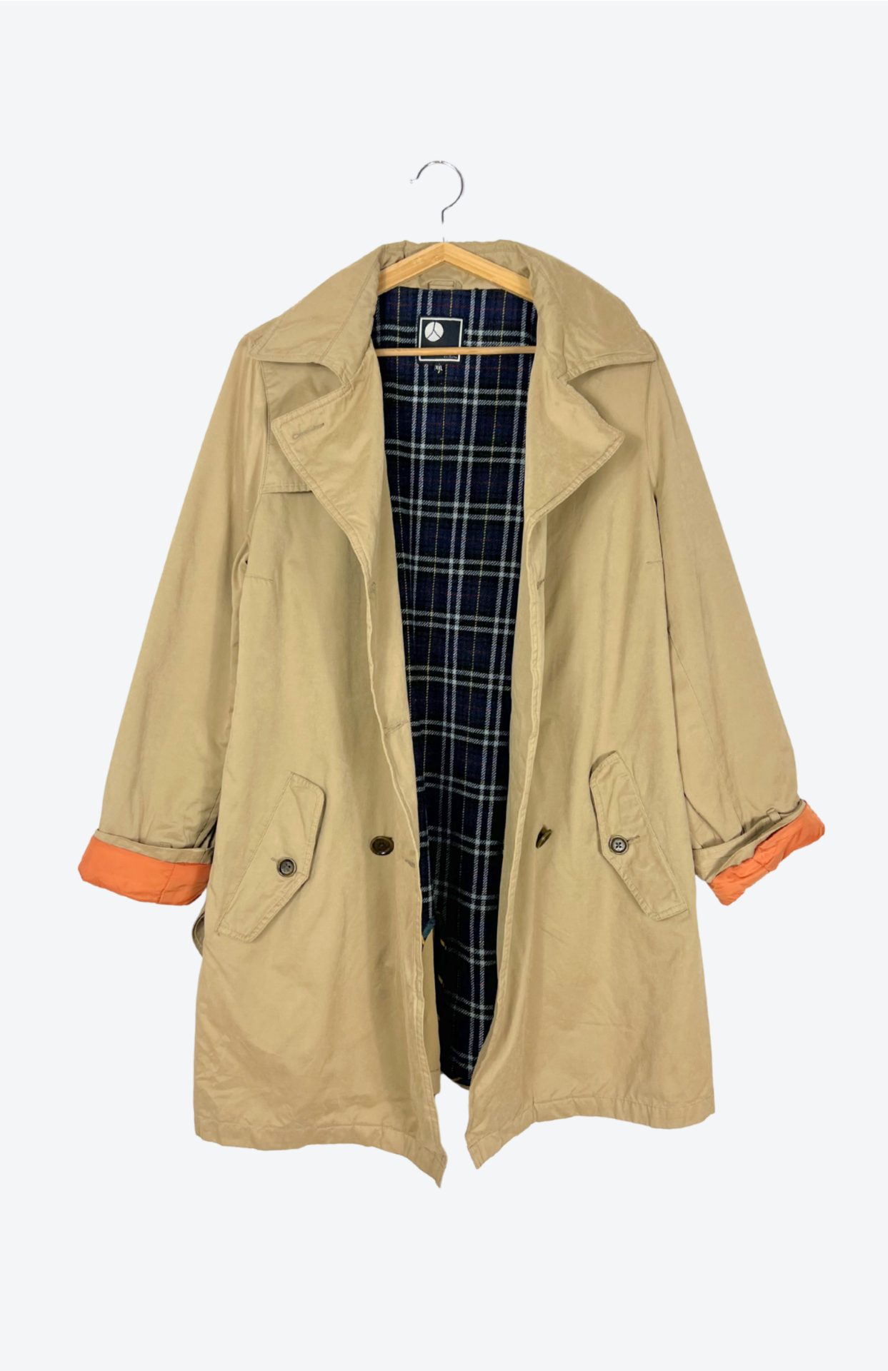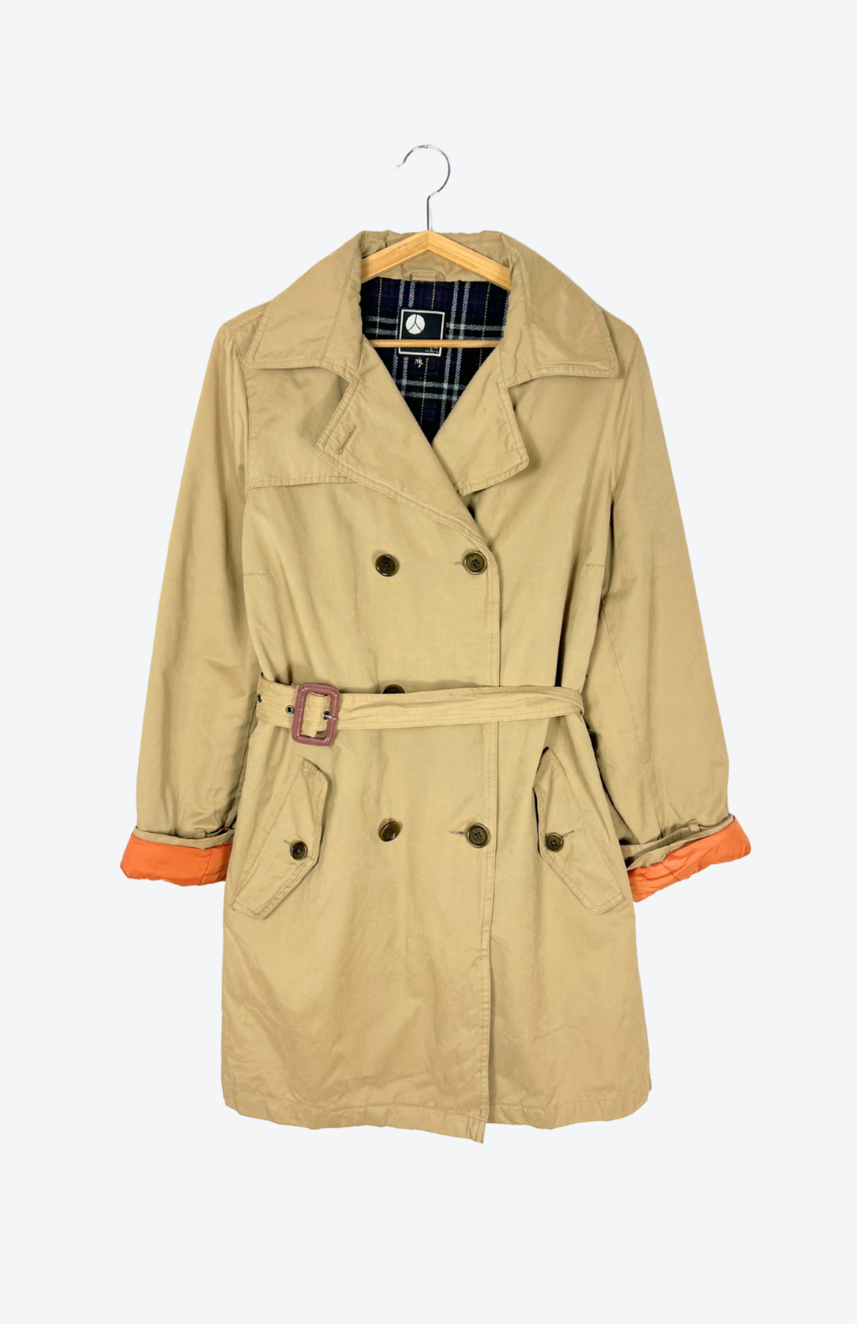 Vintage teplejší trench coat zateplený kostkovanou vlněnou podšívkou. Má možnost ohrnout si rukávy a doplnit je oranžovým lemem. Odnímatelný pásek v pase, kapsy po stranách. Pěkně zpracovaný. Unisex kousek.