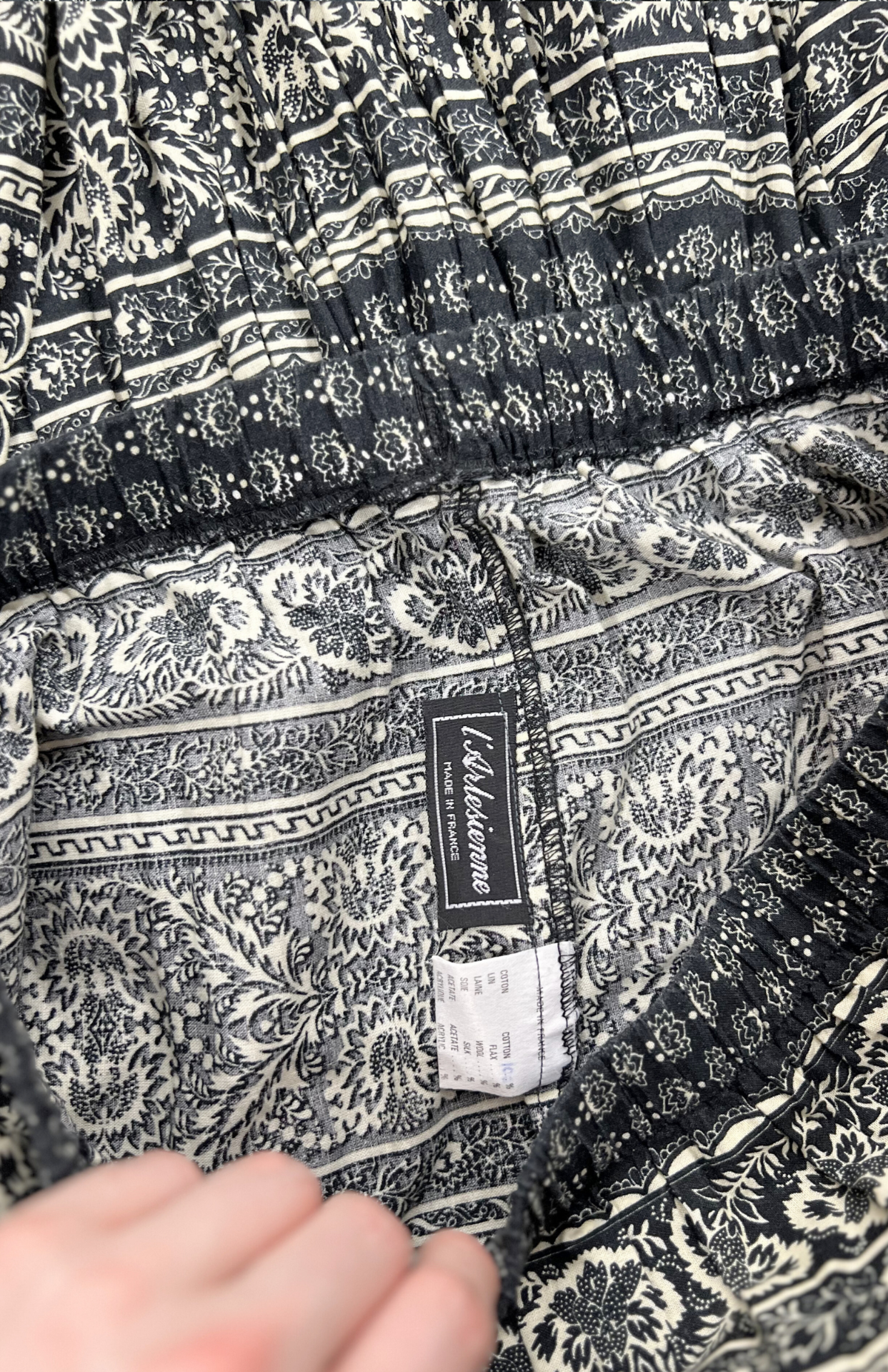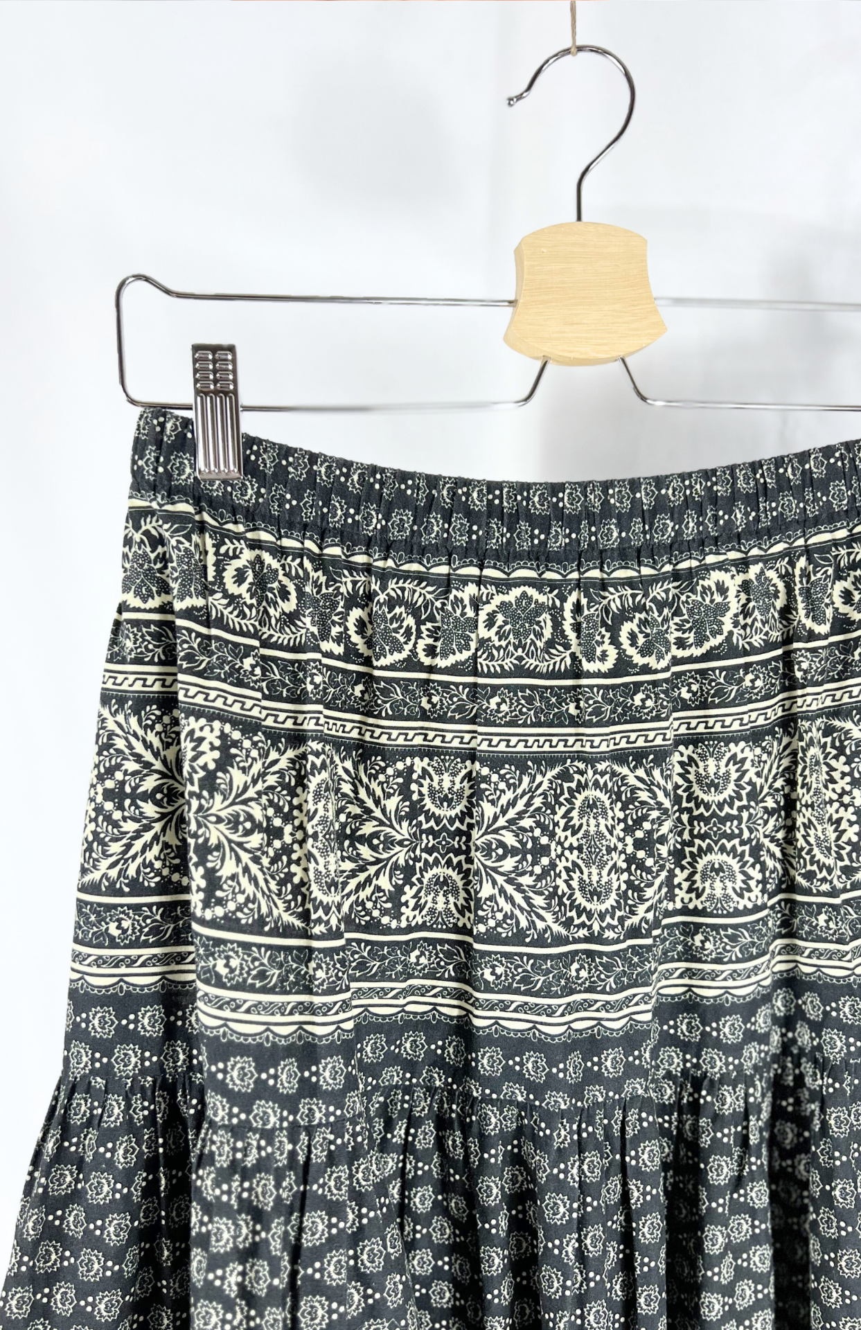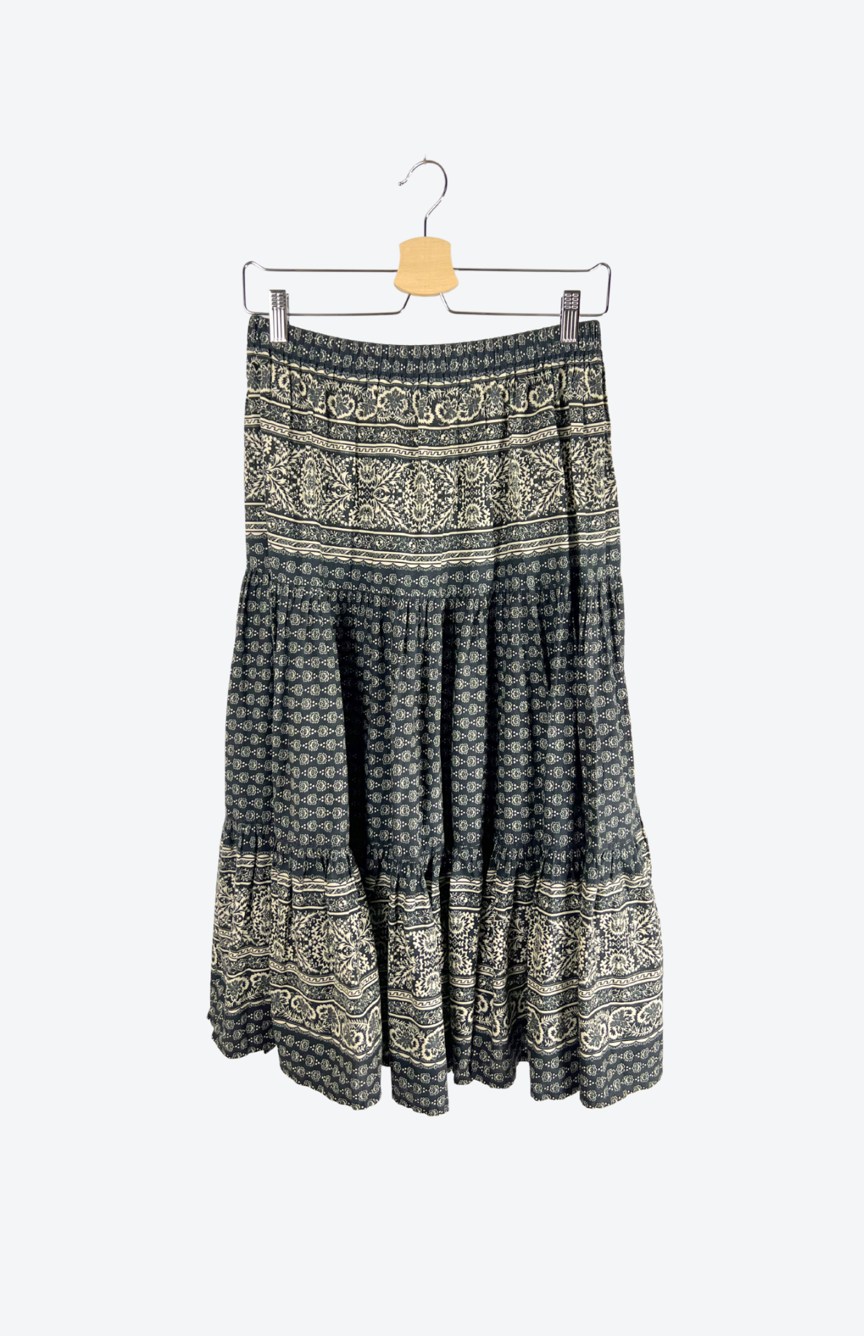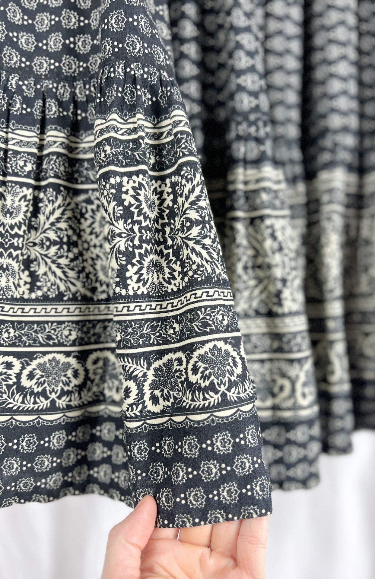 Vintage dlouhá sukně s drobnými ornamenty a květy. Má pružný pas a střih s postupným volánem. Velmi pěkně zpracovaný kousek.