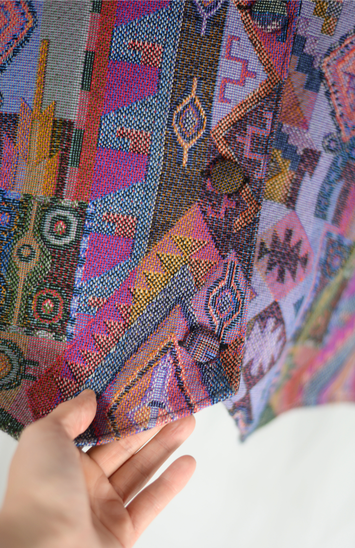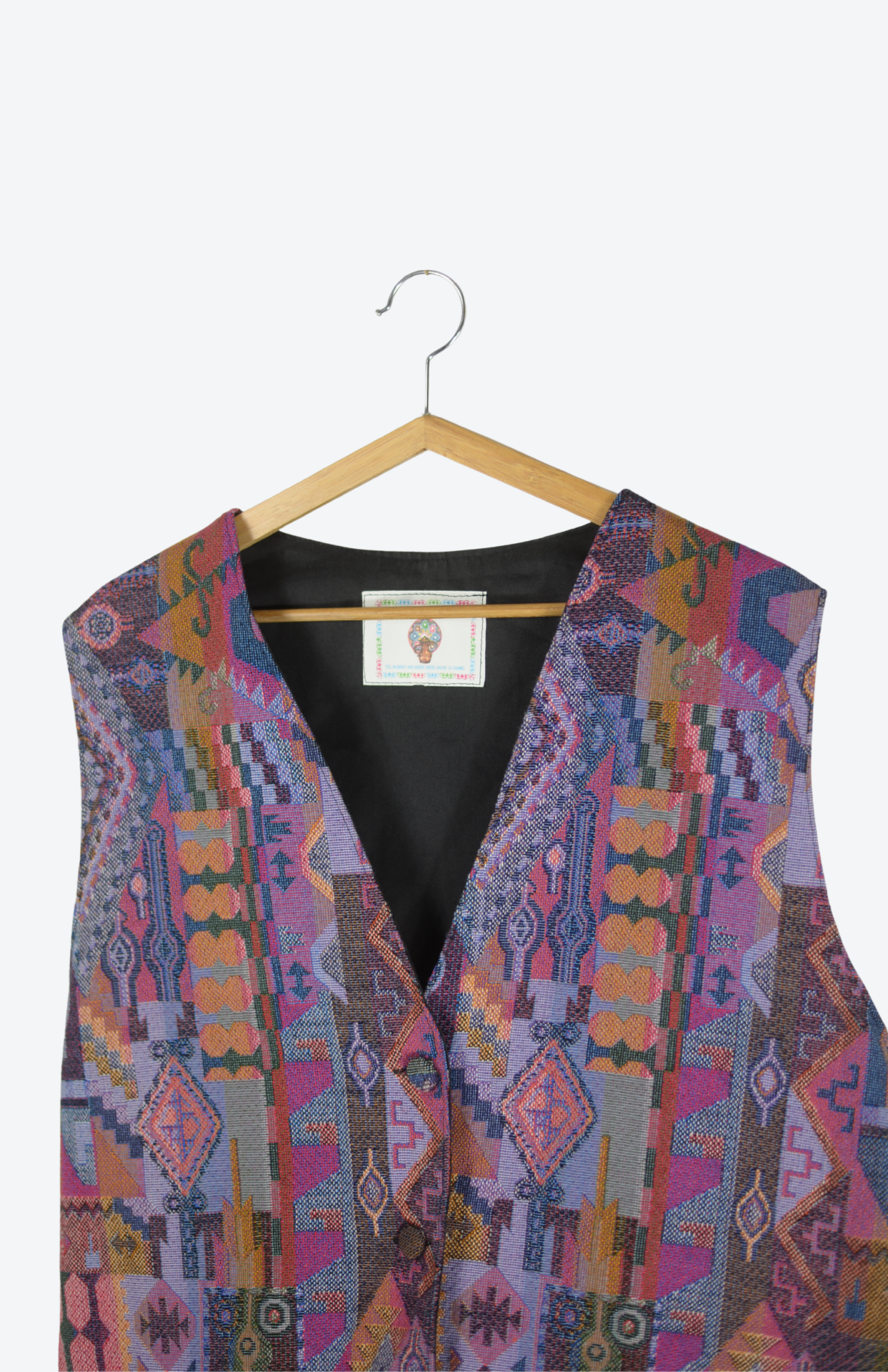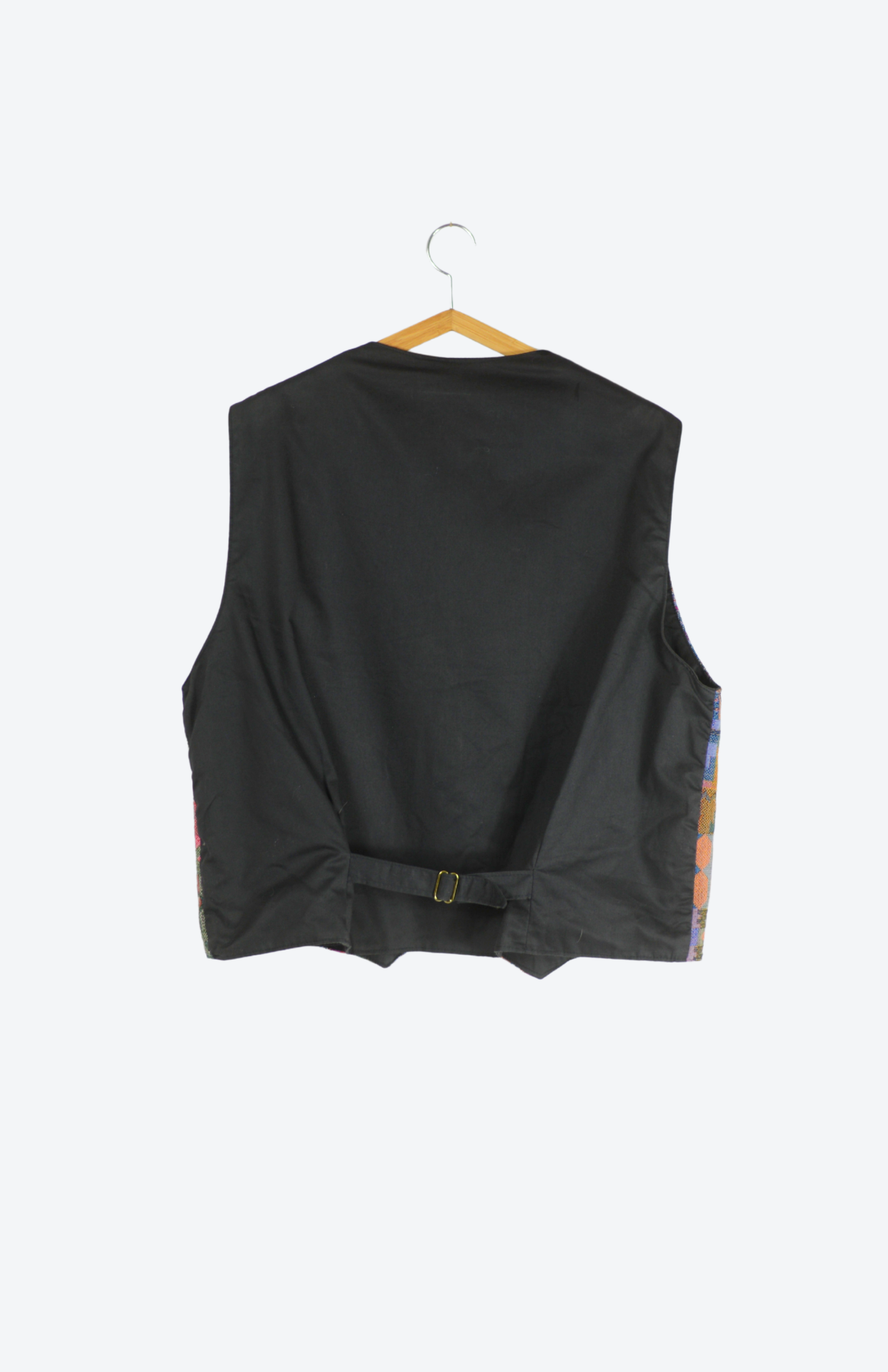 Vesta s funky žakárovým vzorem na přední straně. Má bavlněnou černou podšívku i záda, vzadu s páskem pro přizpůsobení v pase. Silnější materiál, potahované knoflíčky, pěkně zpracovaná.