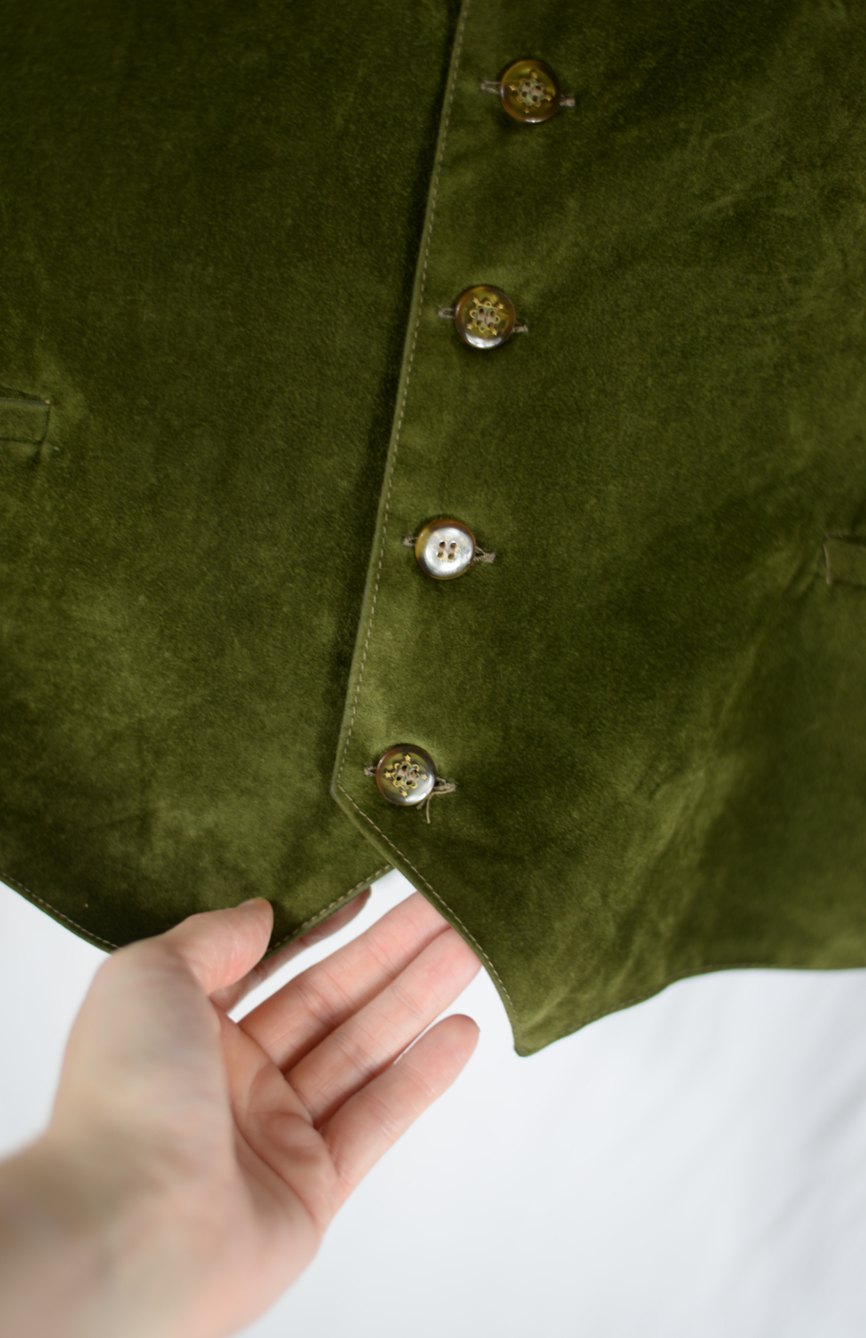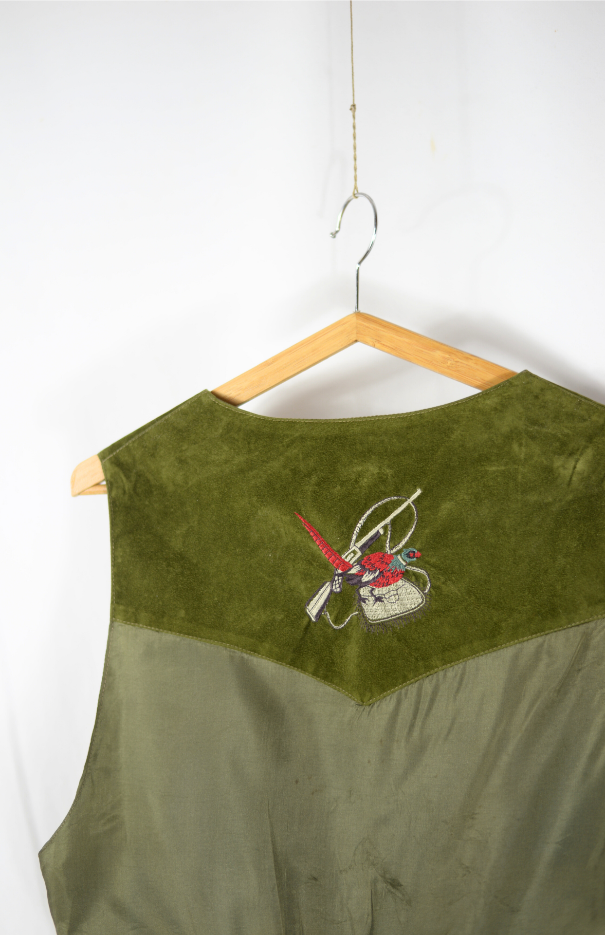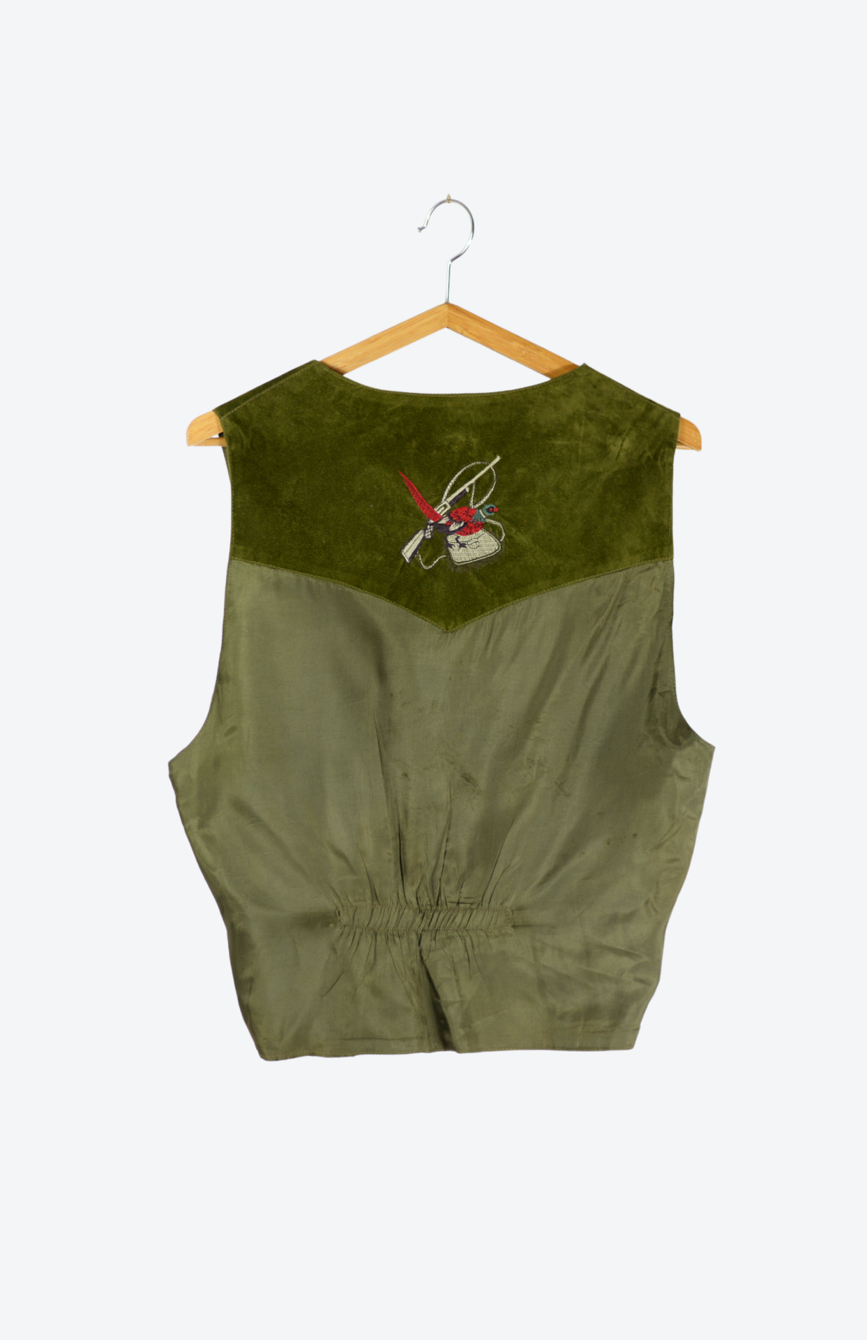 Sametová vesta s výšivkou bažanta a pušky na zádech. Má saténovou podšívku a částečně i záda. Menší kapsy po stranách. Unisex kousek.