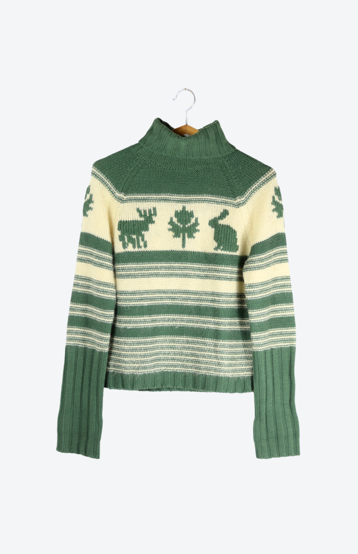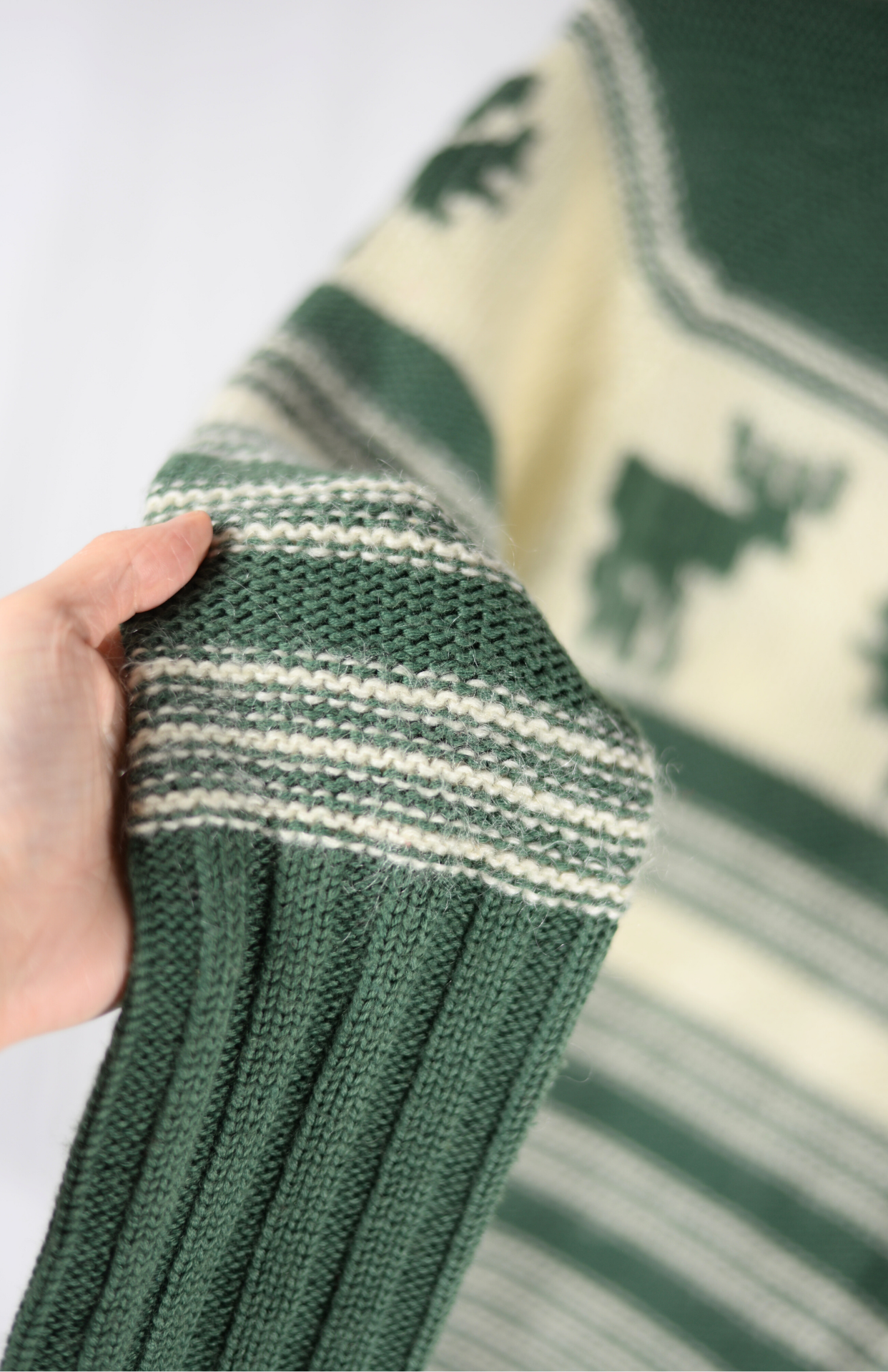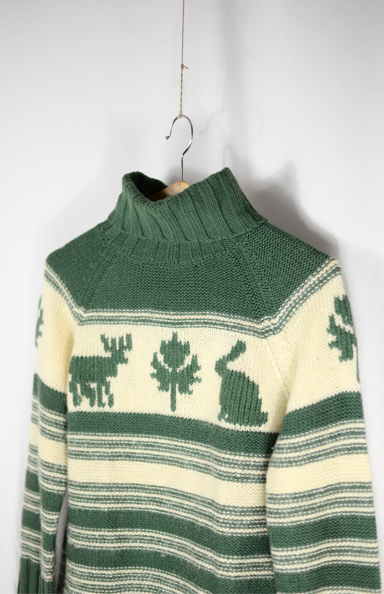 Silnější proužkovaný vintage rolák s vlnou a jemným mohérem. Moc příjemný, hřejivý kousek. Má proužek s losem, králíkem a listem.
