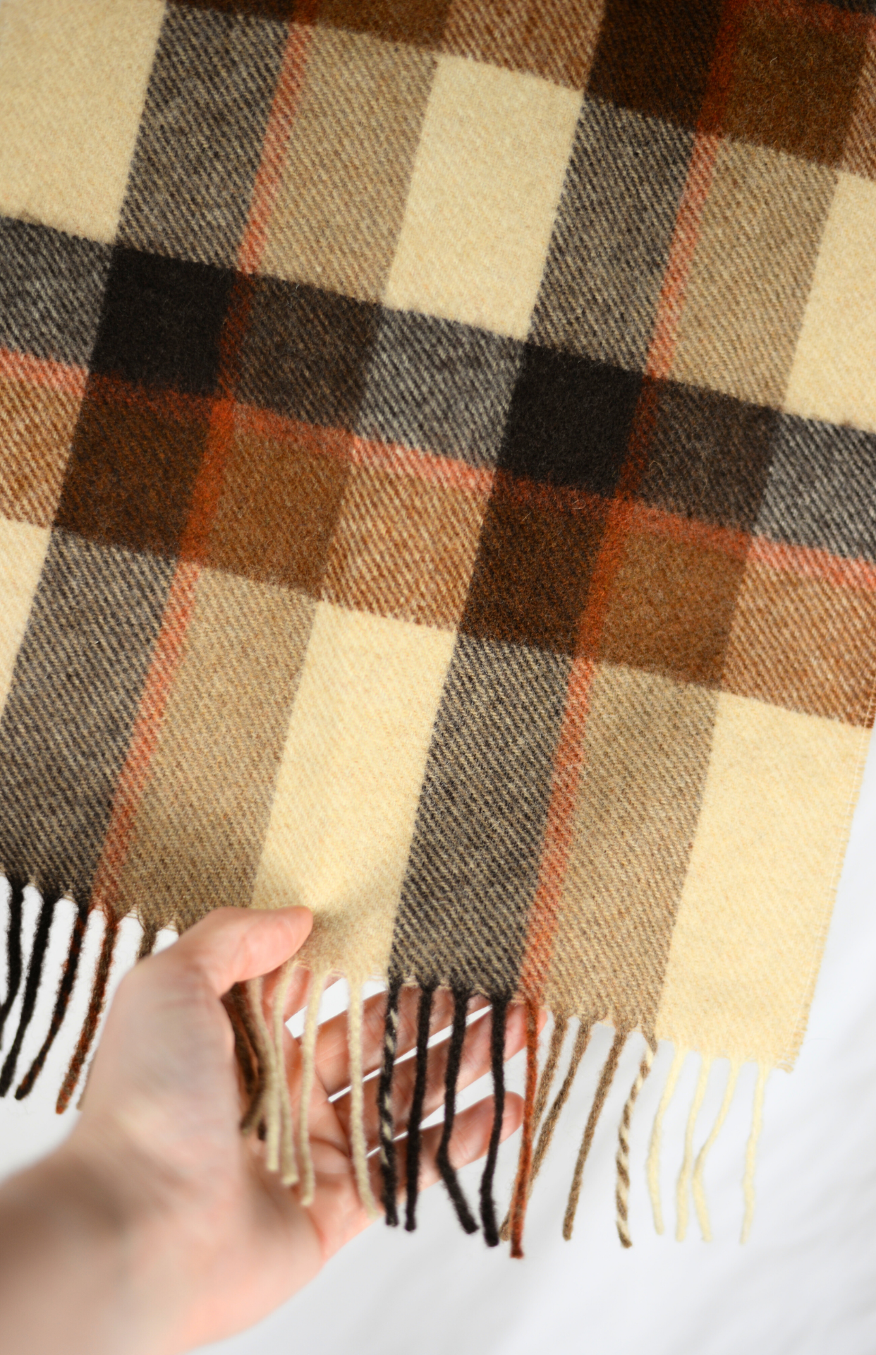 Vlněná beige šála s kostkou. Středně silný teplý úplet a klasické kulaté střapečky.