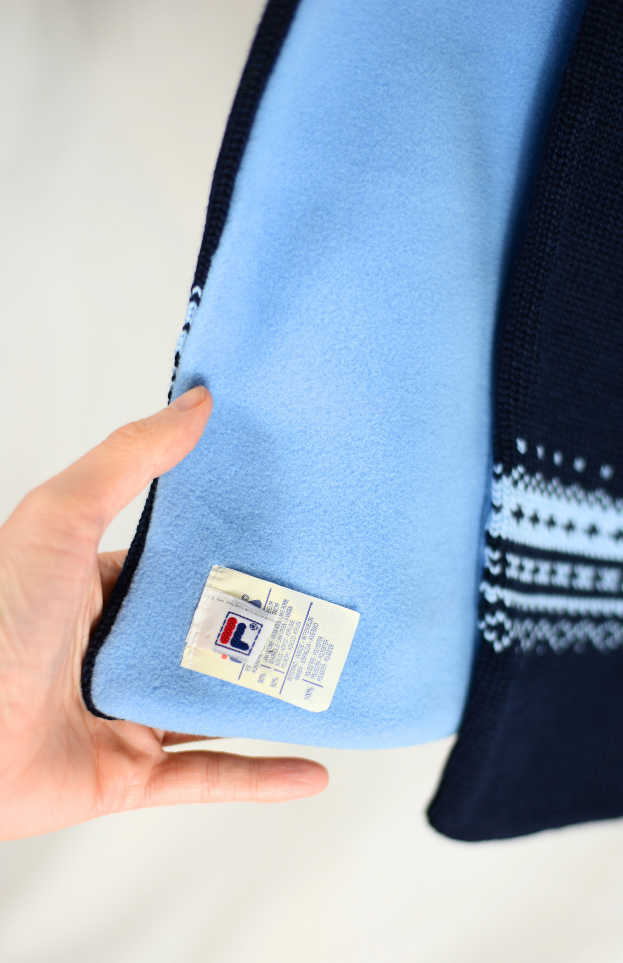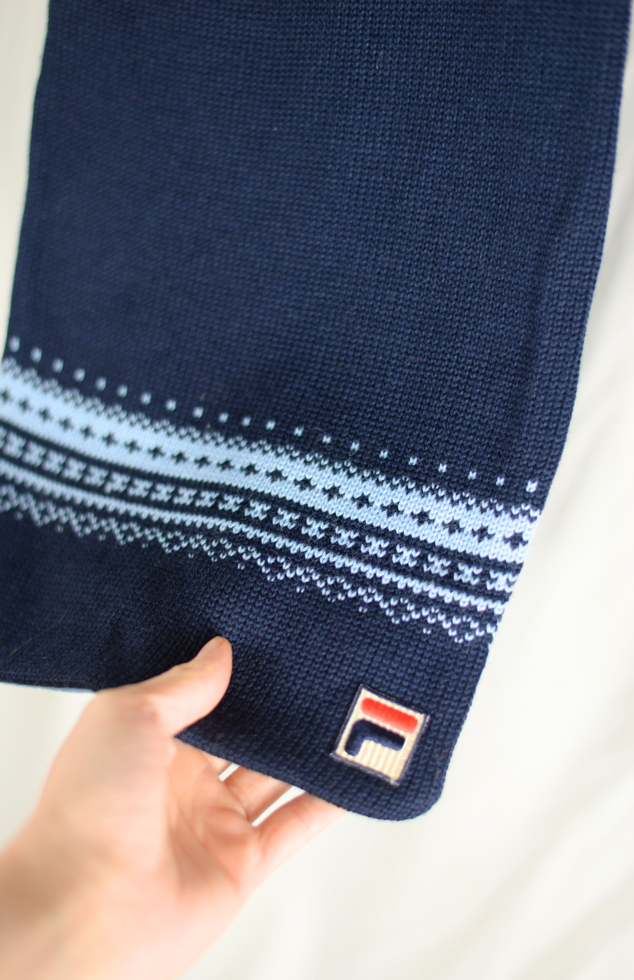 Silná retro šála značky FILA. Z jedné strany silný vlněný úplet, uvnitř světle modrý měkký fleece. Příjemný kousek.