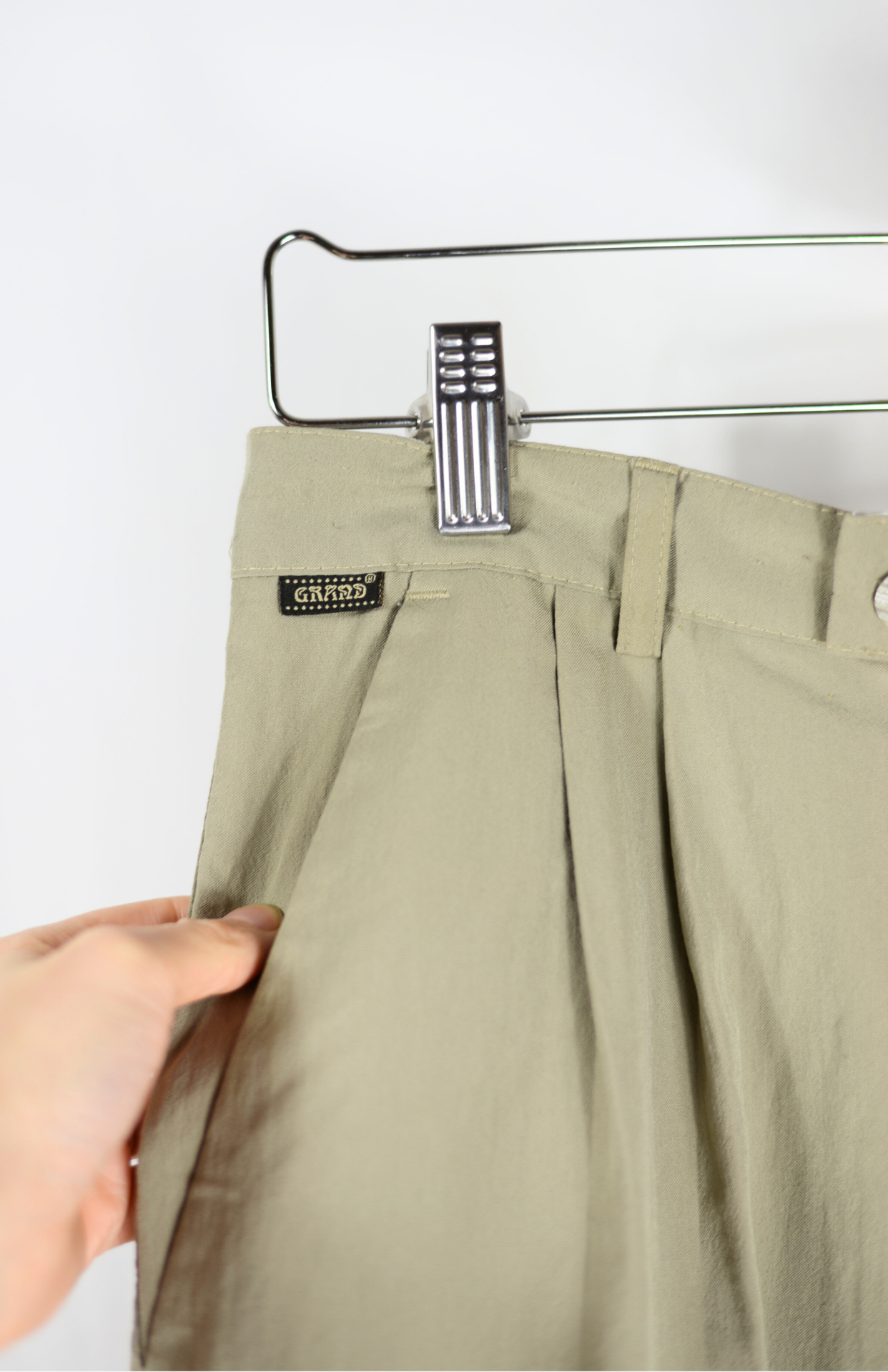 Vlněné elegantní kalhoty do pasu. Lehčí, velmi příjemný kousek. Mají kapsy na bocích a jednu vzadu. Nohavice jsou volnější a s jemnými puky.