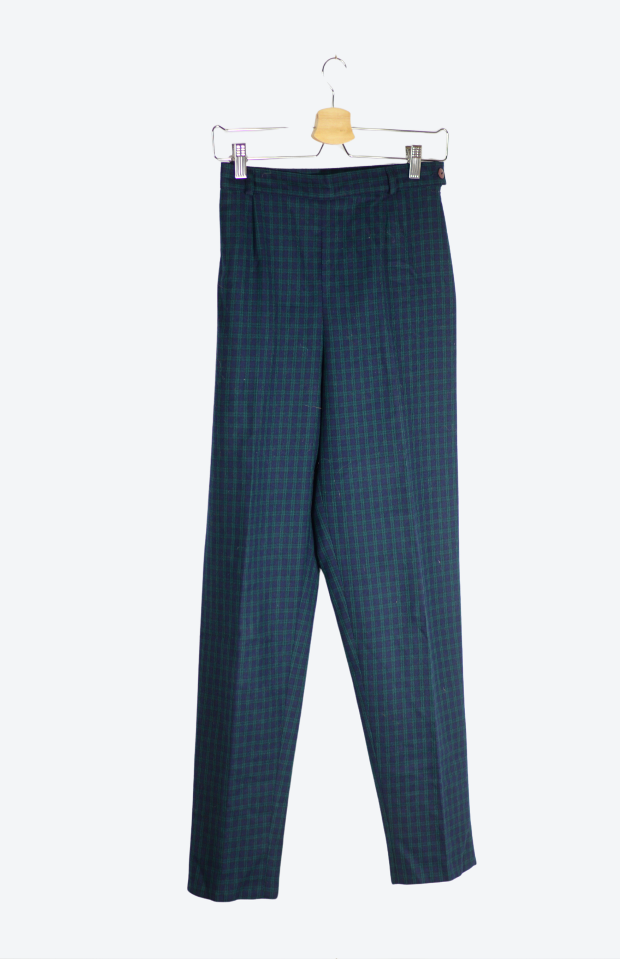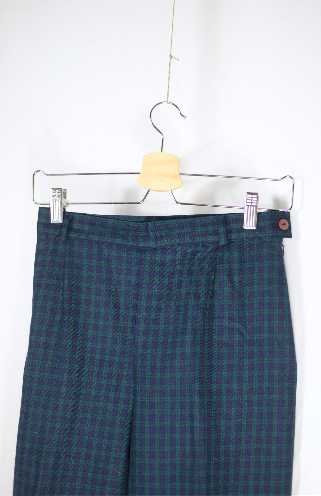 Krásné vlněné vintage kalhoty do pasu. Mají volnější nohavice s jemným pukem. Střední vlněné plátno, velmi příjemný kousek se zapínáním na boku.