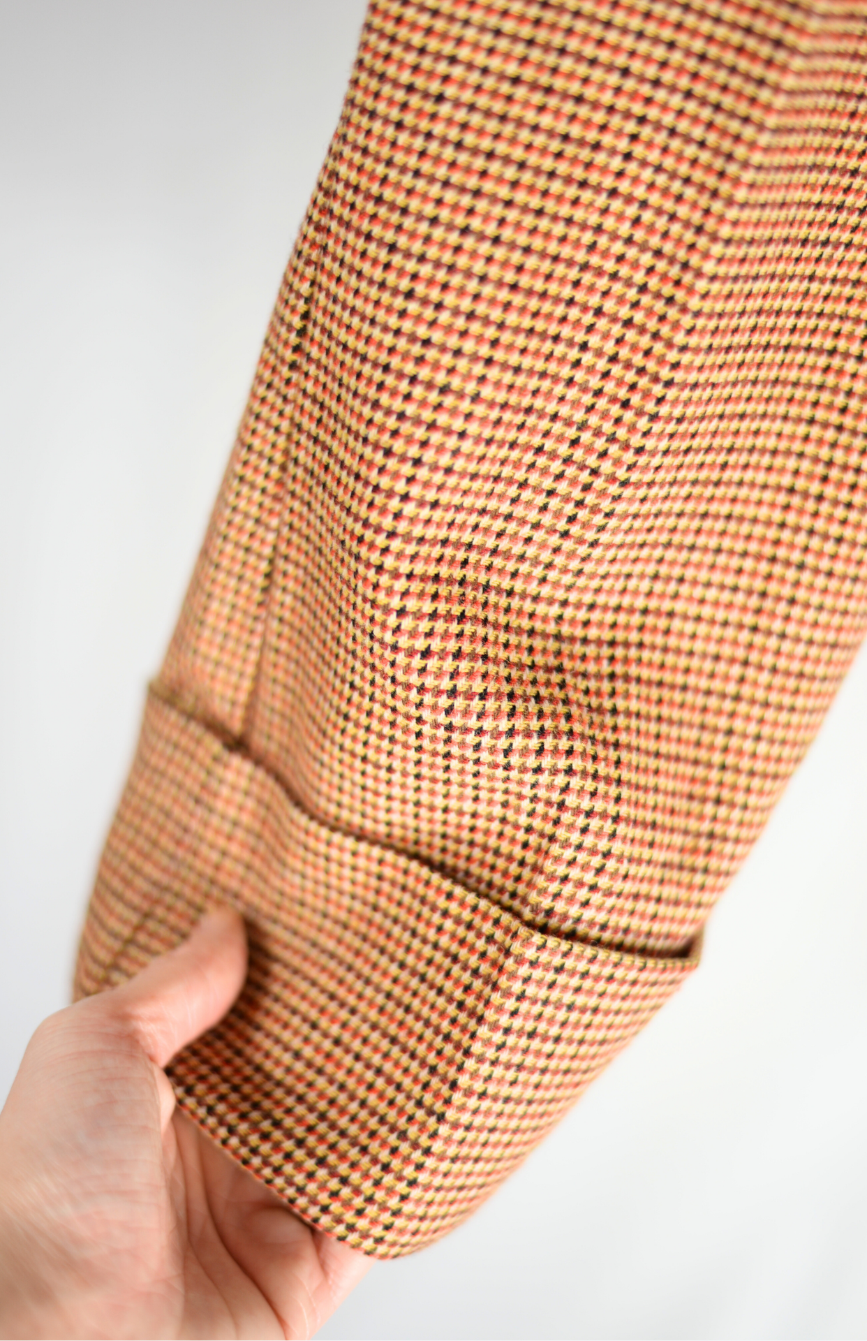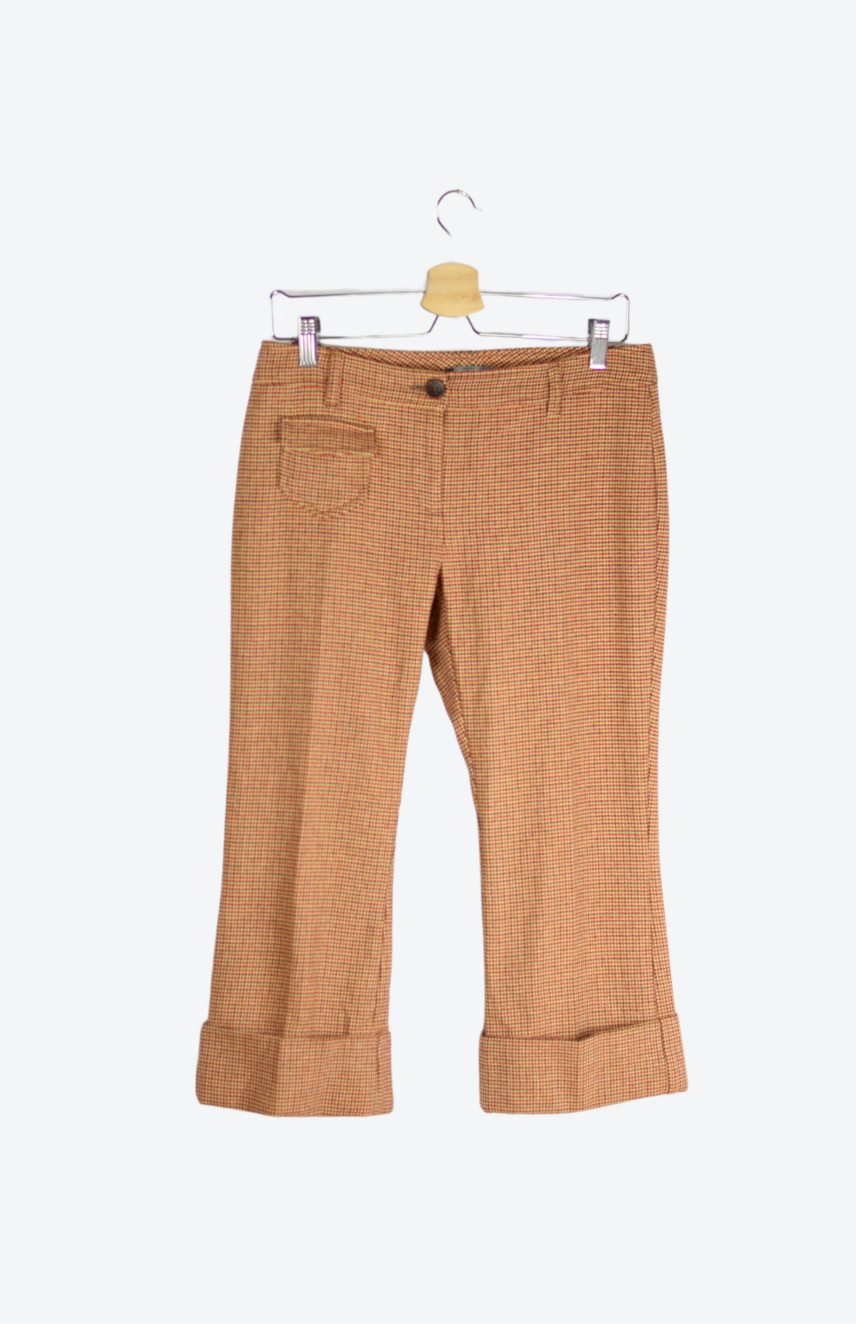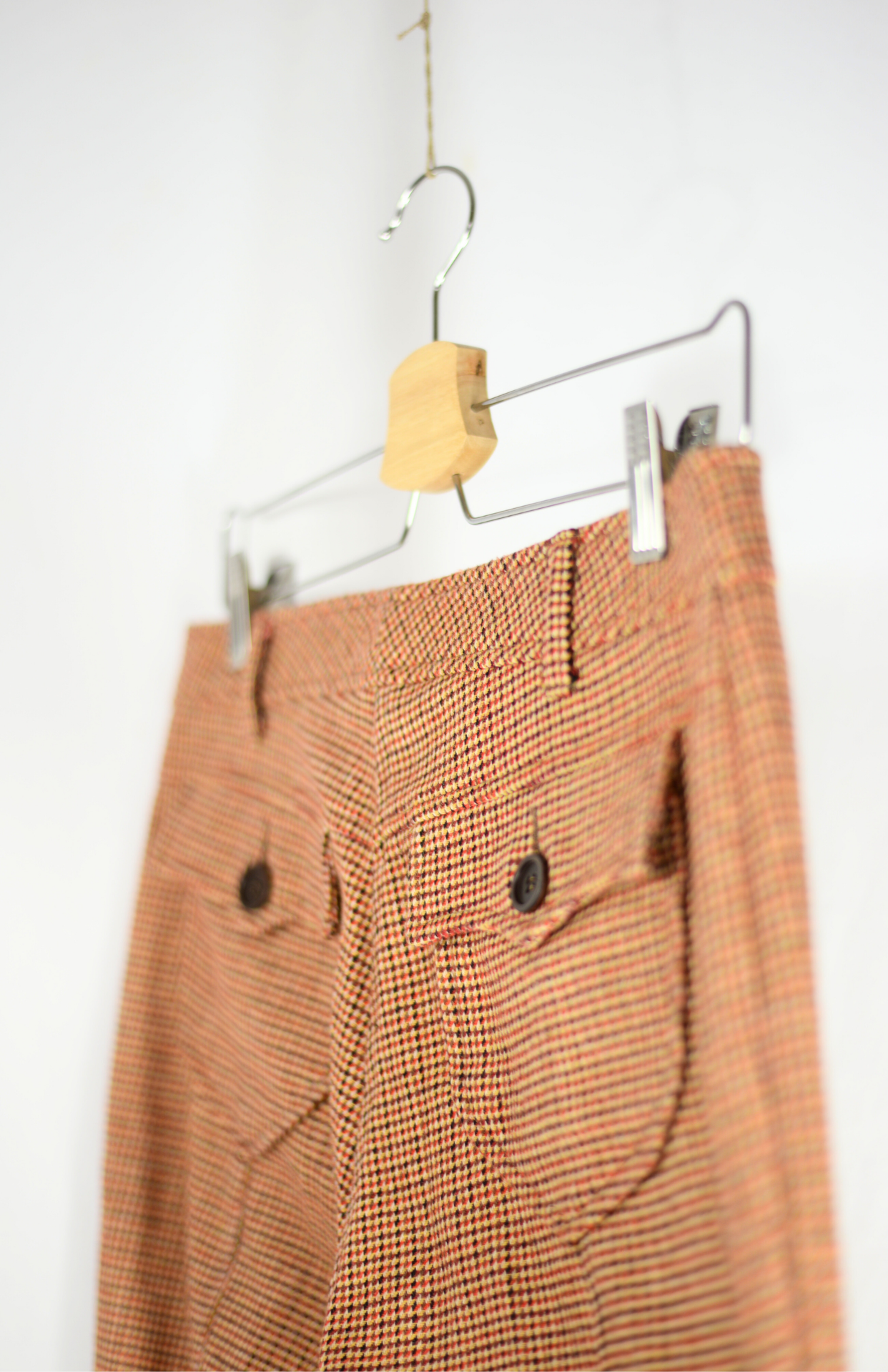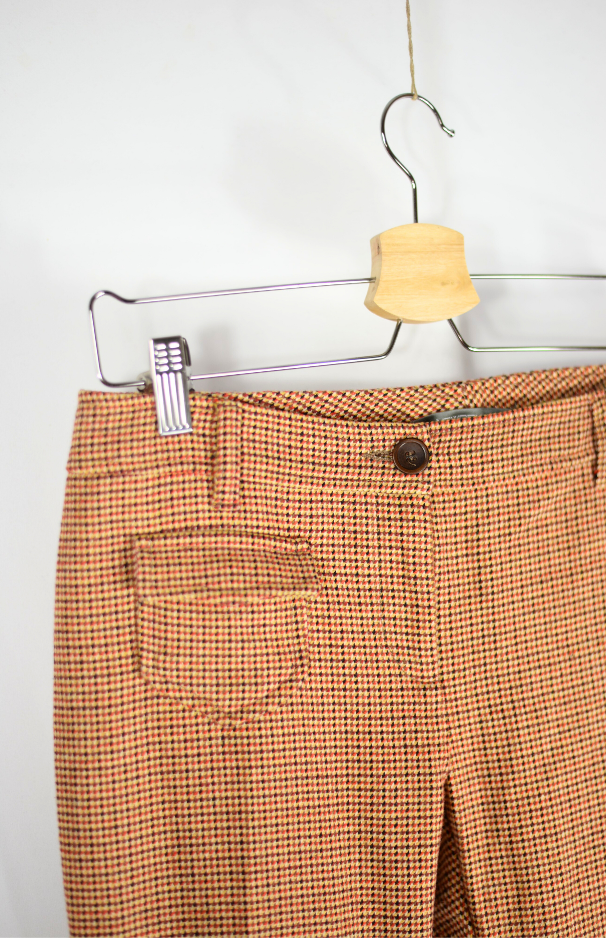 Vlněné vzorované šik vintage kalhoty. Mají kapsy s výraznou klopou vpředu i vzadu. Uhrnuté nohavice a středně vysoký pas. Mají kratší 7/8 střih.