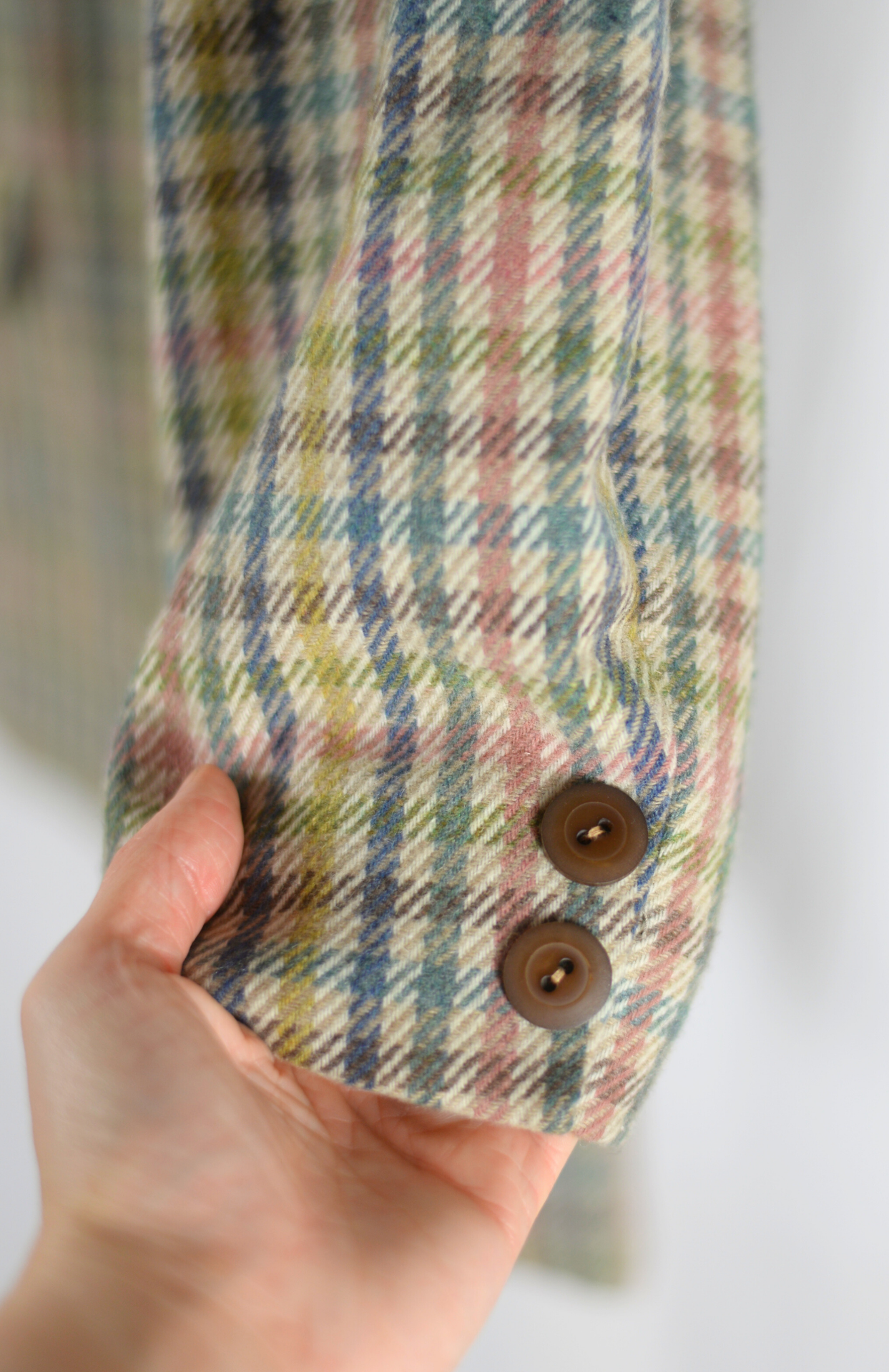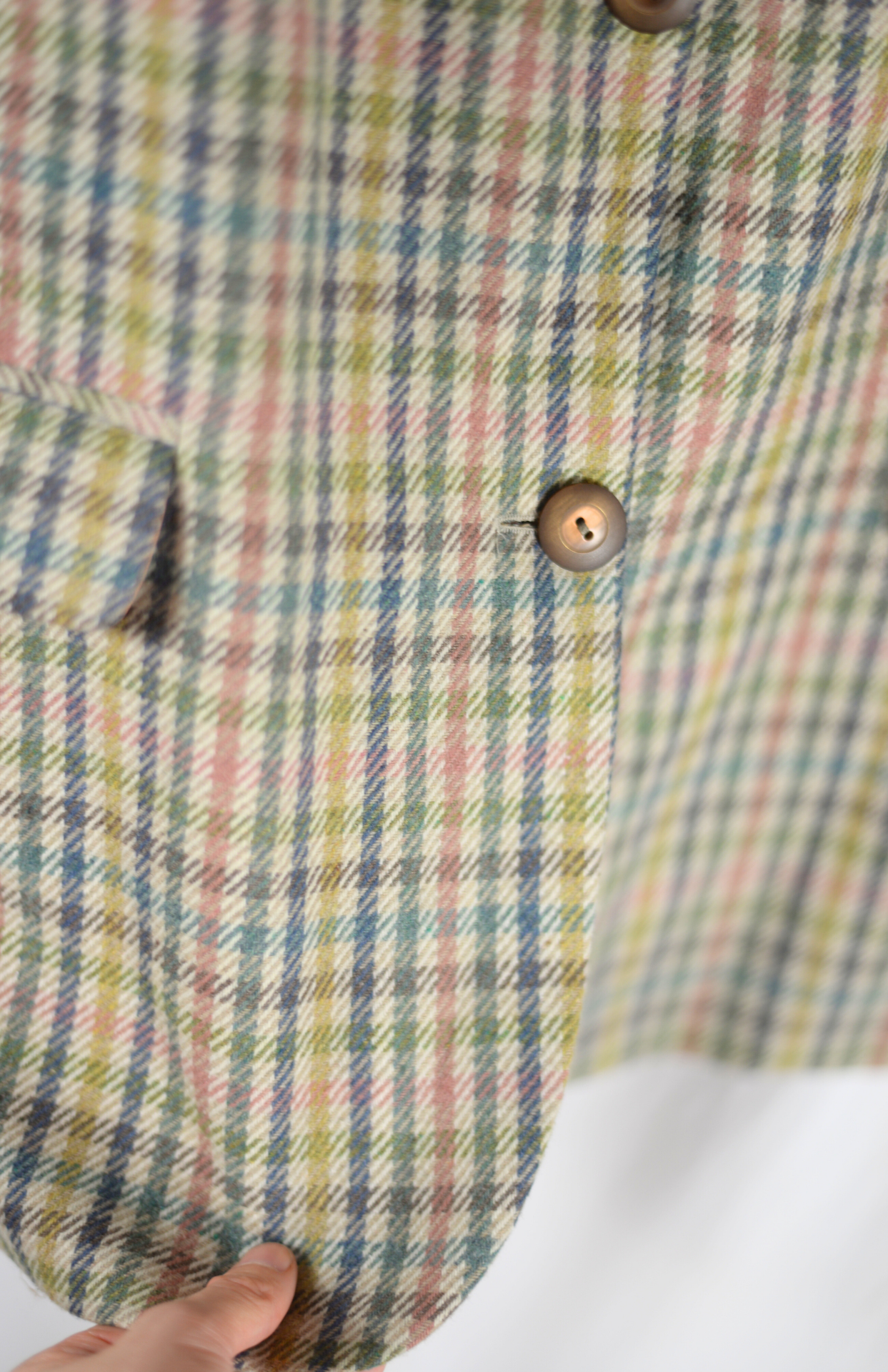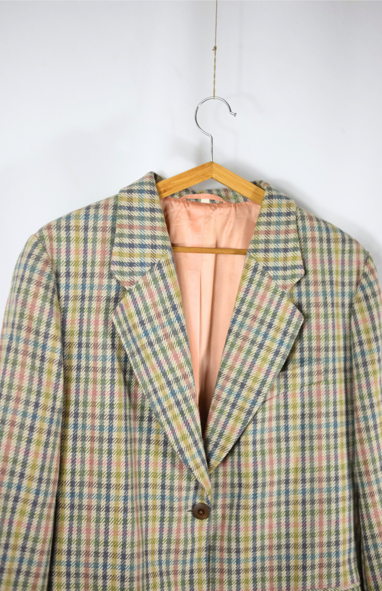 Vlněné vintage sáčko s pastelovými barevnými kostkami. Kvalitní klasický kousek. Má pěknu klopu, kapsy na bocích. Velmi pěkně zpracované. Uvnitř saténová podšívka.