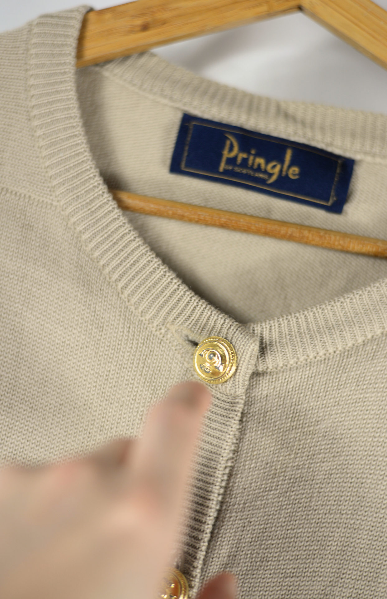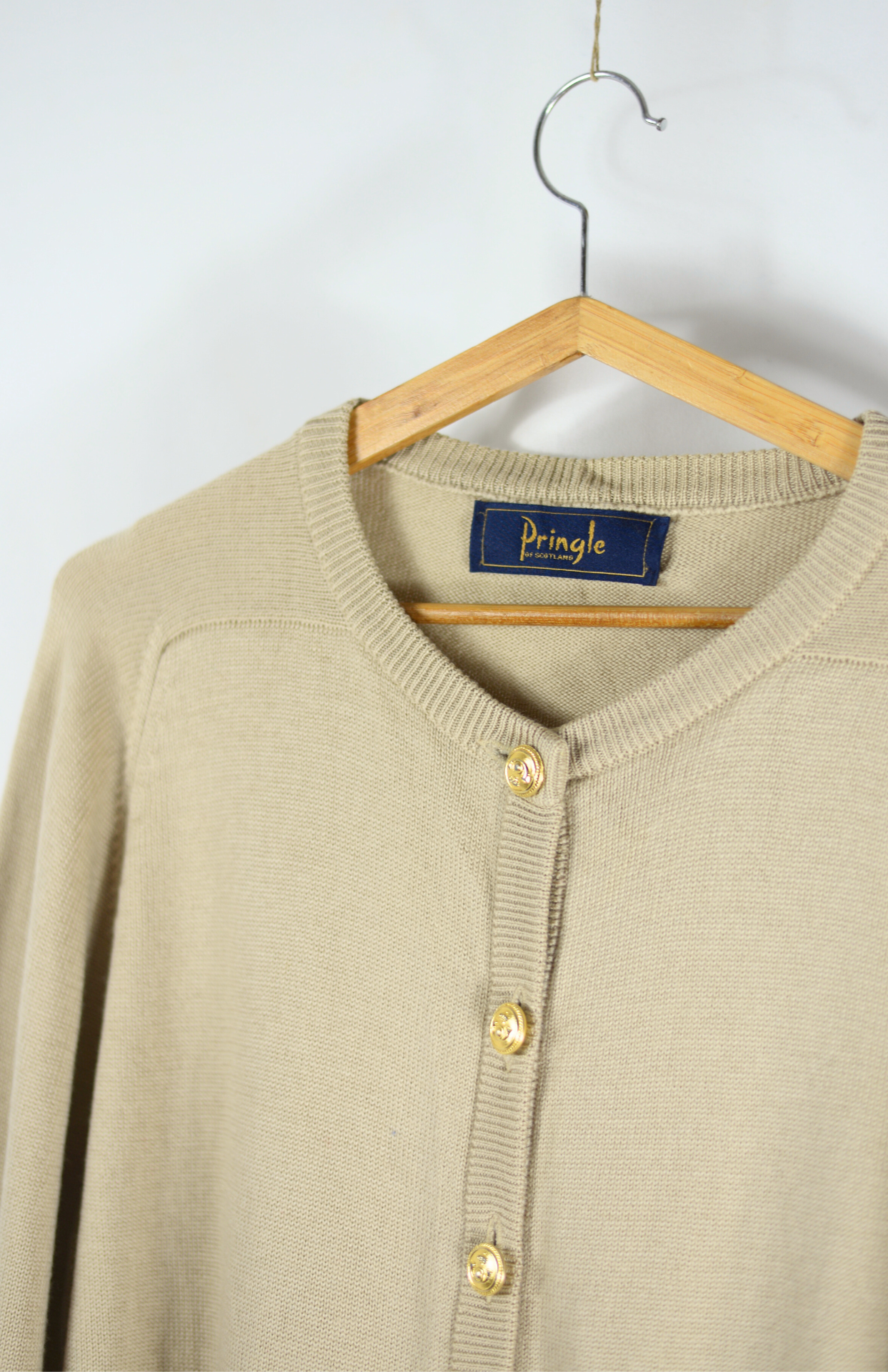 Čistě vlněný beige propínací vintage svetr. Propínací na zlaté zdobené knoflíčky a s kapsami.