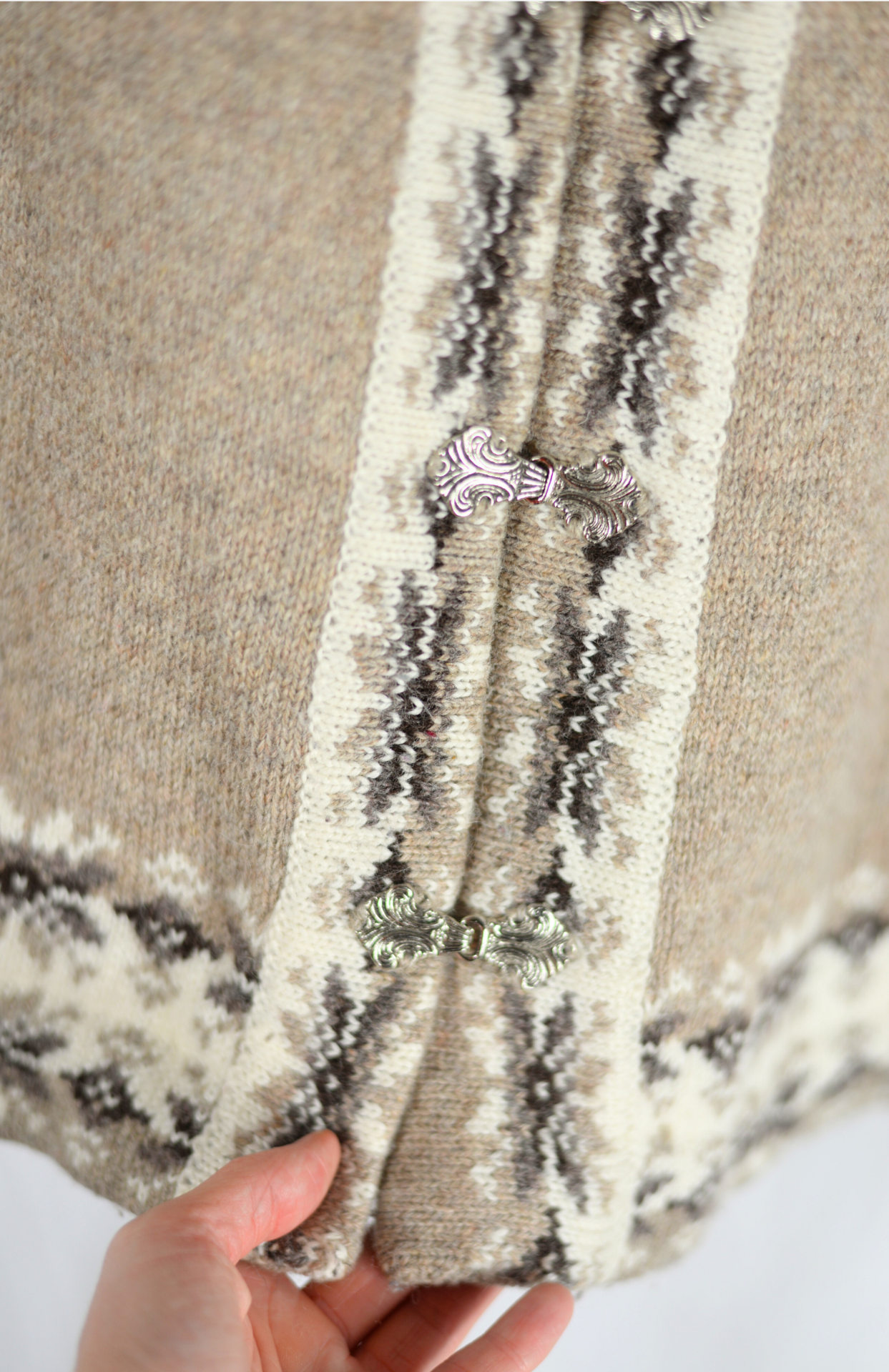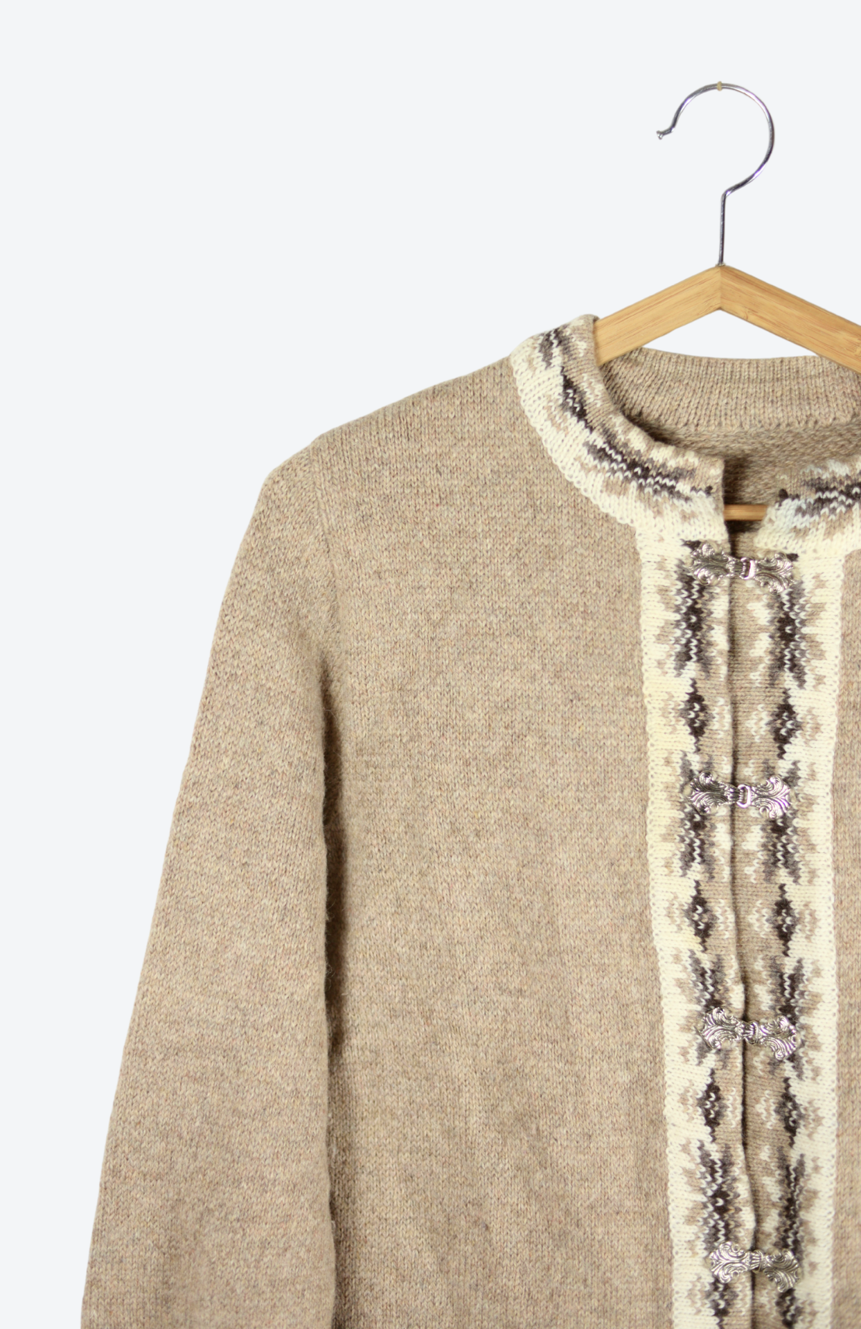 Vlněný beige svetr s drobným vzorem. Má zdobené kovové zapínání po celé své délce a pěkné detaily. Silnější, teplý úplet.Stav: Ve skvělém stavu, bez vad.Materiál: 100% vlna