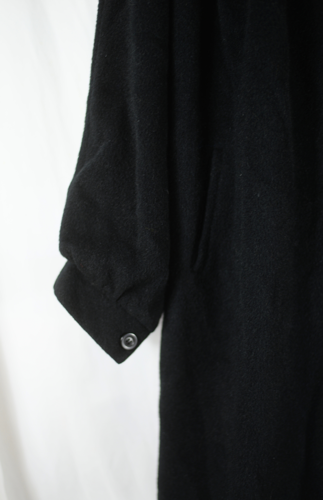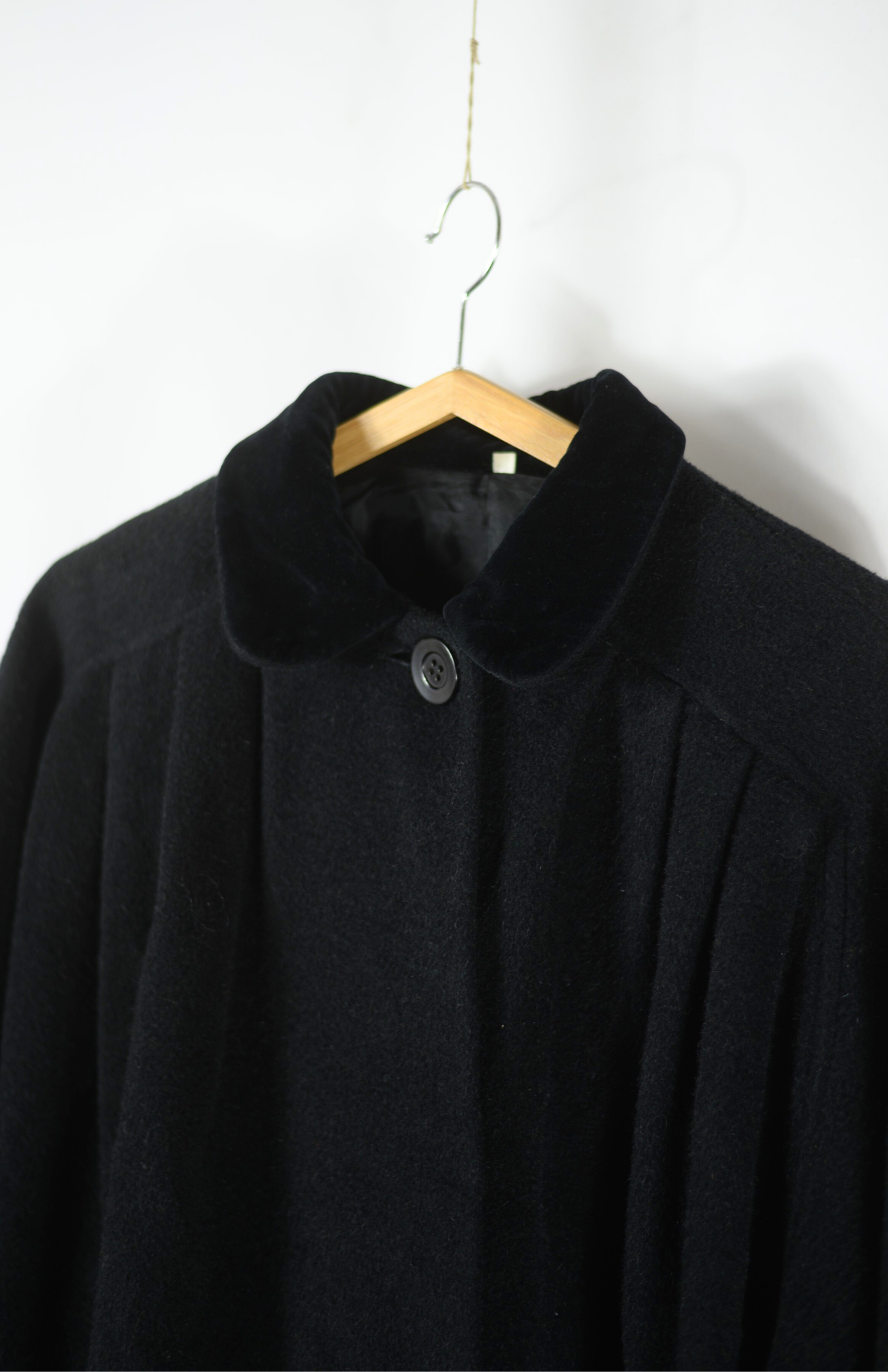 Dramatická černá vlněná pelerína se sametovým límečkem. Má dlouhý volný střih, silný vlněný & alpaka materiál. Nabíraný netopýří rukáv. Zapíná se pouze na horní knoflíček.