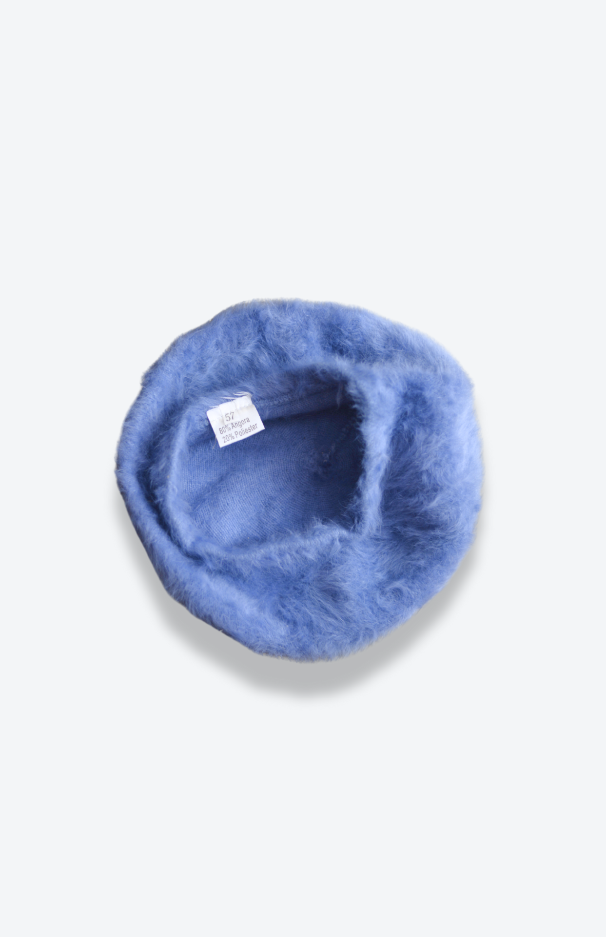 Retro baret z vlněného úpletu s angorou. Má drobnou "stopku" uprostřed a slušivý, dobře tvarovatelný střih. Lem se pěkně přizpůsobí. Stav: Ve skvělém stavu, bez vad.