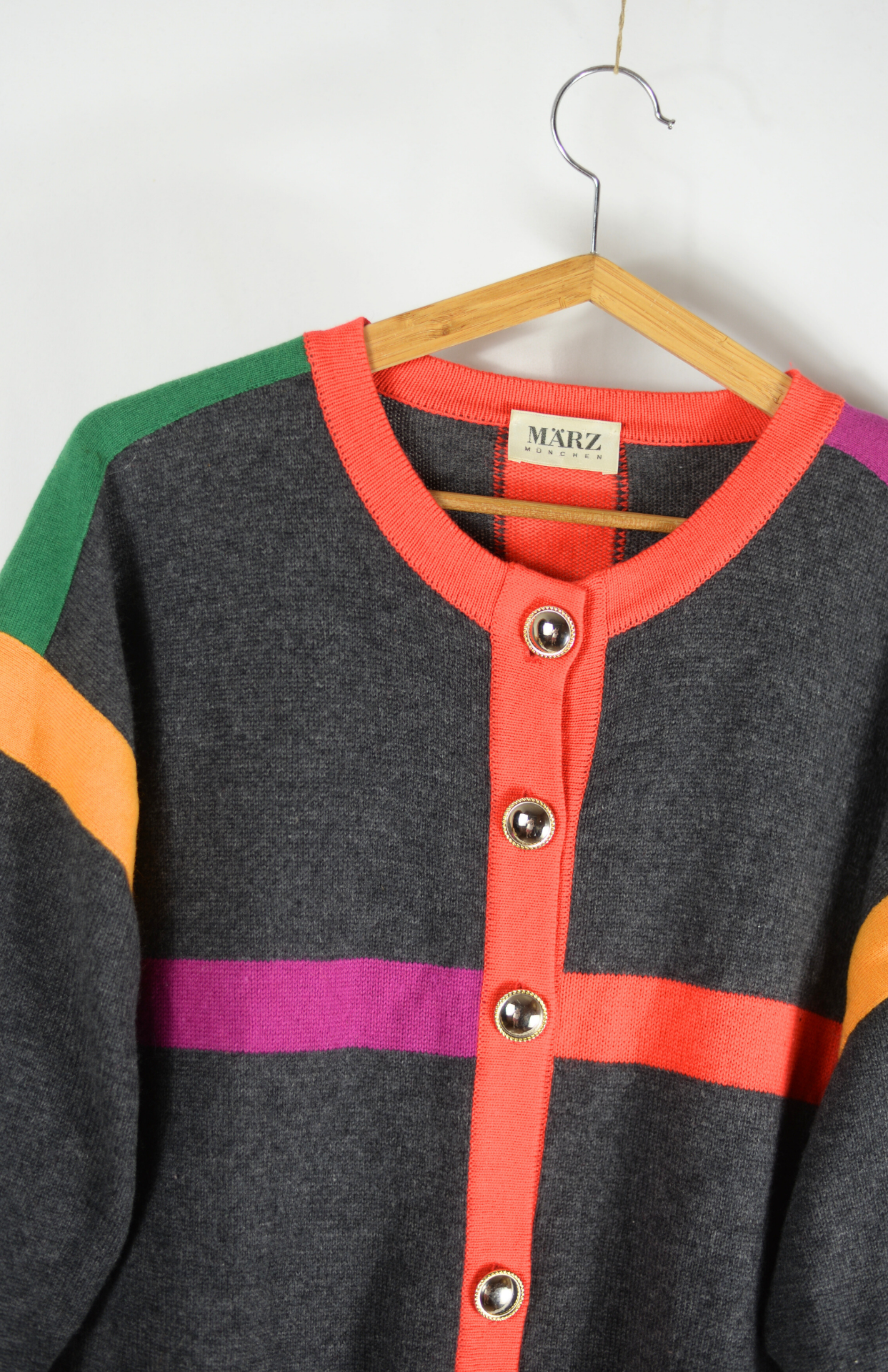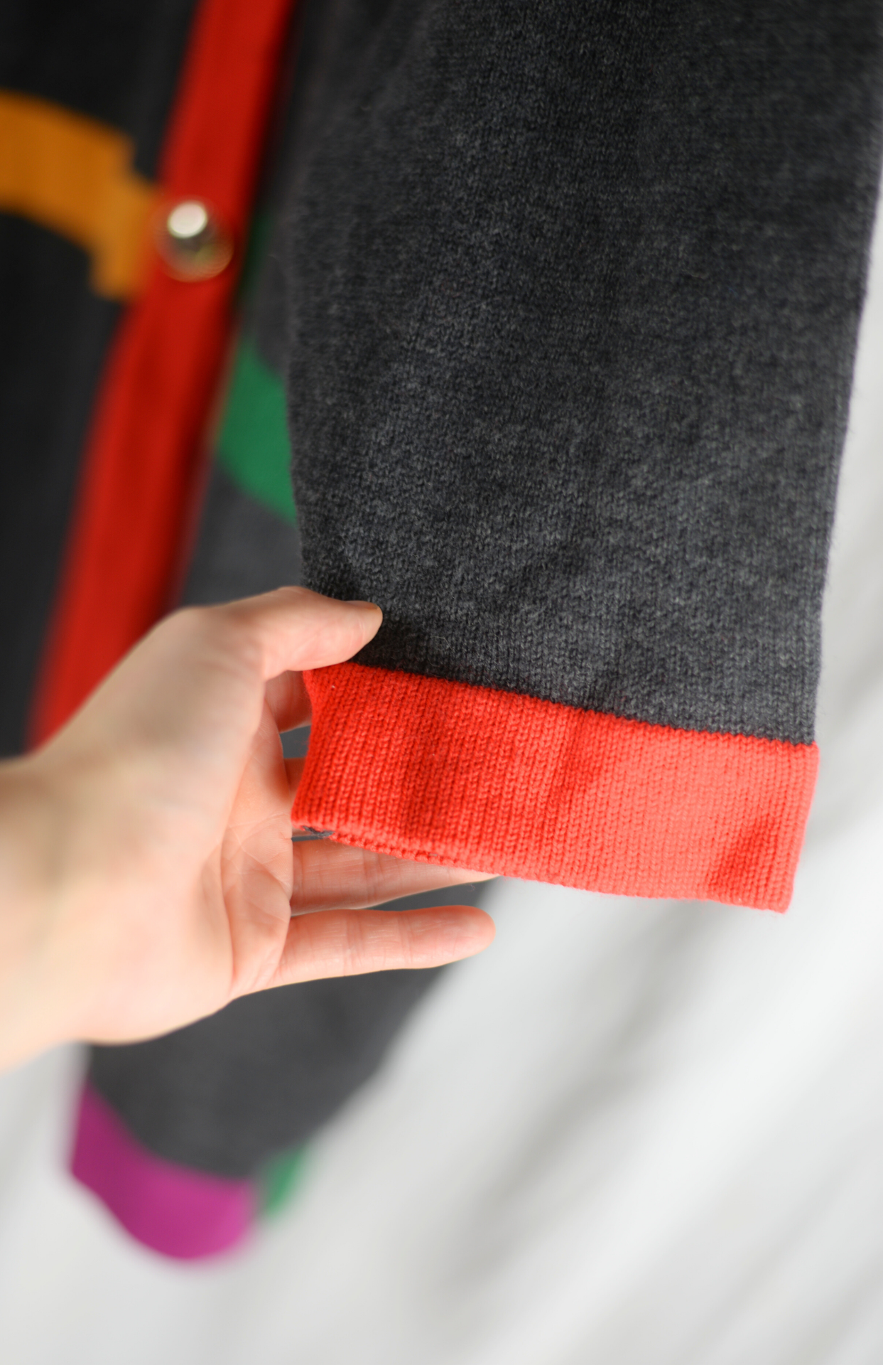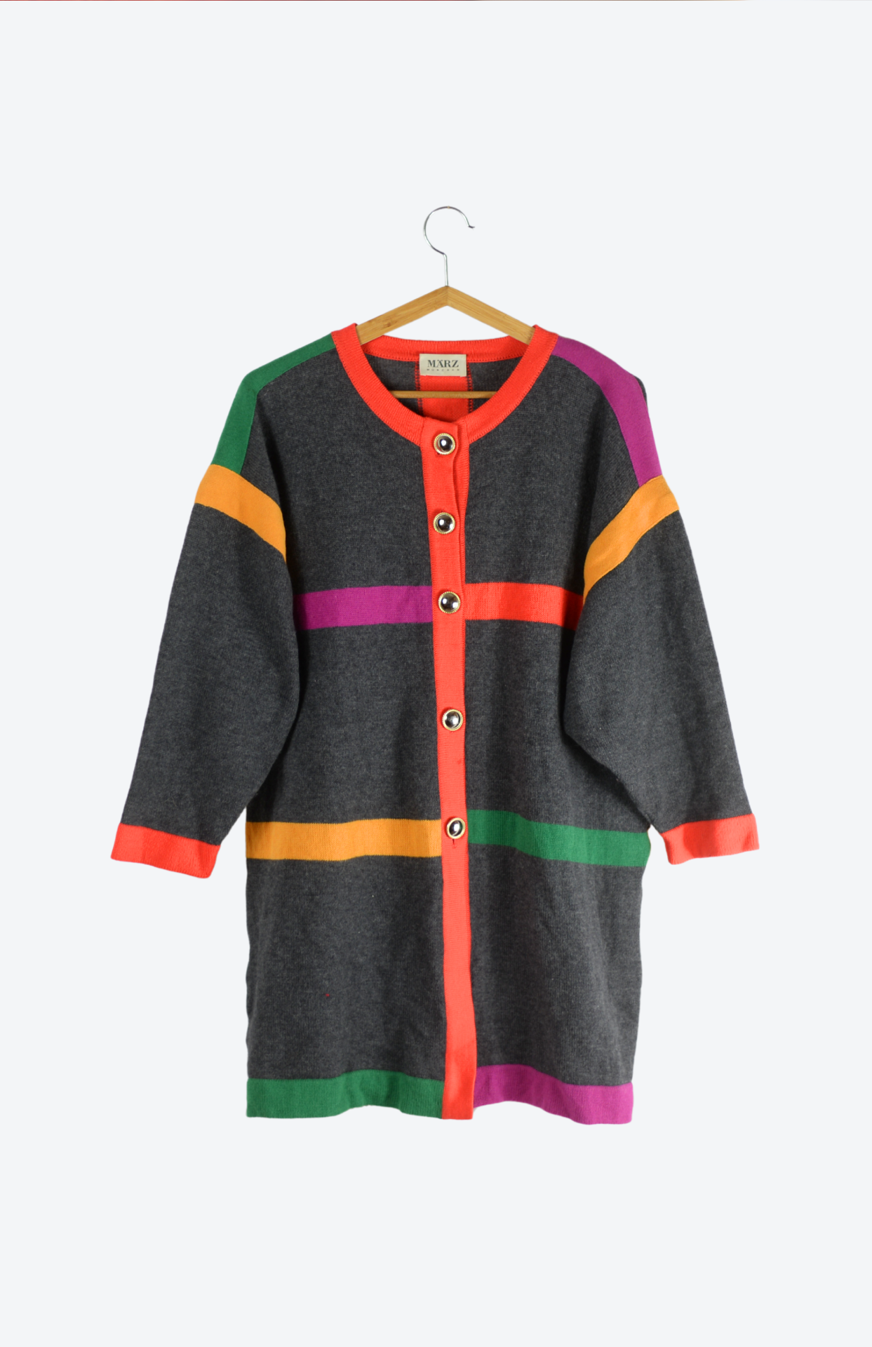 Čistě vlněný dlouhý funky svetr, či svetrové šaty. Tmavě šedý podklad s barevnými proužky. Moc příjemné, měkké na omak, ze středně silného úpletu.