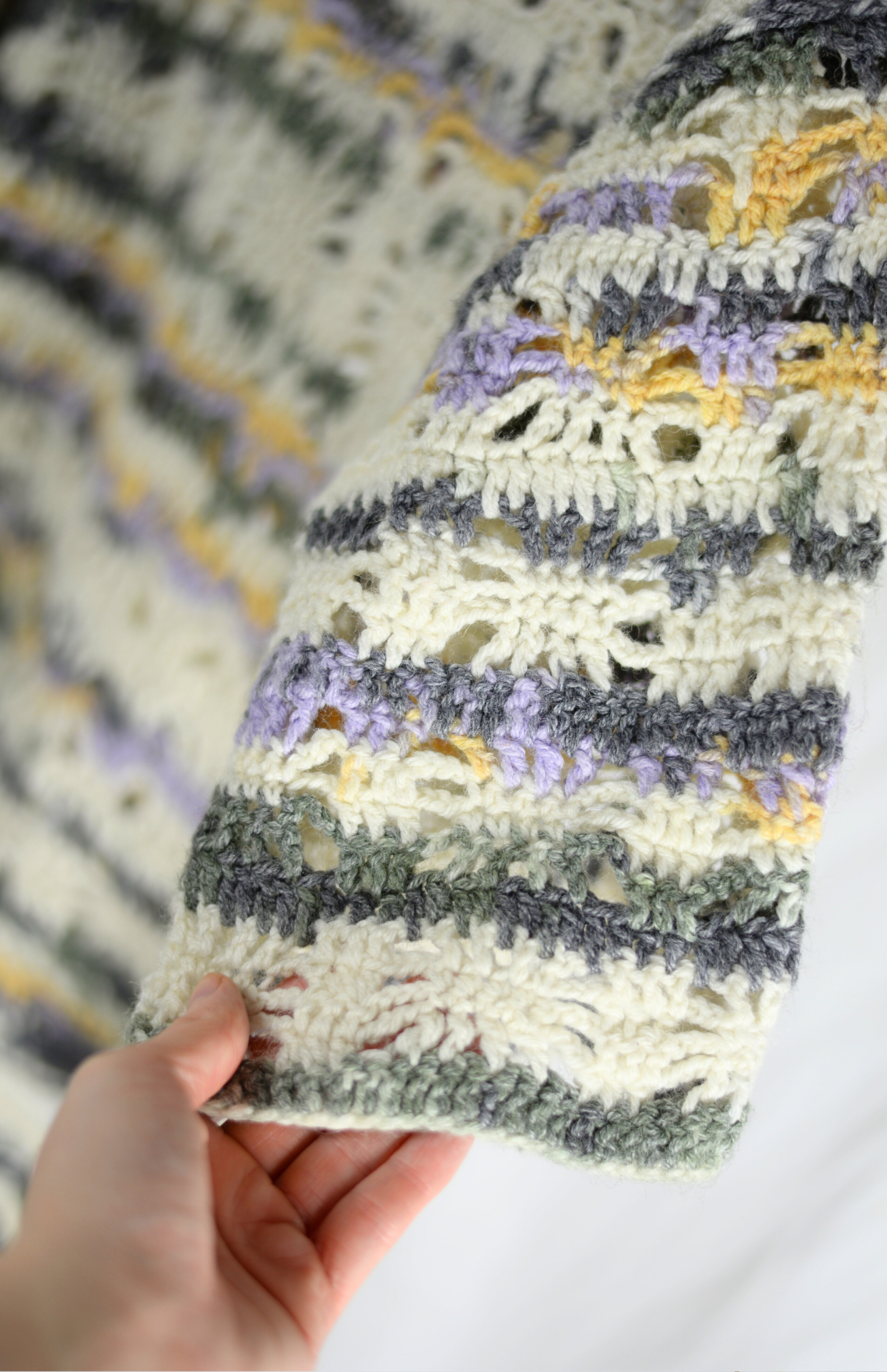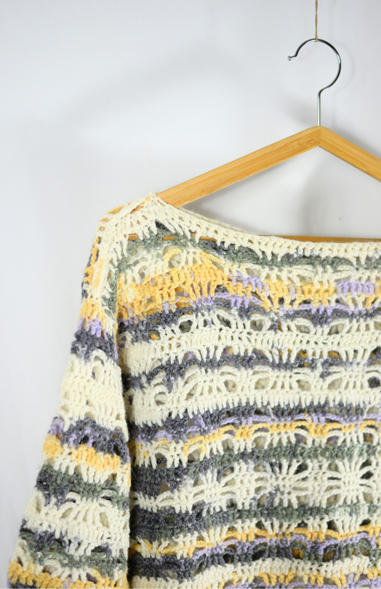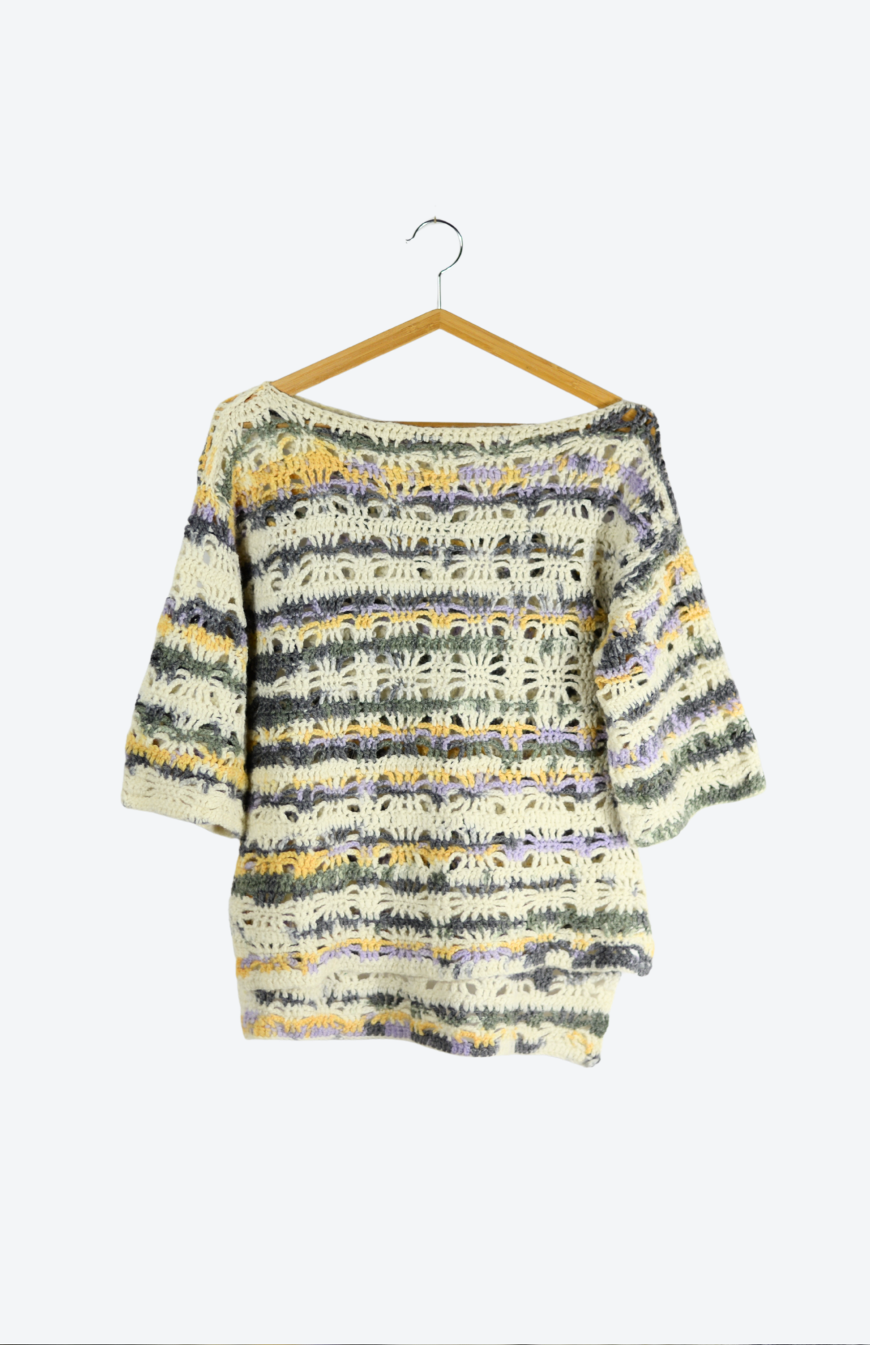 Vlněný háčkovaný barevný top / lehký perforovaný svetřík. Žíhaná barevná nitka.Stav: Vintage kousek v perfektním stavu, bez vad.