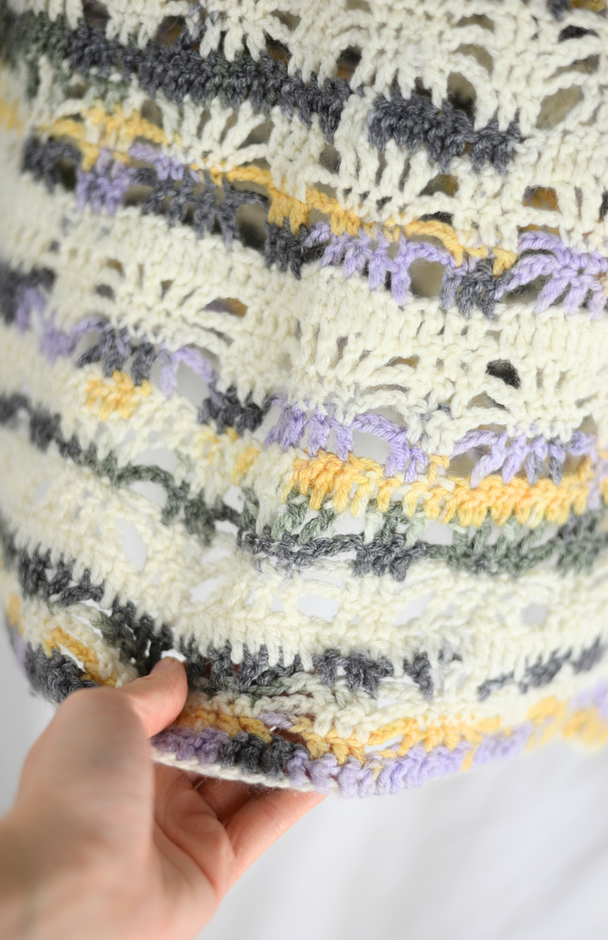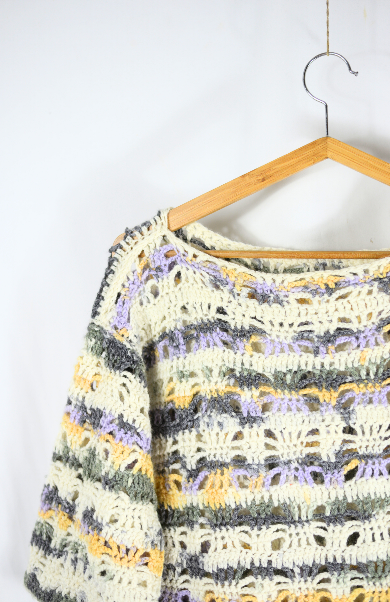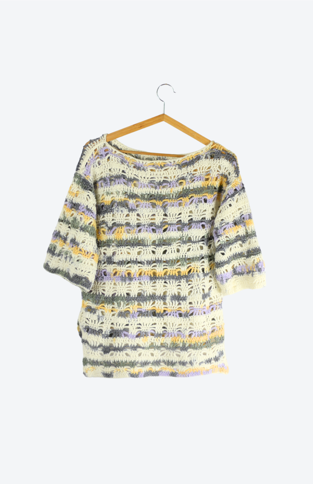 Vlněný háčkovaný barevný top / lehký perforovaný svetřík. Žíhaná barevná nitka.Stav: Vintage kousek v perfektním stavu, bez vad.