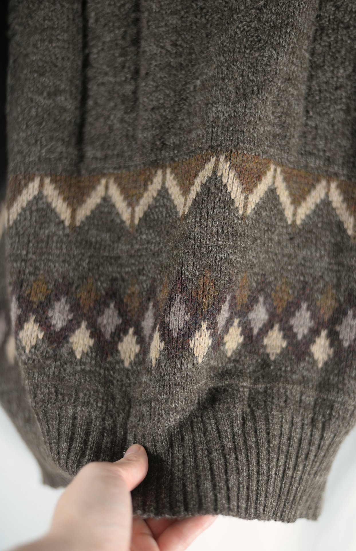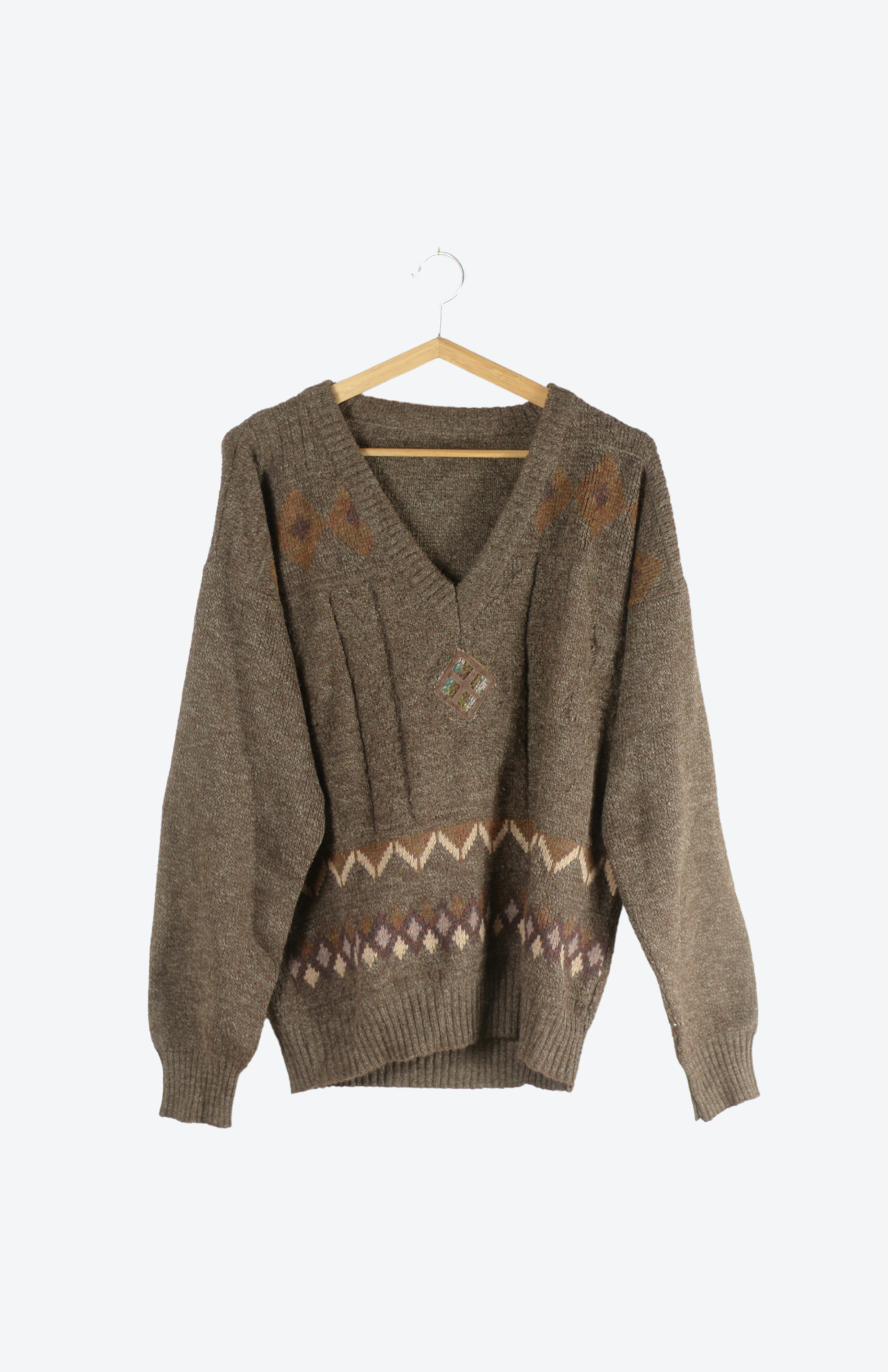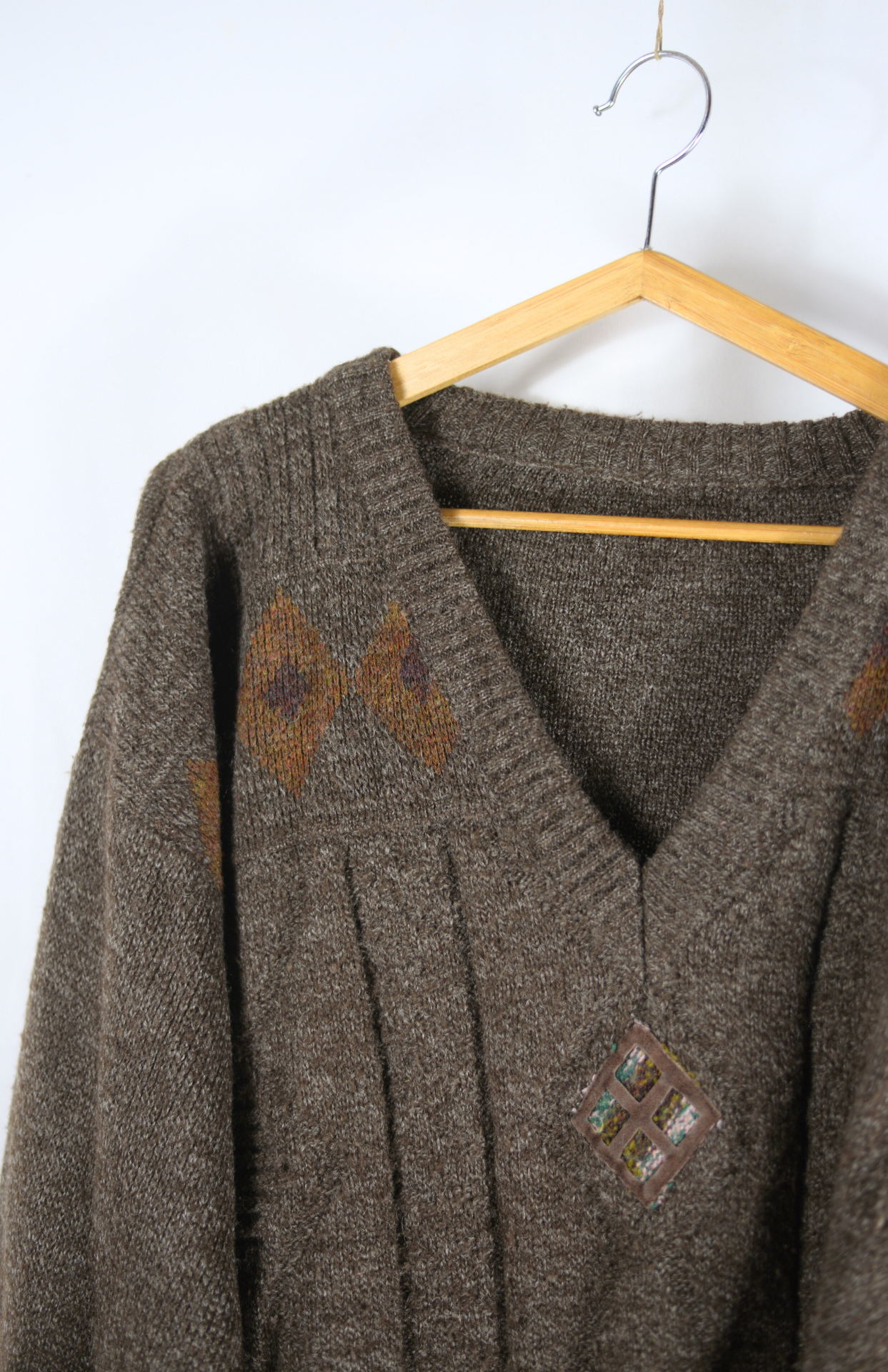 Vintage vlněný hnědý svetr s pěknými detaily a decentním vzorem. Má volnější střih a střední úplet.