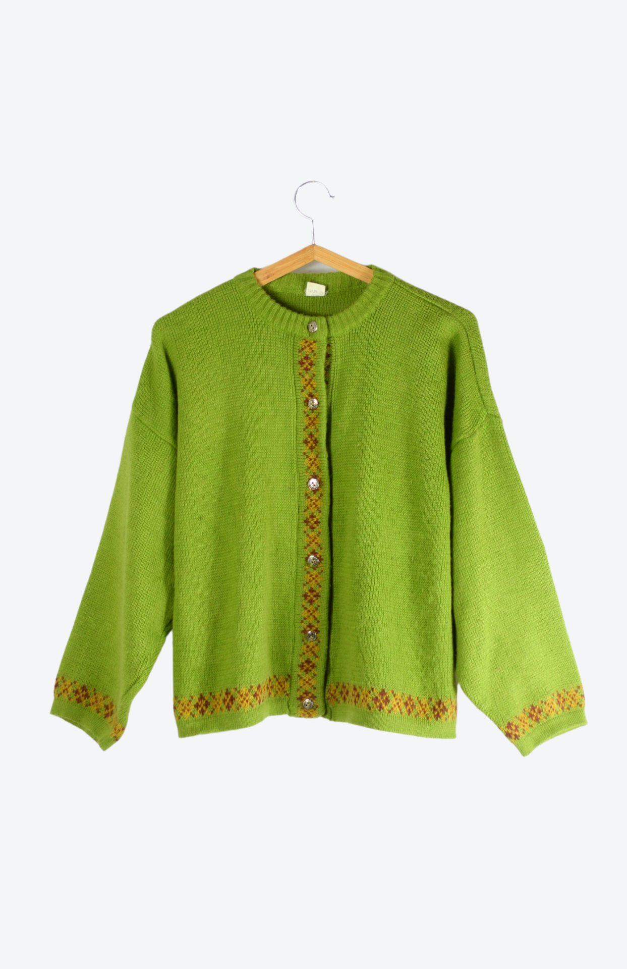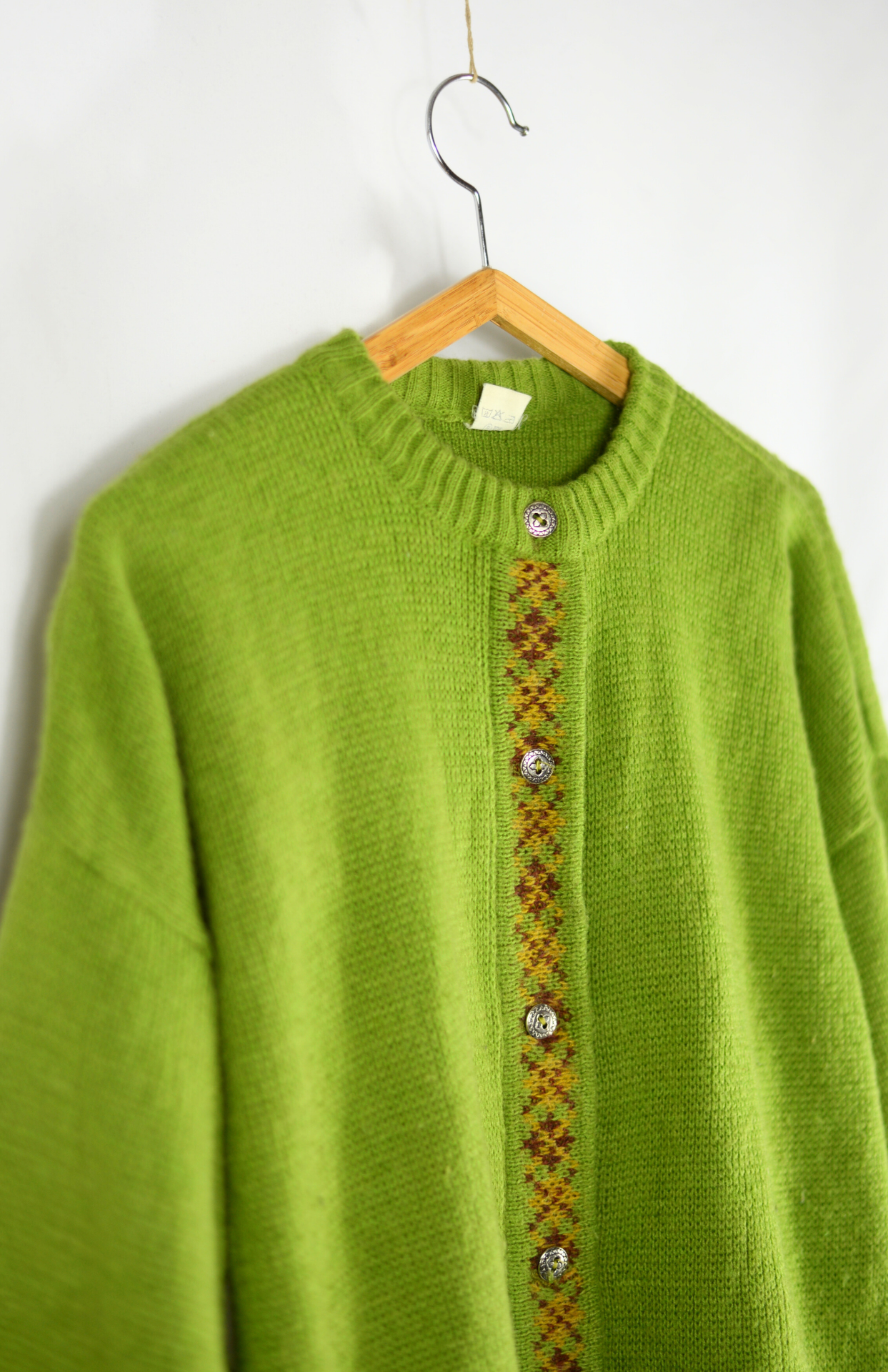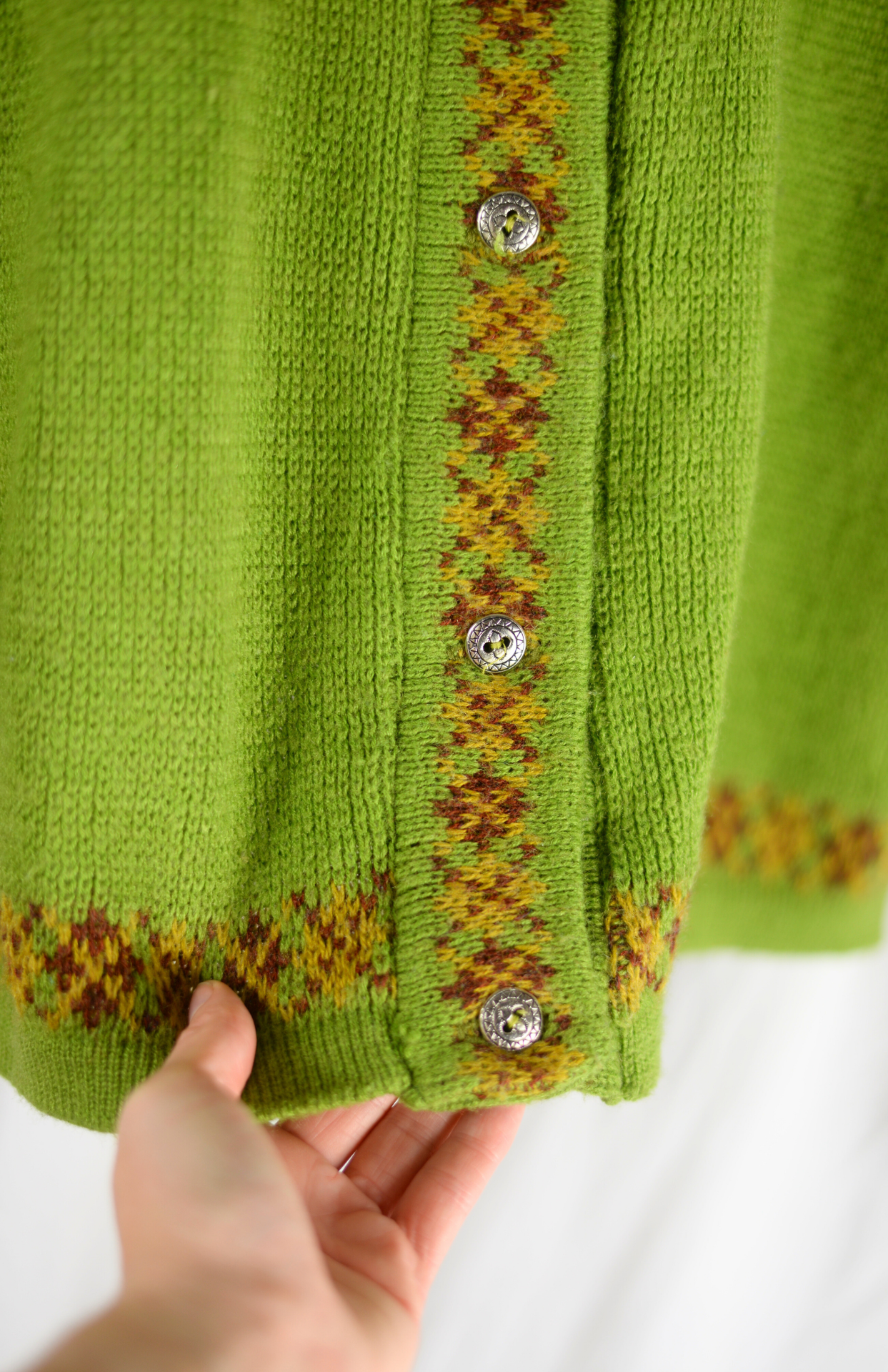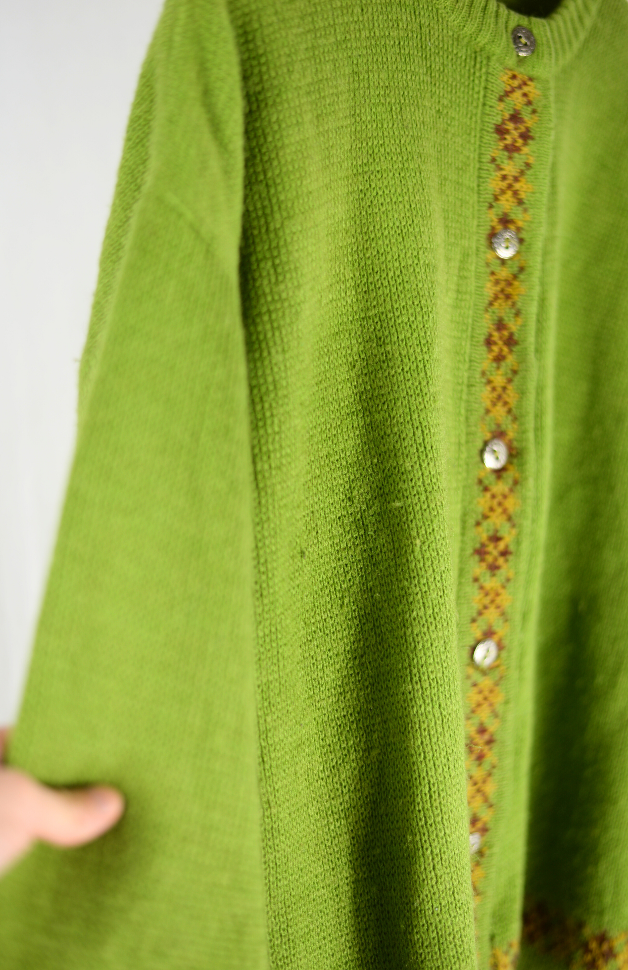 Sytě hráškový vlněný svetr. Propínací na středu na kovové knoflíčky a zdobený lemem s drobným ornamentem. Středně silný, příjemný kousek.
