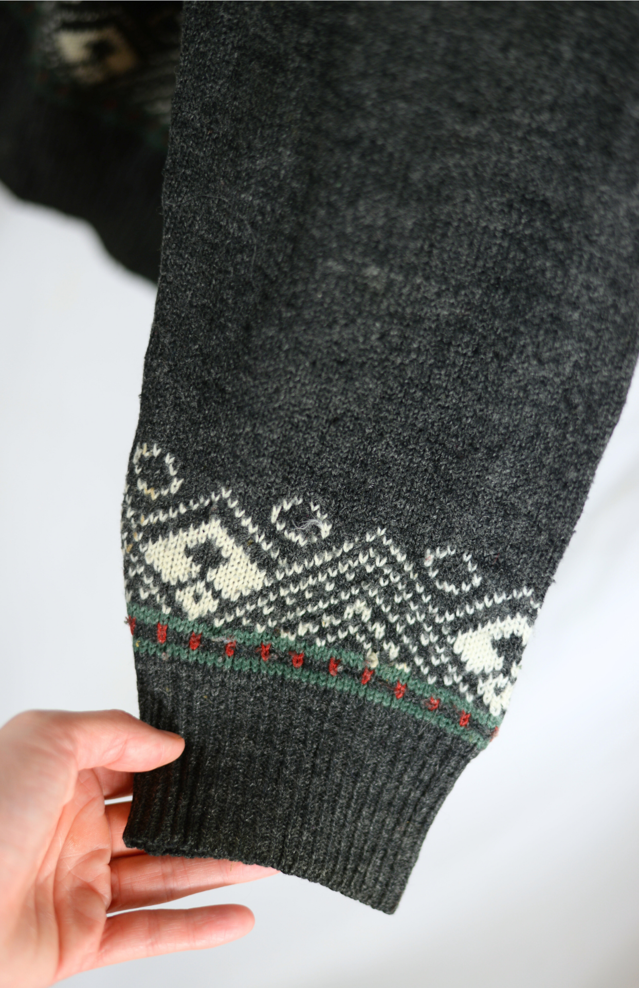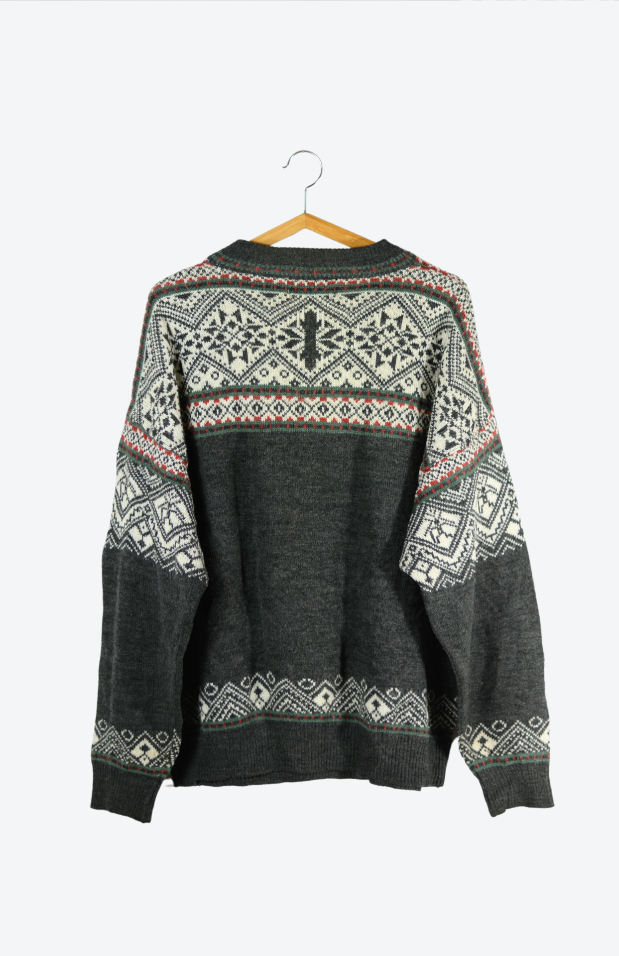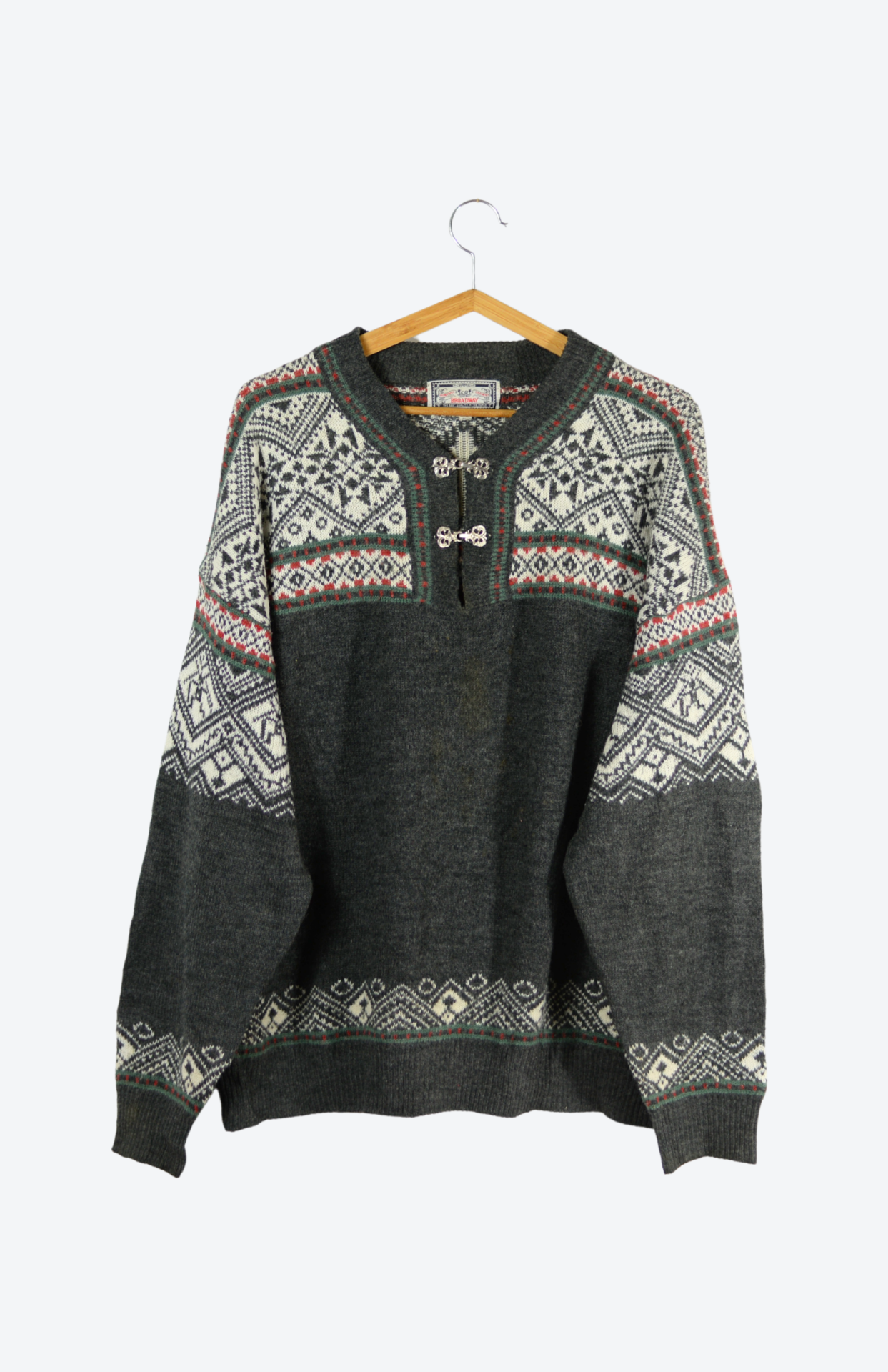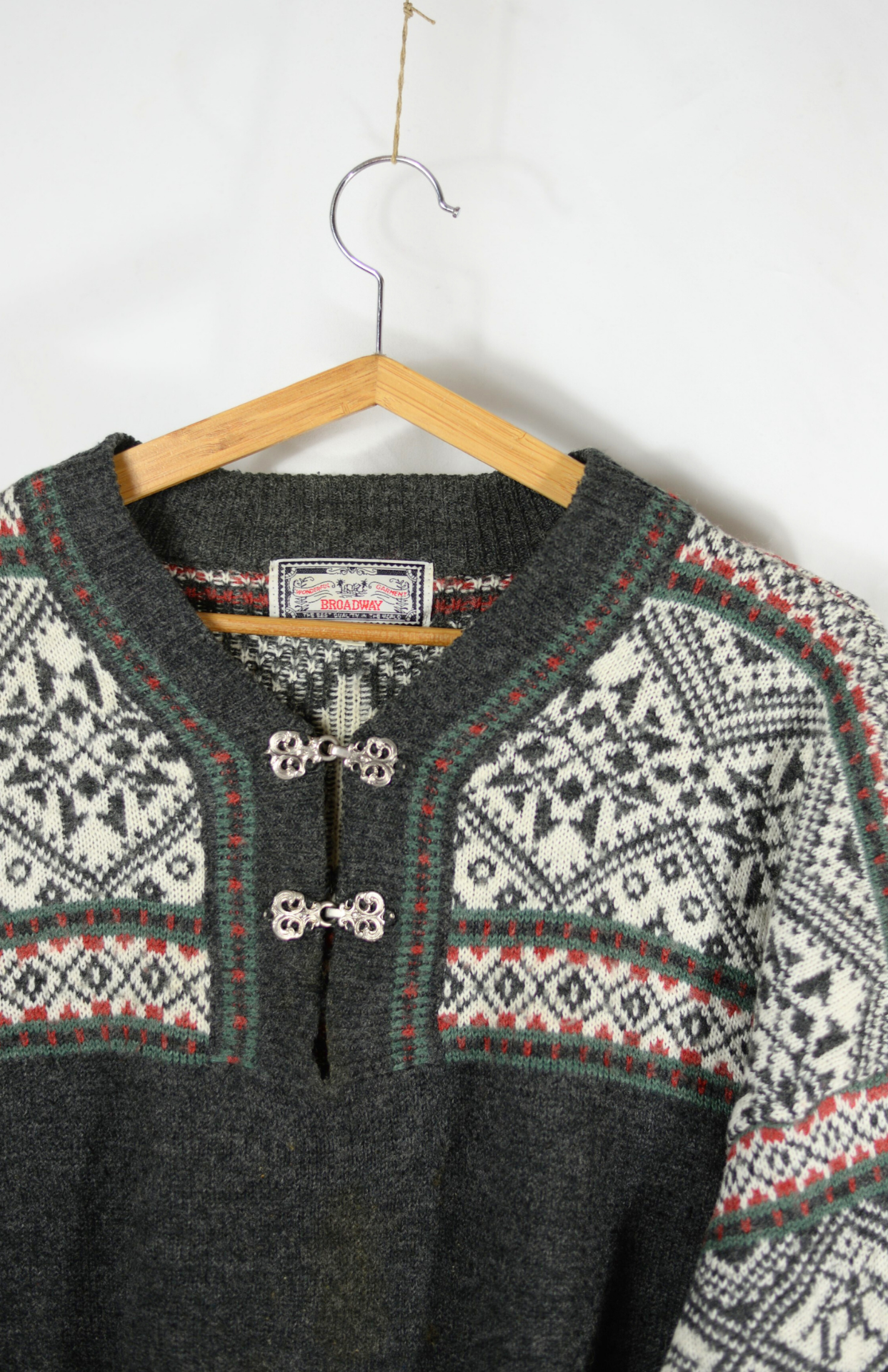 Norský svetr s výraznými vzory. Má zapínání u krku na zdobené kovové háčky a lehce nabíraný rukáv. Pánský / unisex kousek.