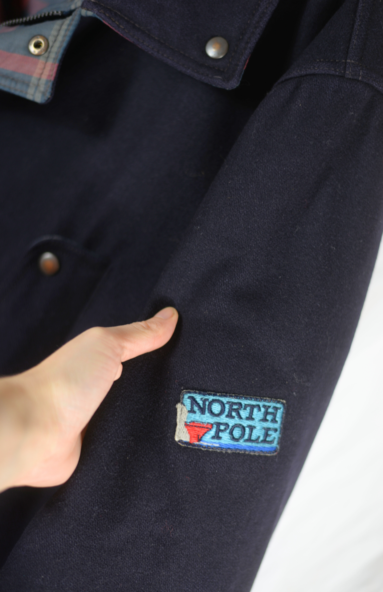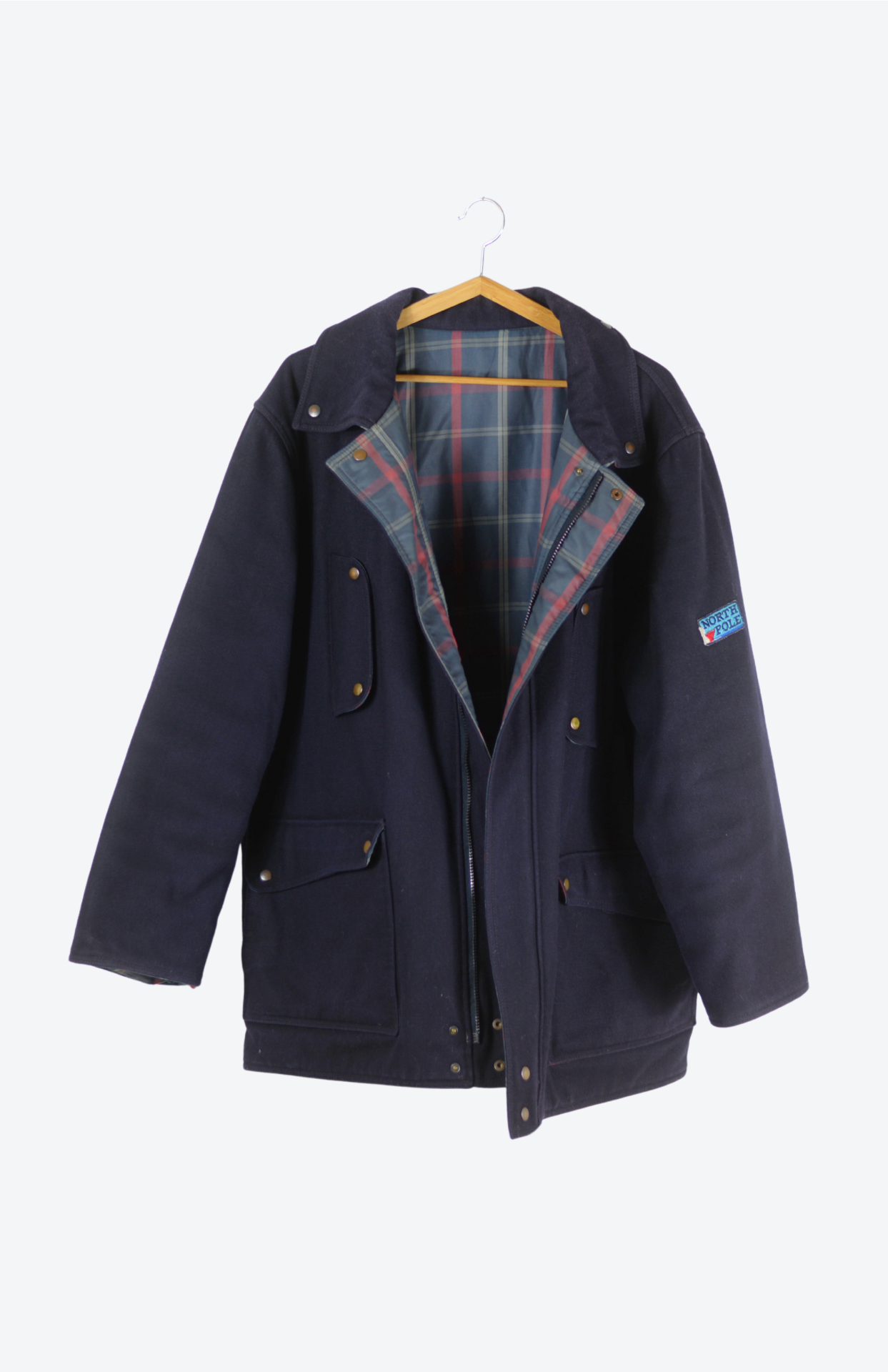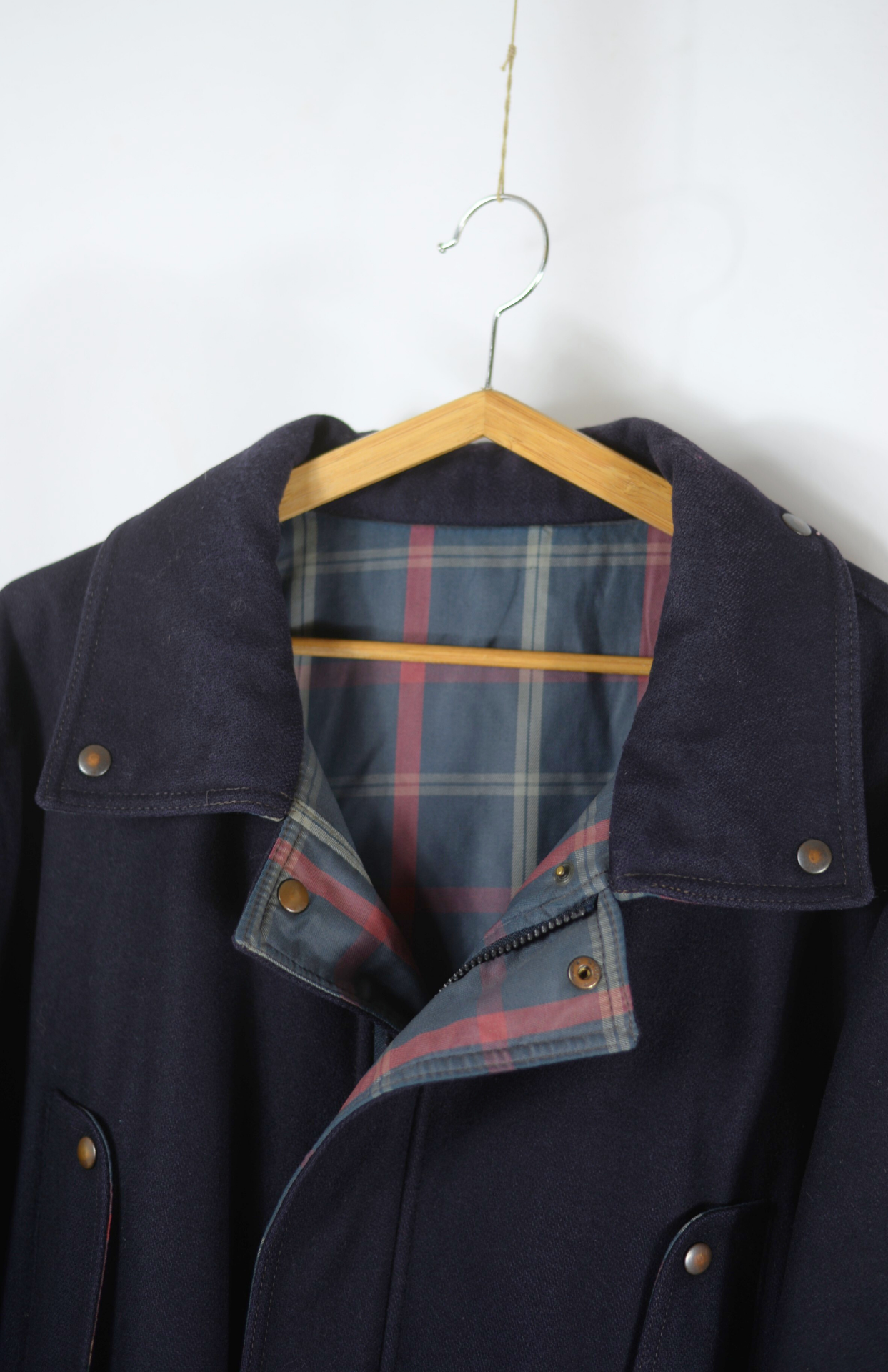 Tmavě modrý z jedné strany, funky kostička z druhé. Kabát je možné nosit oběma směry, je super teplý a má řadu kapes. Pánský kousek.