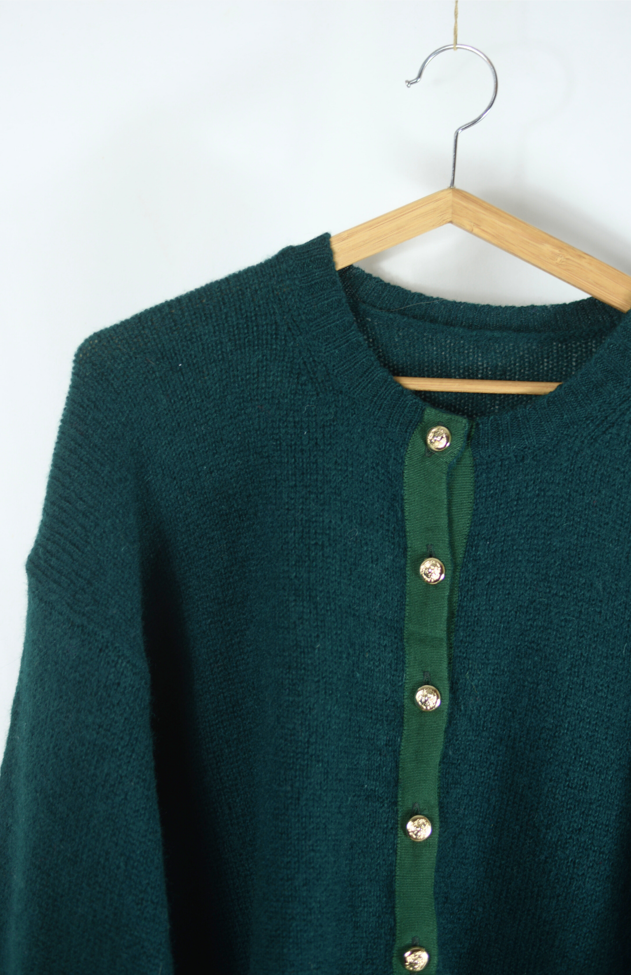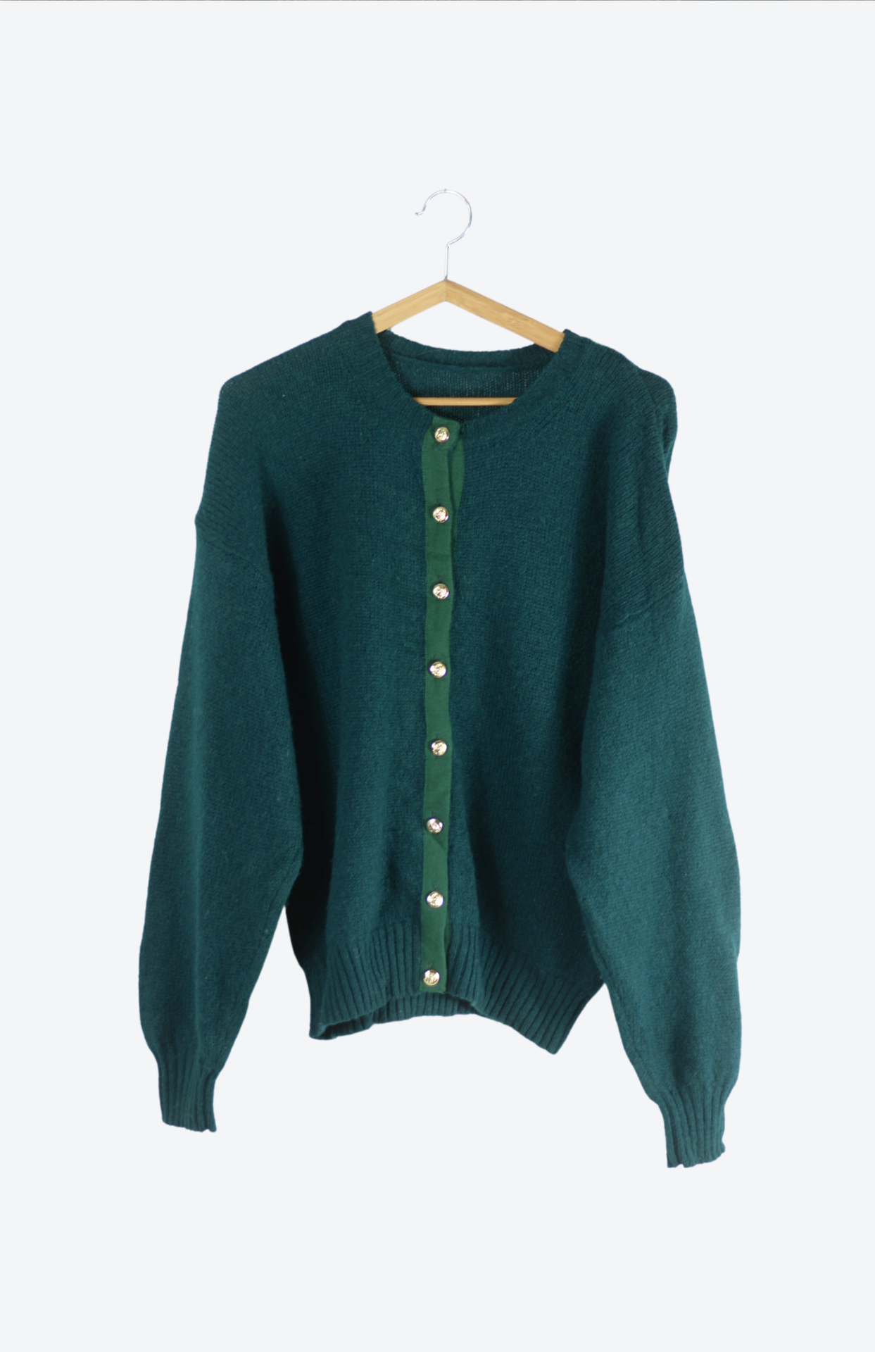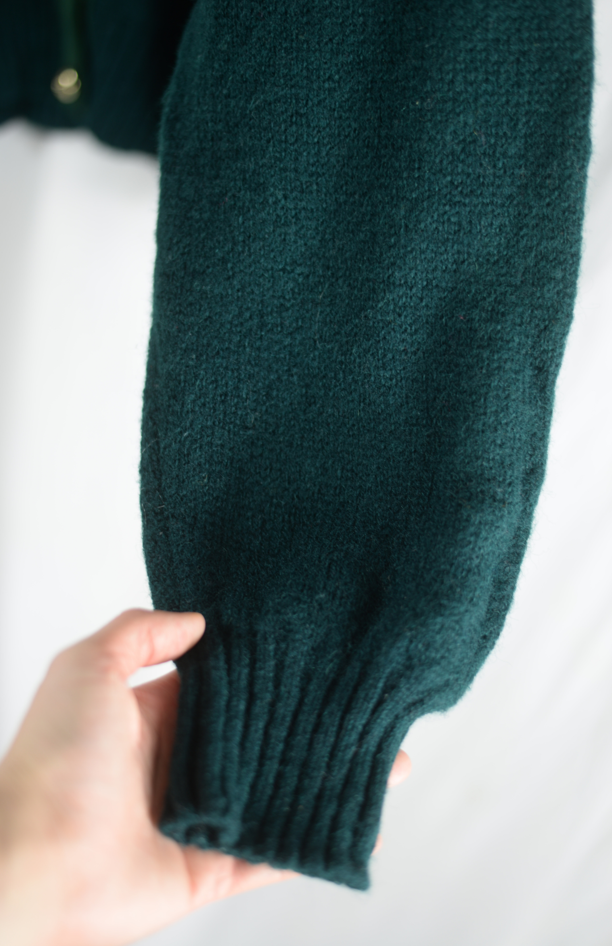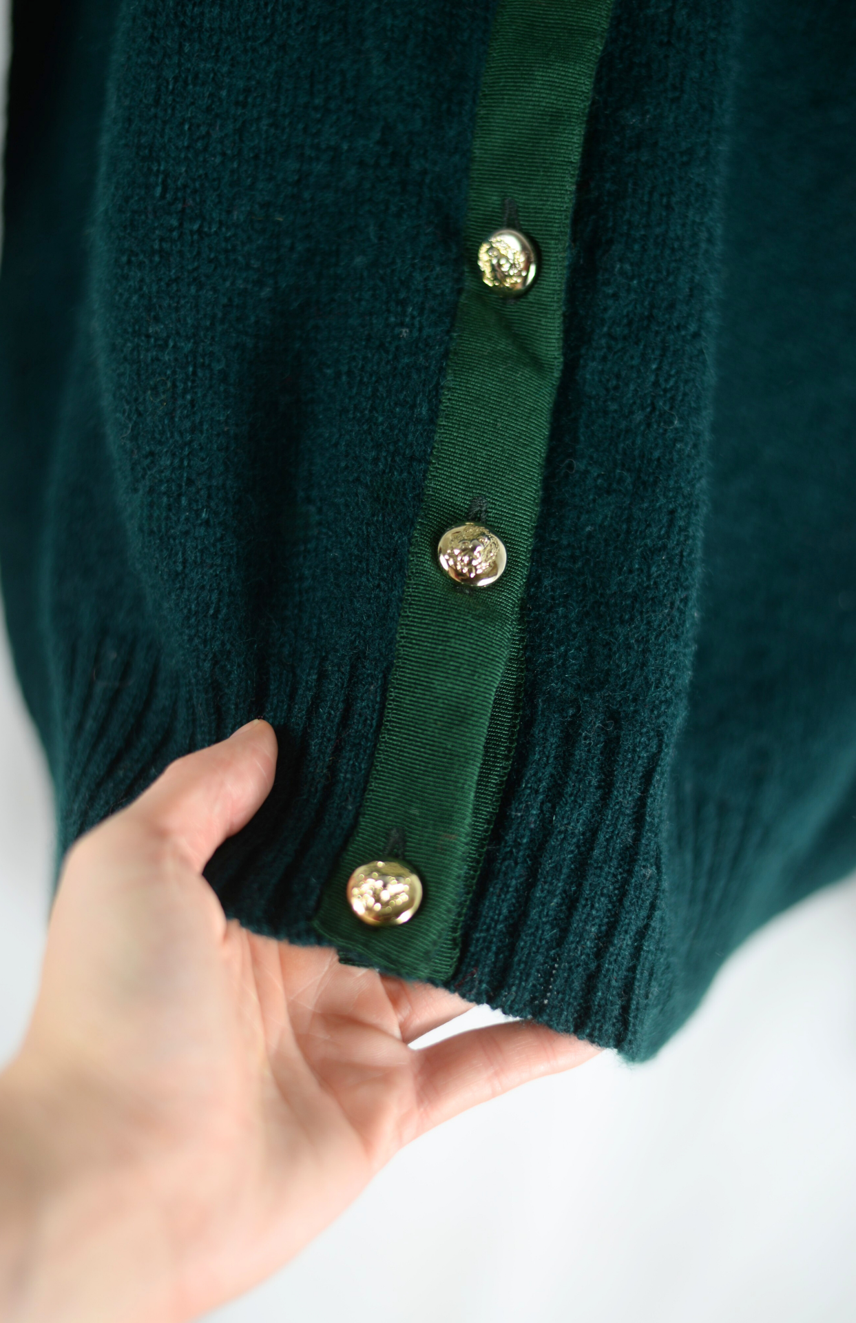 Tmavě zelený vintage svetr z čisté vlny. Má nabíraný rukáv a zapínání na zlaté zdobené knoflíčky. Stav: Vintage kousek v perfektním stavu, bez vad.