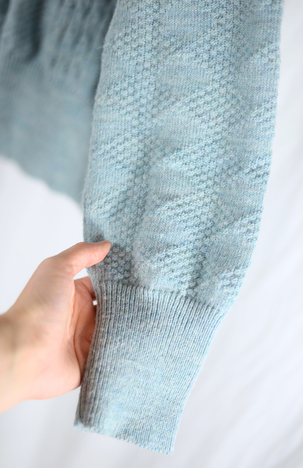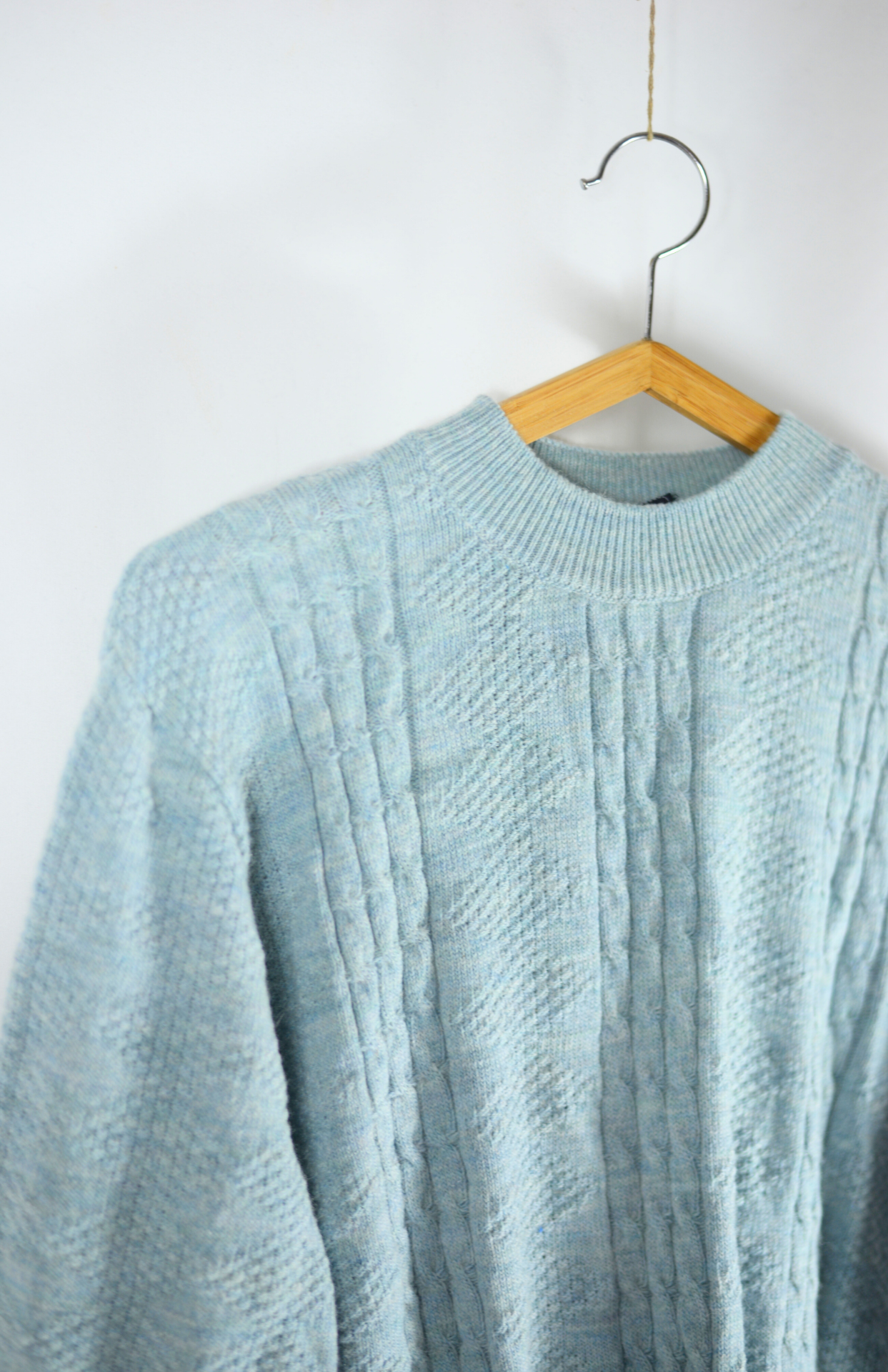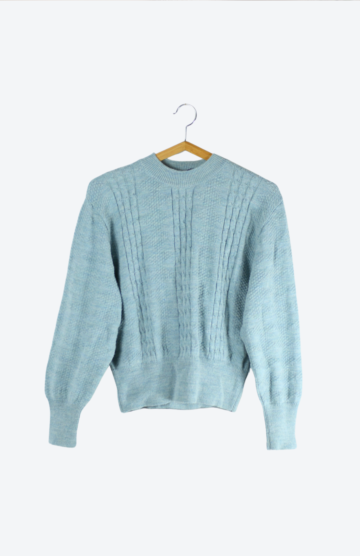 Minimalistický vlněný svetr s nízkým stojáčkem u krku. Má střední / tenčí úplet a krásný úpletový vzor. Lehce nabíraný rukáv. Šikovný kousek do základů šatníku.