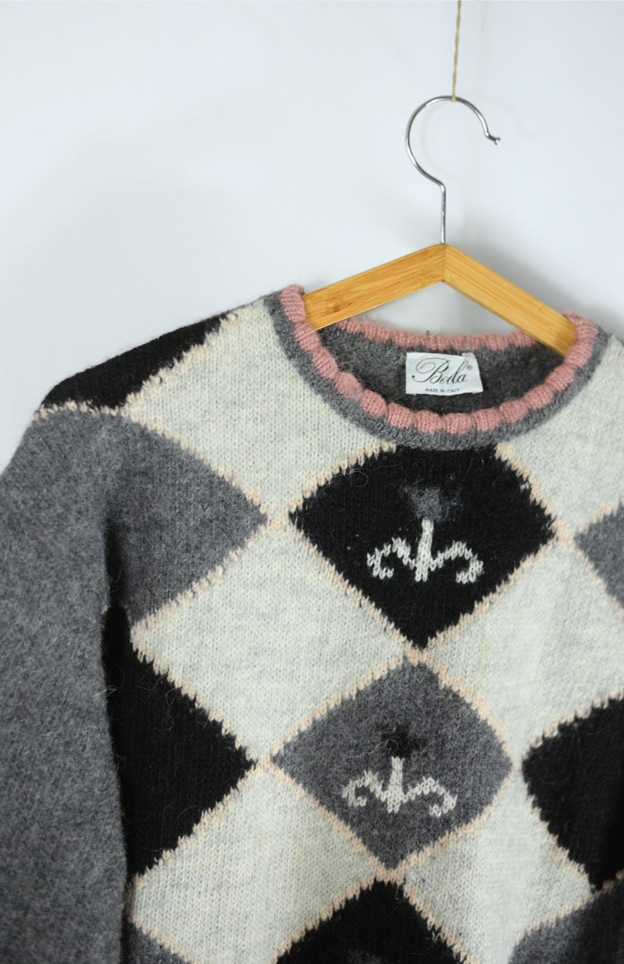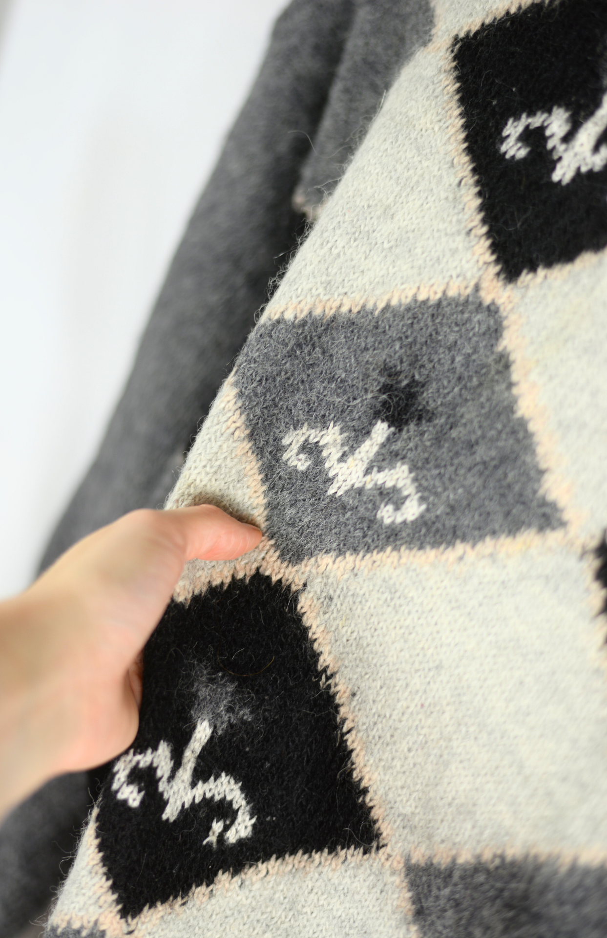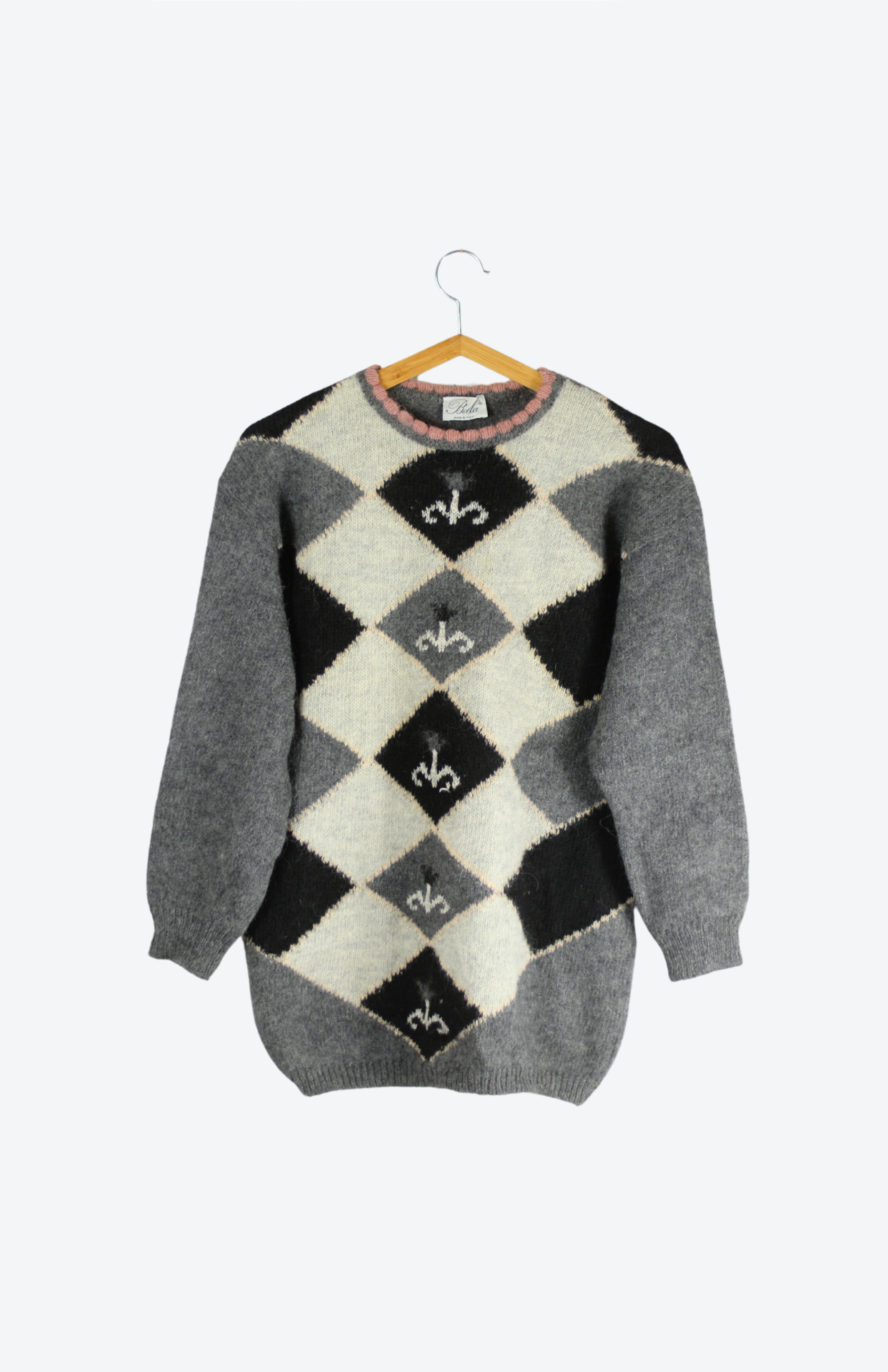 Super hebký, teplý svetr z alpaky. Má pěkný detail okolo límečku, šachovnicový vzor a květy na středu. Lehce nabíraný rukáv. Působí trochu jako z Alenky v říši divů.