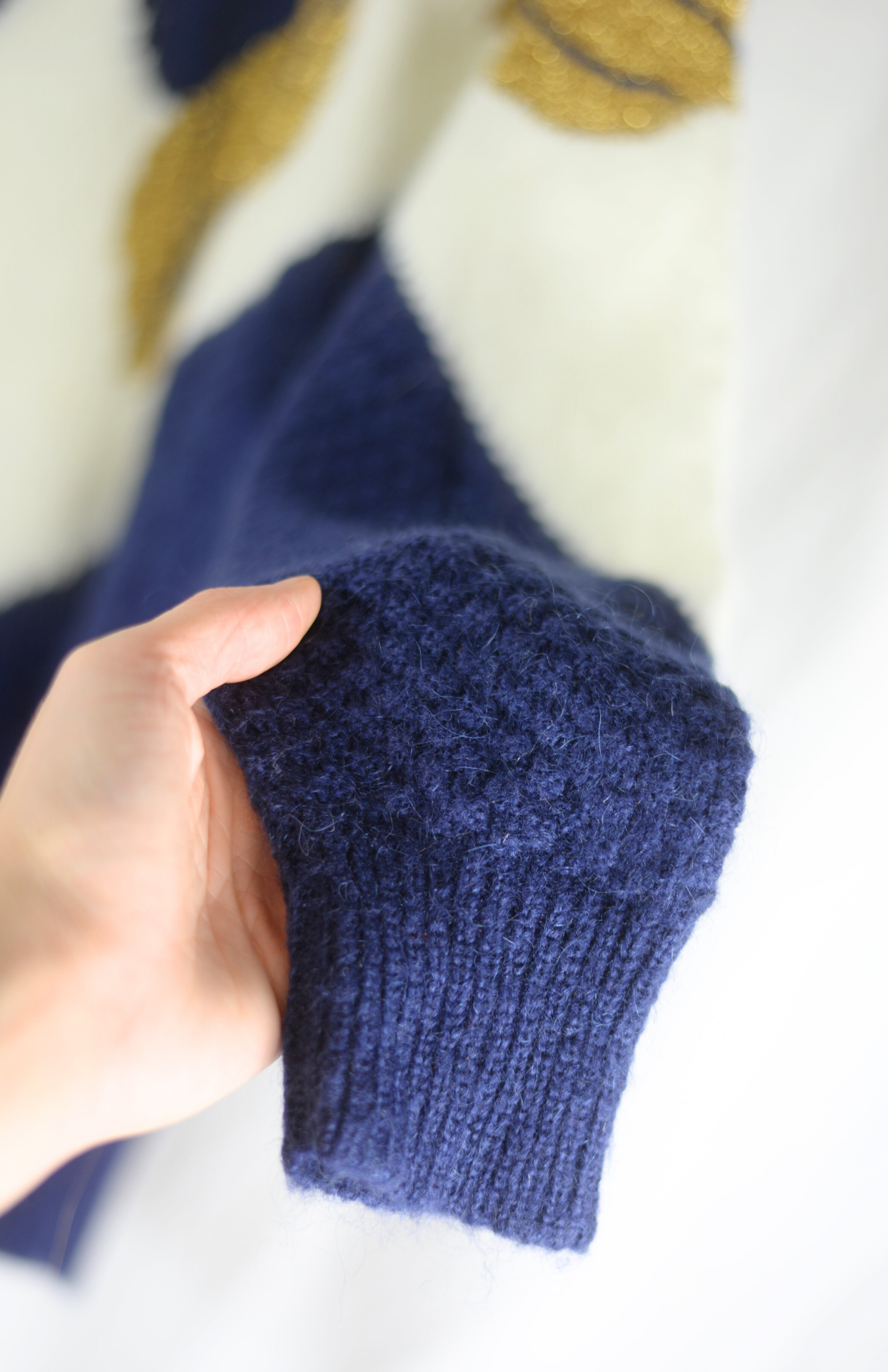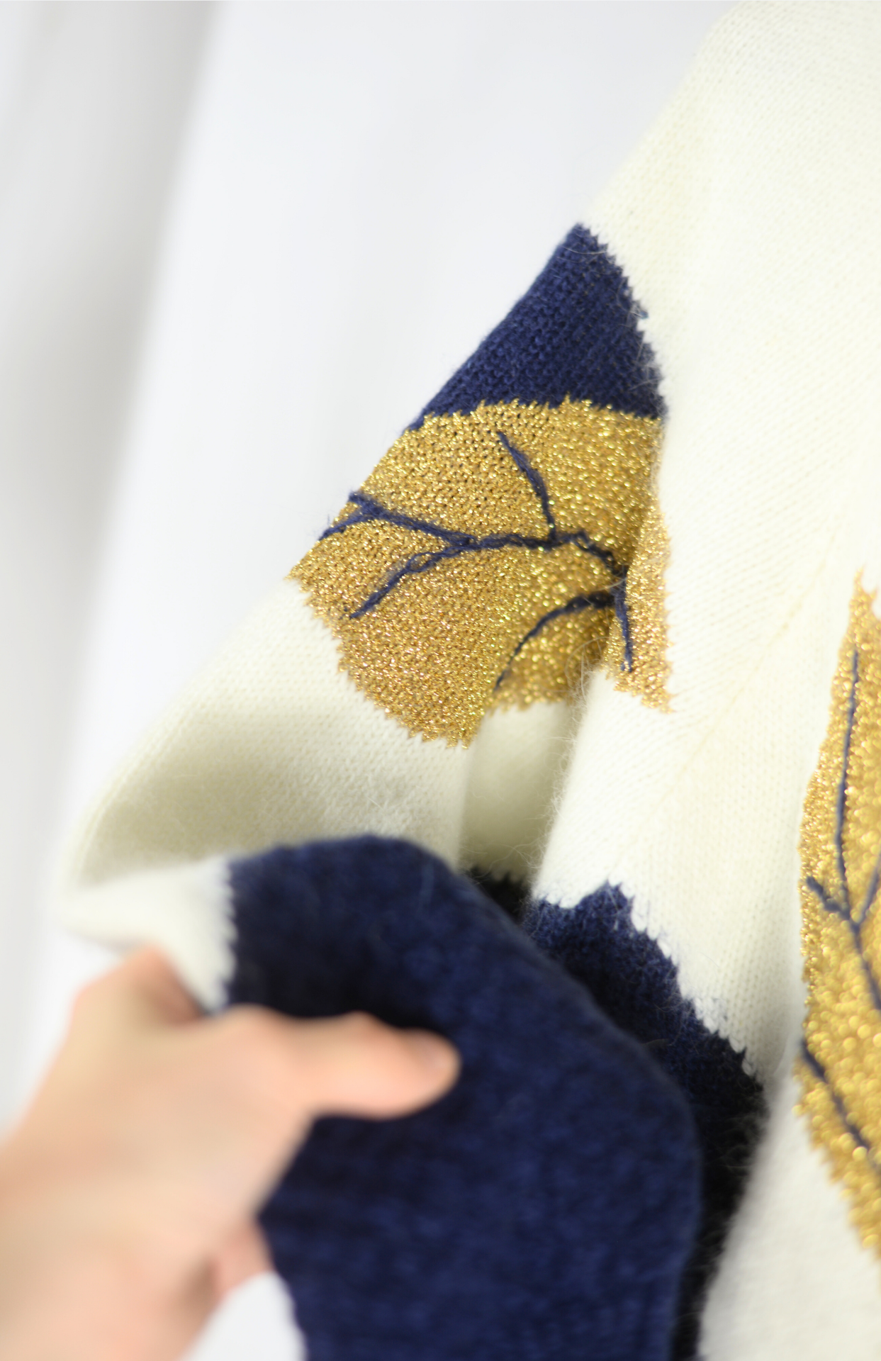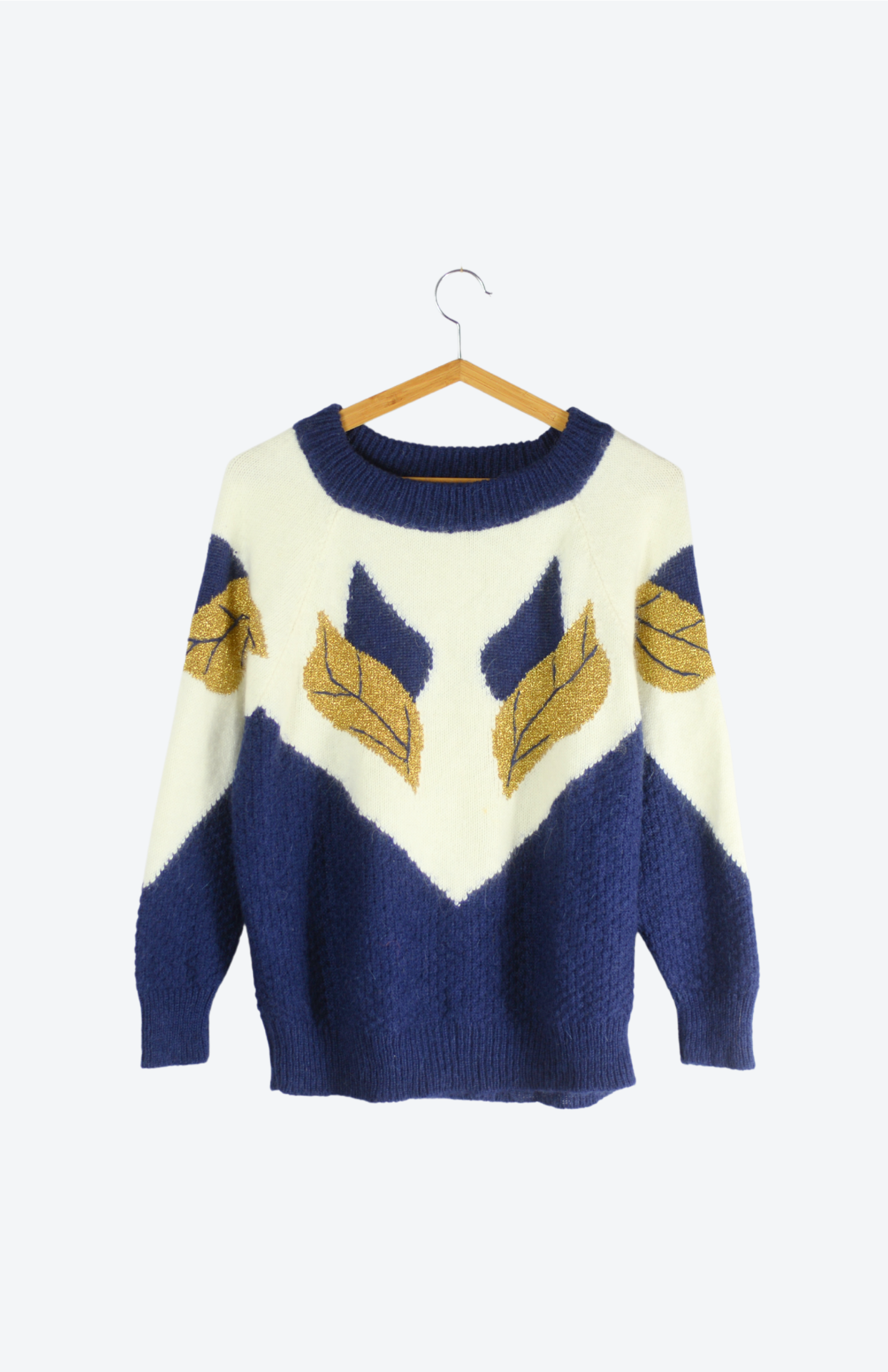 Hebký vintage svetr se zlatými lístky a tmavě modrým lemováním. Příjemný středně silný úplet.