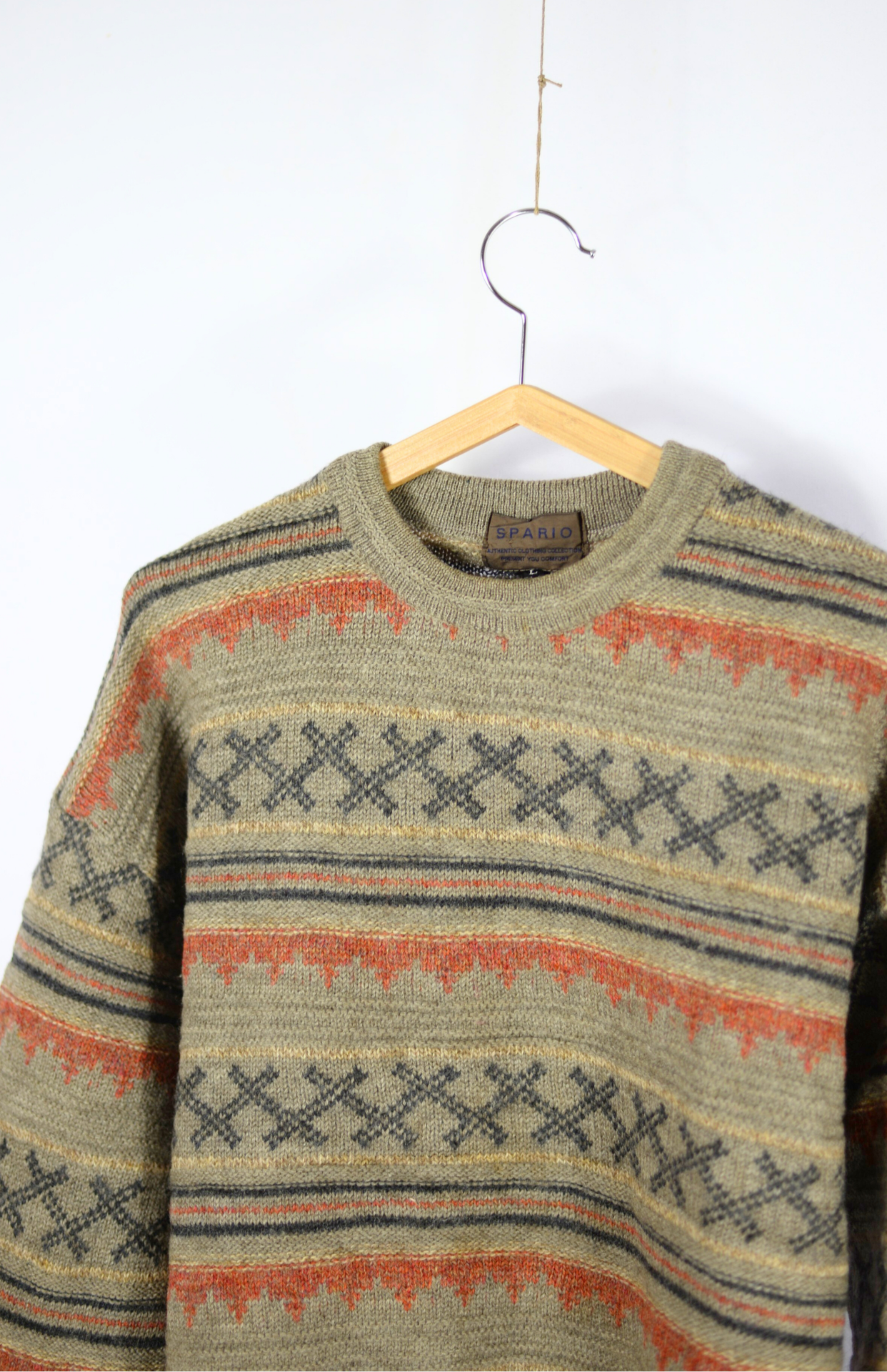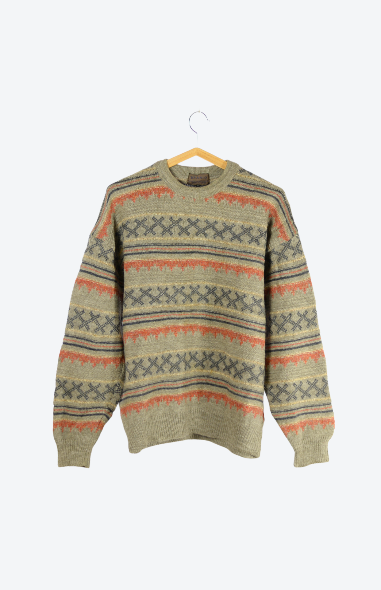 Vintage svetr s funky proužky a barevným vzorem. Má lehce nabíraný rukáv a středně silný úplet. Originální a pěkně zpracovaný. Unisex střih.