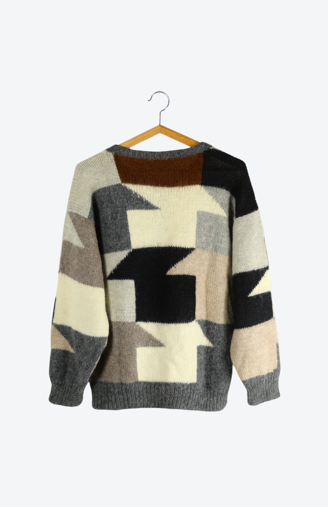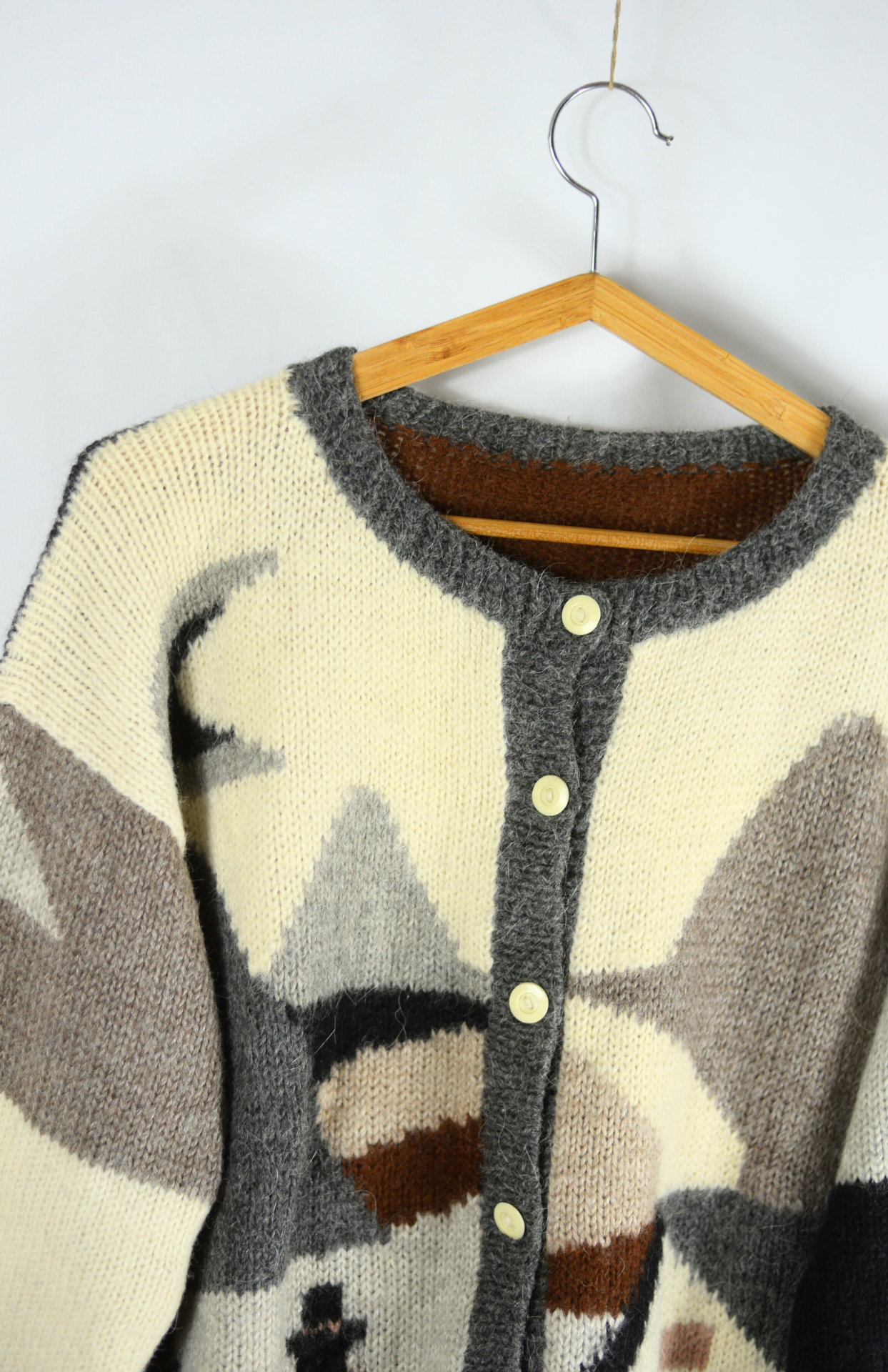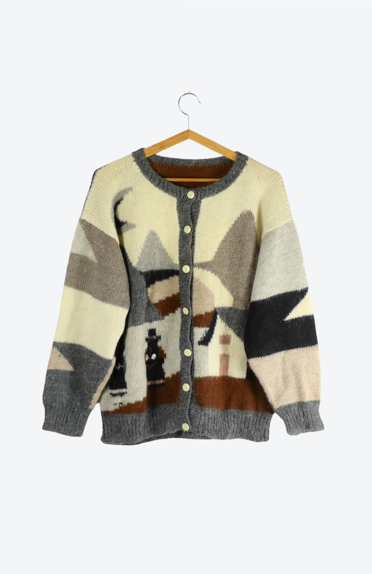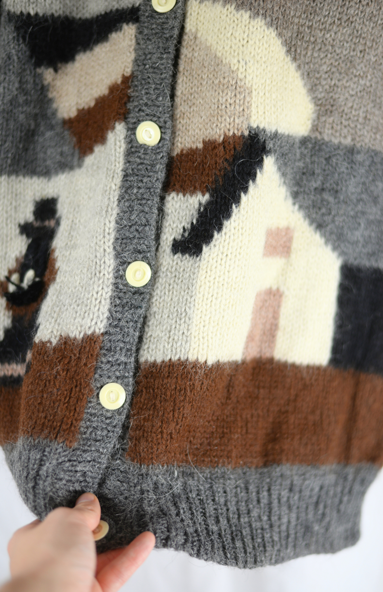Originální čistě vlněný vintage svetr. Má funky vzor s domečky, geometrií a postavami s kloboukem. Propínací na krémové knoflíky. Teplejší středně silný úplet.