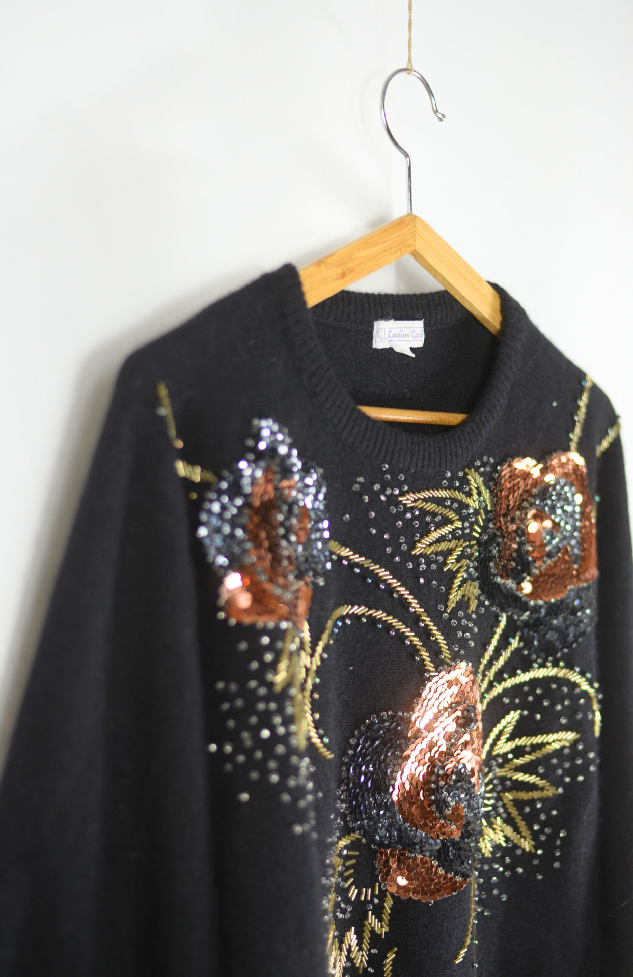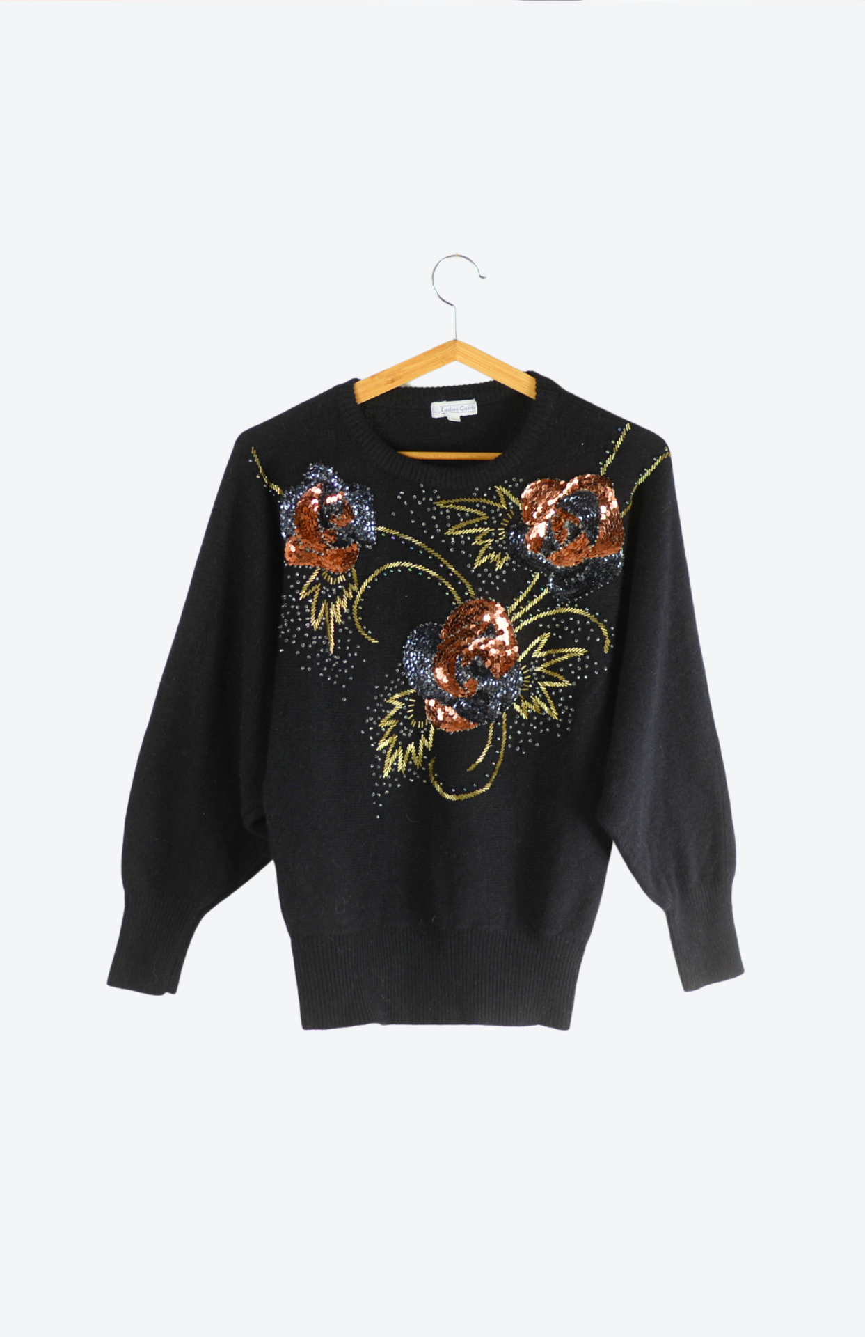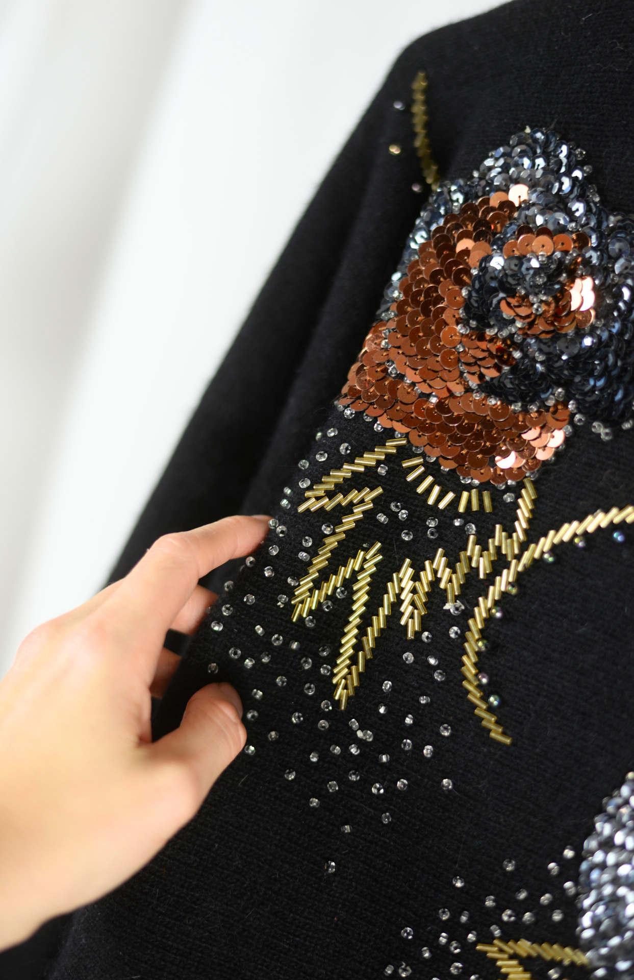 Krásný hebký vintage svetr z ovčí vlny a angory. Má jemně nabíraný rukáv. Zdobený výraznou výšivkou s korálky a flitrovými květy.