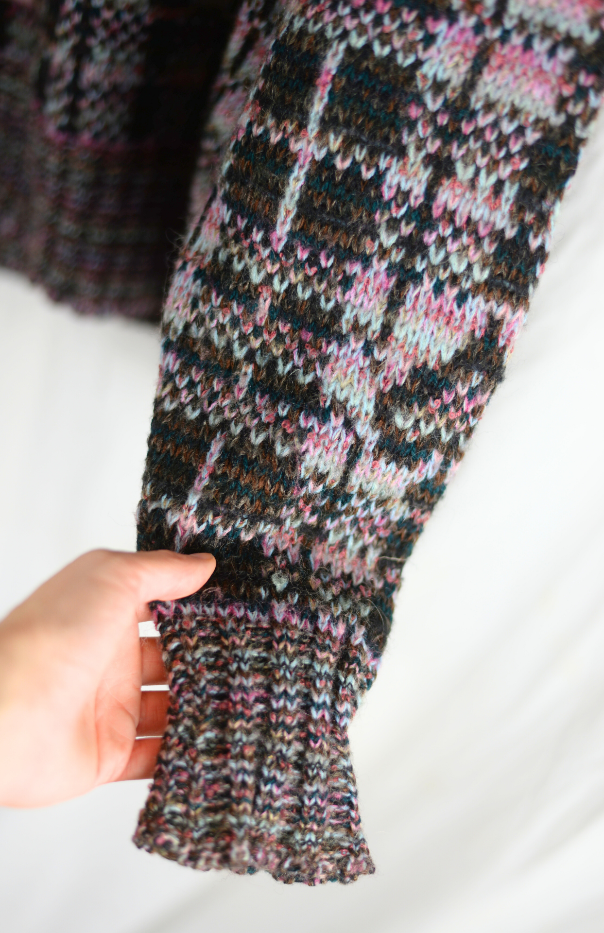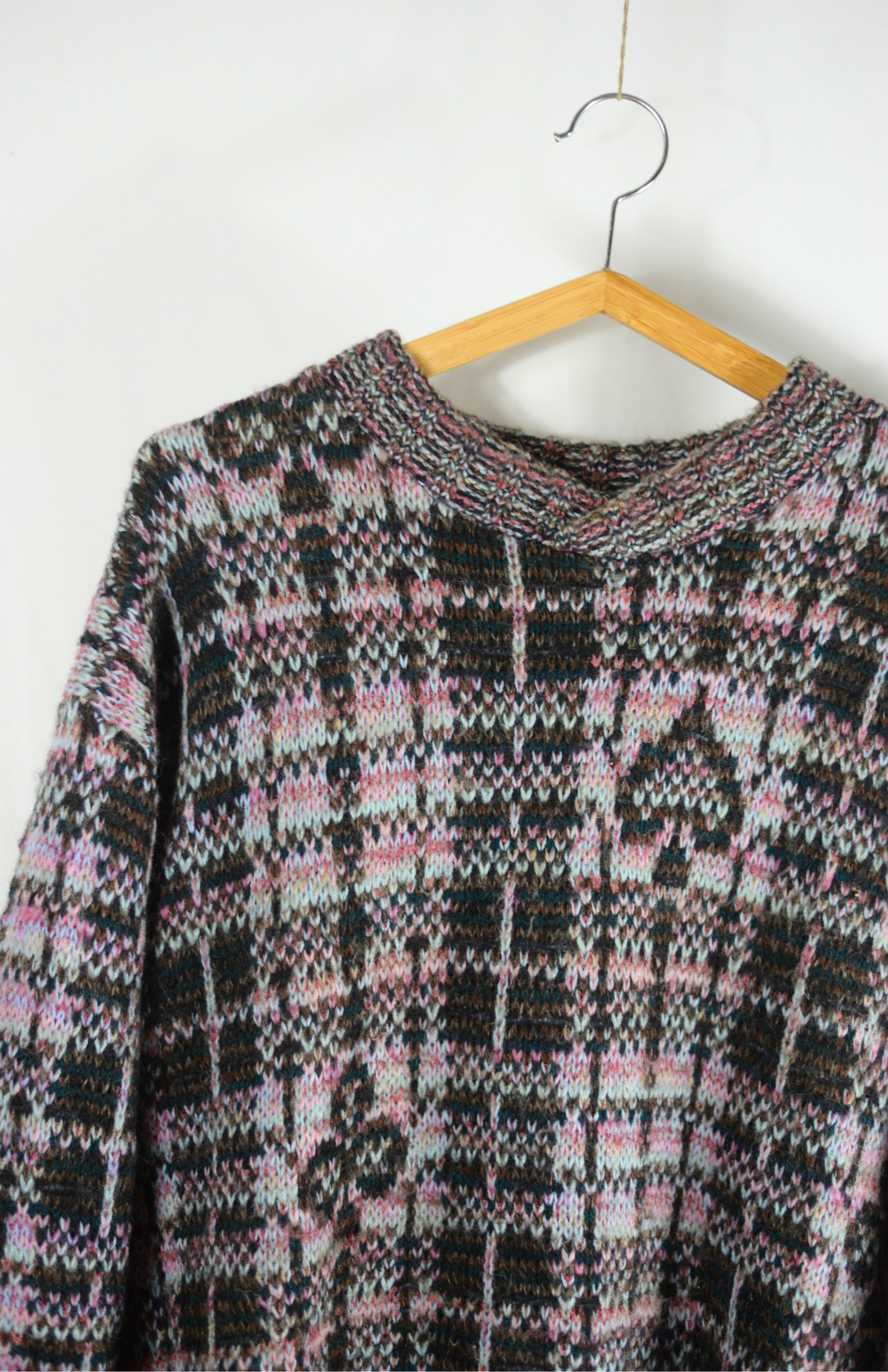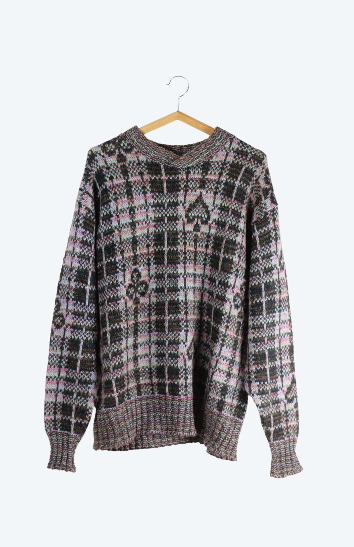 Vlněný vintage svetr s delším střihem. Má funky vzor s kostkou, píky a kříži.